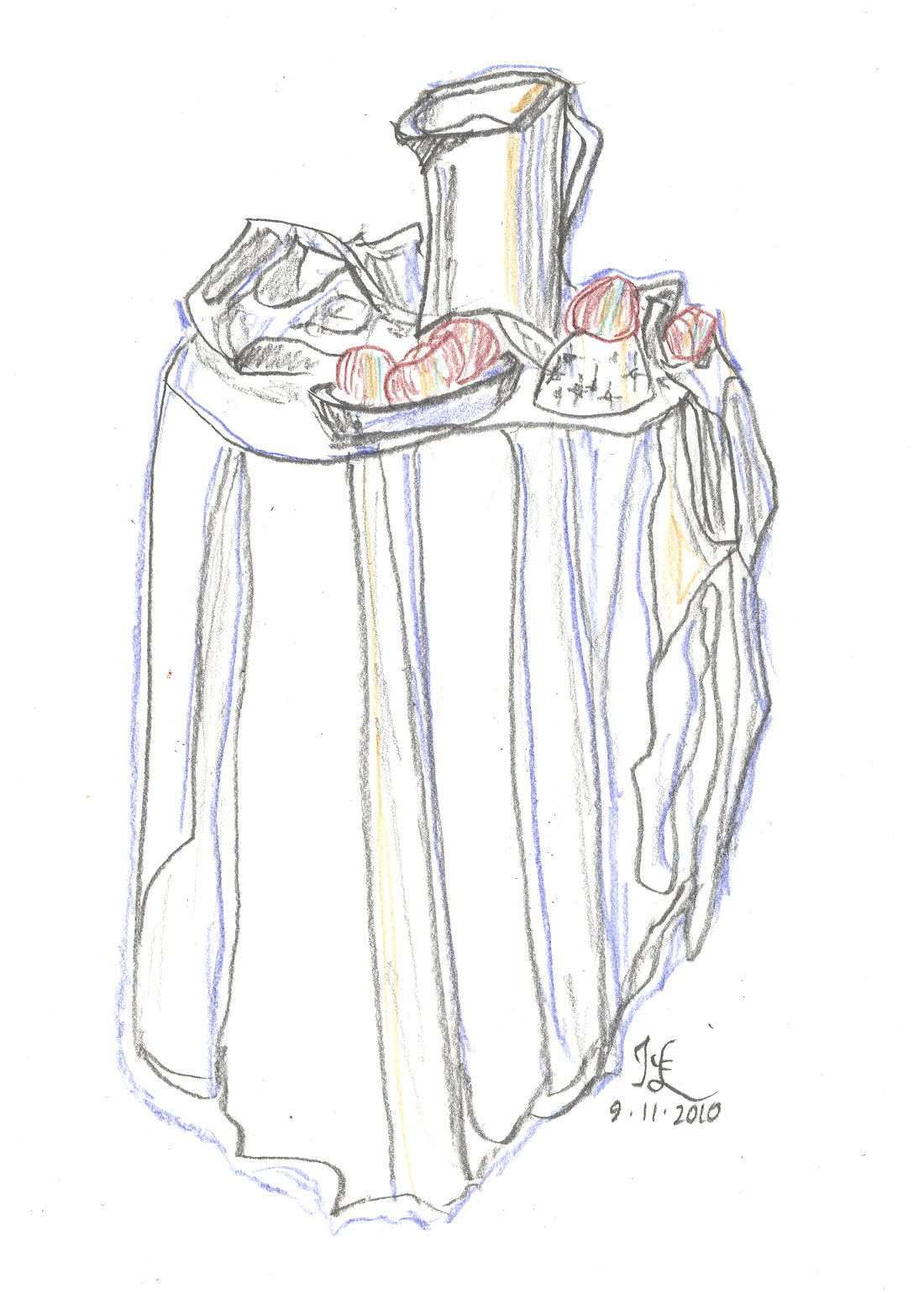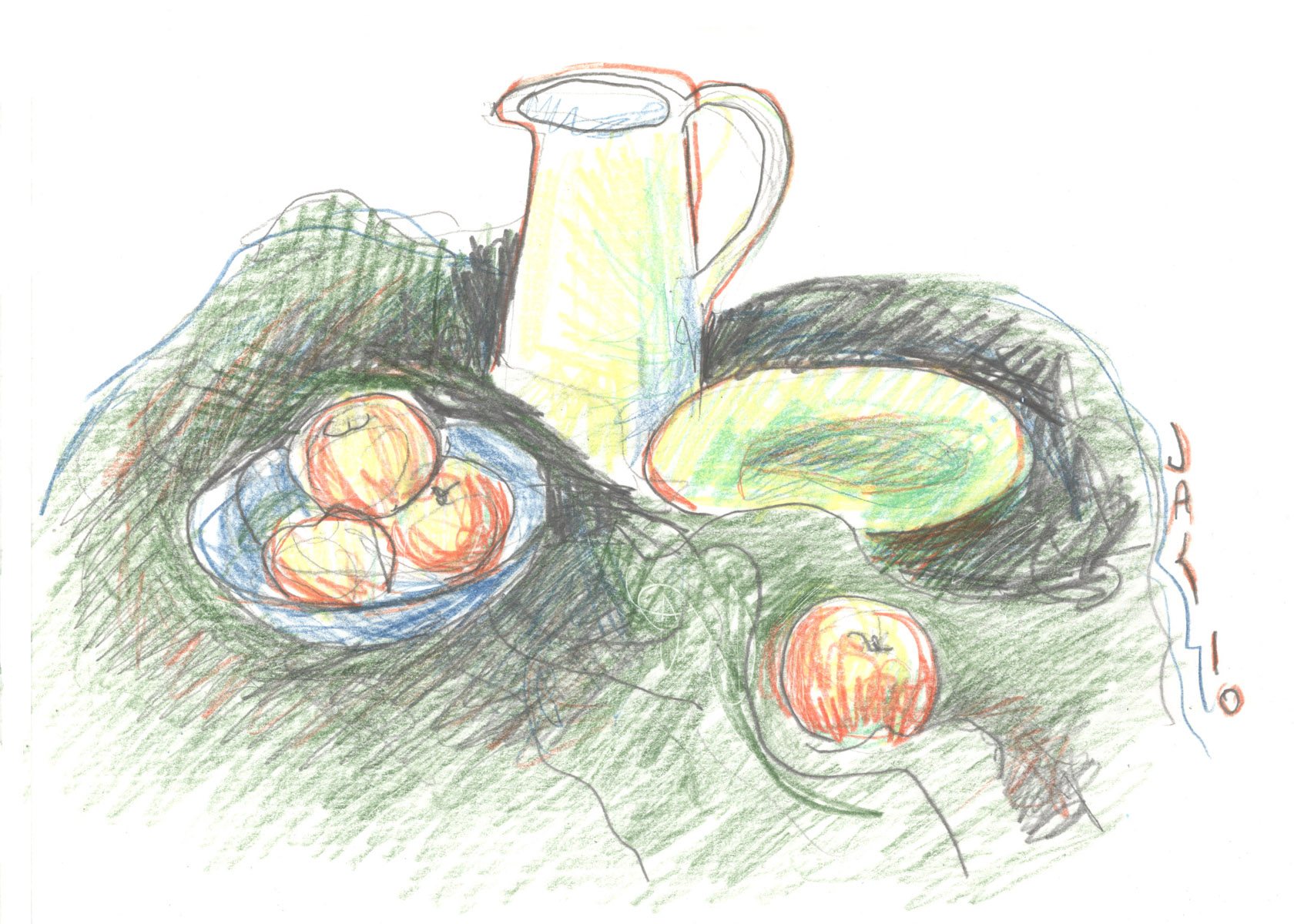 After seeing these pieces and a tasty lunch (Wild Mushroom, Spinach and Leek Tart with Fossil Creek Goat Cheese and Mozzarella served with Herb Garden Salad), I happened on a sketching room and got busy on a still life. I'd only brought graphic pencils and a moleskine, so I was glad they provided colored pencils and larger paper: |