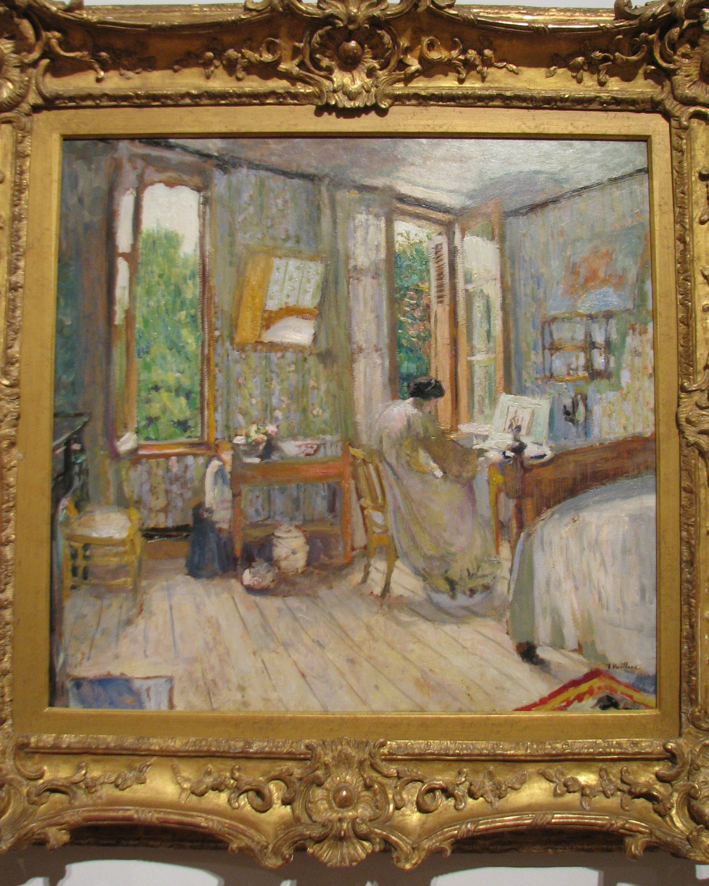 "Although he was well-acquainted with this woman, Vuillard has painted Lucy Hessel, the wife of his dealer, in an impersonal way. Figure and setting have equal weight and are inseparable in Vuillard's paintings. He was not concerned with the personality or psychological state of the sitter, perferring to paint from memory rather than direct observation. He once stated, "I don't paint portraits, I paint pictures of people in their homes."