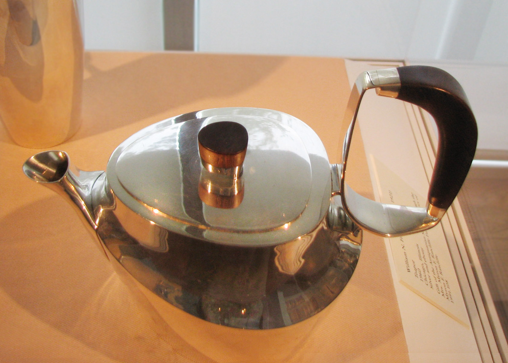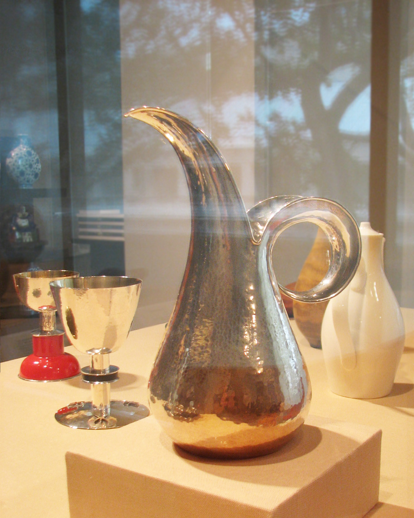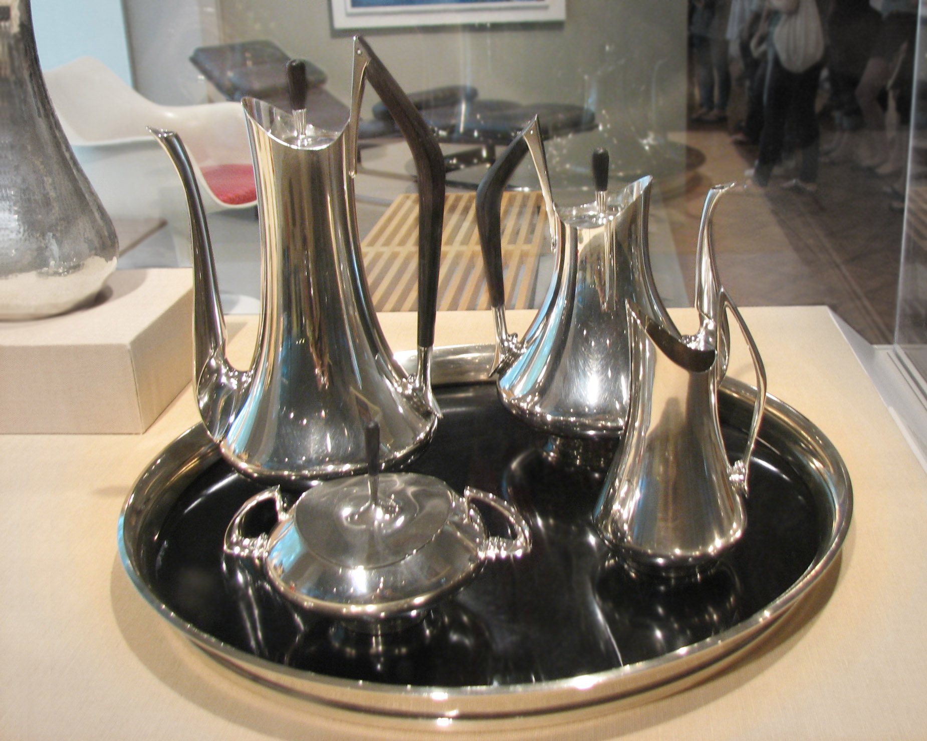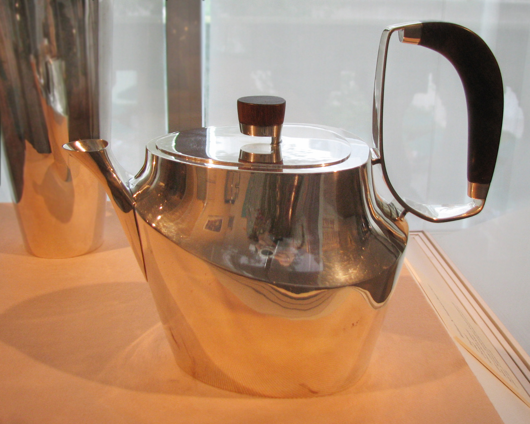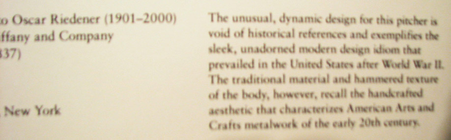 ![]() Info at Museum website: Pitcher, 1947/1956 Designed by Oscar Riedener American, born Switzerland, 1901-2000 Made by Tiffany & Company, American, founded 1837 Silver, 28.3 x 20.3 x 14 cm (11 1/8 x 8 x 5 1/2 in.) Marked: "Tiffany & Co./ Makers / Sterling Silver / 12673w" The Orbit Fund, 1999.292 |