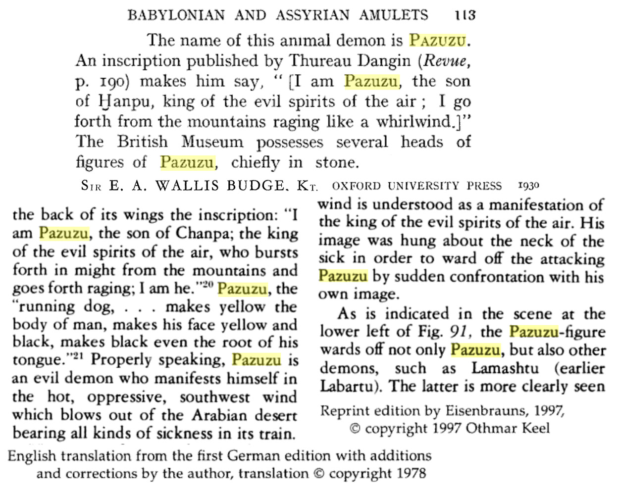 "An evil demon who manifests himself in the hot, oppressive, southwest wind...", I think we've seen him here in the southwest. We've certainly heard him. It's an election year, and I grow weary of all the political ads. But one could do worse than Pazuzu. He wasn't all bad. "His image was hung about the neck of the sick in order to ward off the attacking Pazuzu by sudden confrontation with his own image", "the Pazuzu-figure wards off not only Pazuzu, but other demons, such as Lamashtu..." (Othmar Keel, _The Symbolism of the Biblical World: Ancient Near Eastern Iconography_, page 79) Those other demons! What troubles could they be brewing up? Even worse? That's what we fear of the demon-politians! But maybe the least worst will ward off potential damages of the most worst!