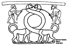 When Julia saw it, she said it reminded her of the twisty Serpopards on the Narmer palette. (line drawing detail).