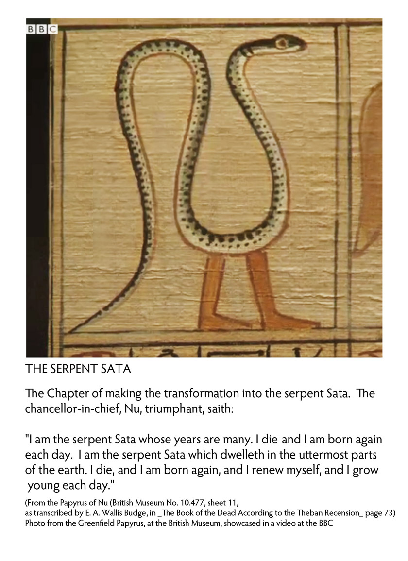 The British Museum is featuring the Book of the Dead in its latest exhibit. The Guardian has a feature on it. The BBC has a video featuring a tour by curator John H Taylor. The camera eye gives a good view, which will have to satisfy for those who can't go the museum. I took special note of a serpent with legs. Taylor describes the text below it, and I found it in Budge's translation. Taylor referred to the snake as 'Satis', if I heard right, but Budge refers to it as 'Sata': |