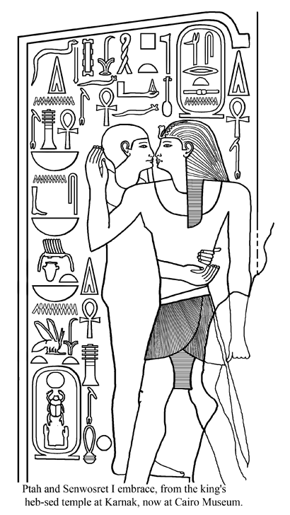 I was looking at _Chronicle of the Pharaohs_ by Peter Clayton, and found an unusual image of the god Ptah and King Senwosret I (aka Senusret I or Sesostris I) in a rather intimate embrace. From his heb-sed temple at Karnak, the relief is now at the Cairo Museum. I scanned the photo at 800dpi and made plans to trace it. In the meantime, I looked for more info. I wasn't able to find any other reference photo. All images