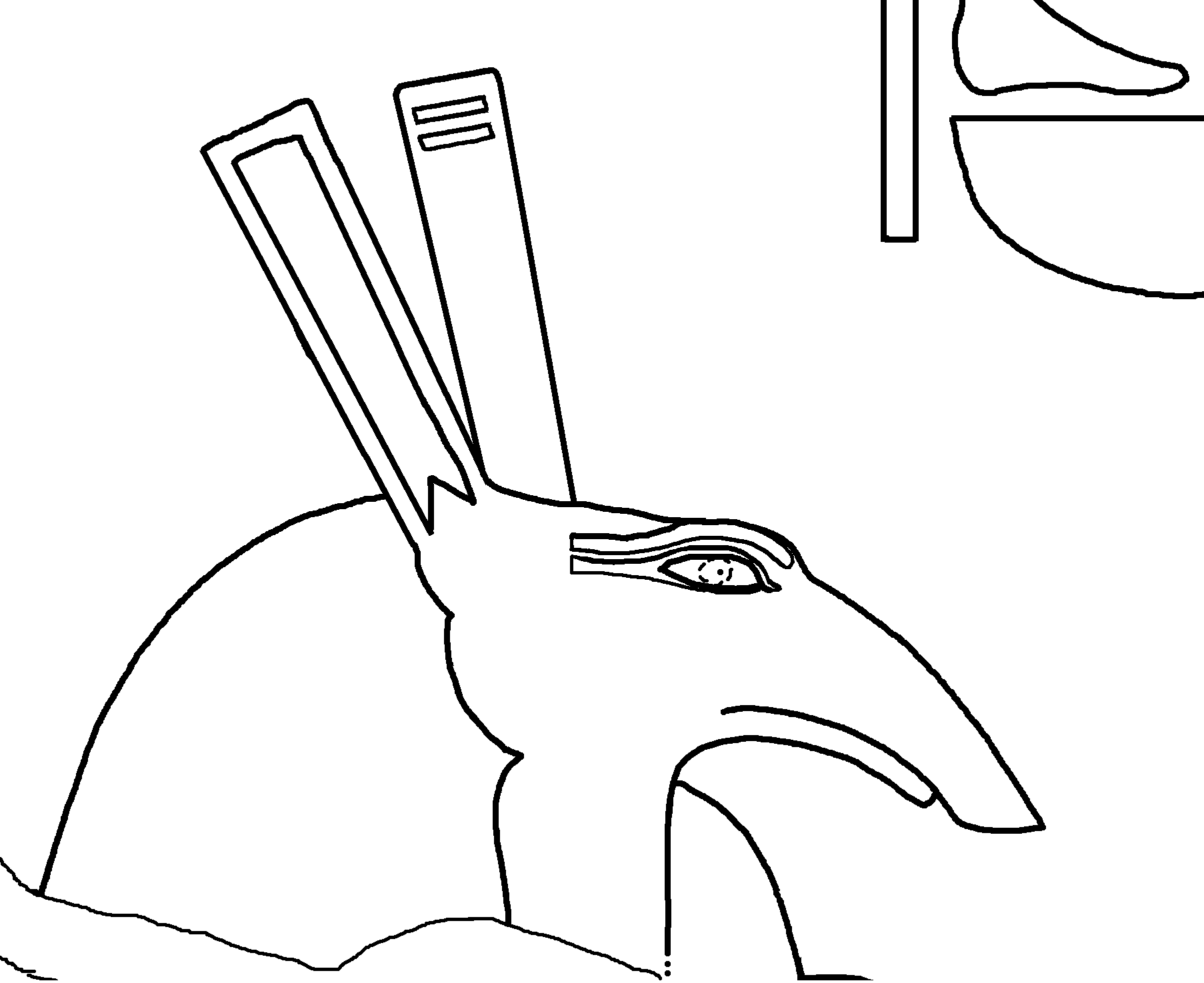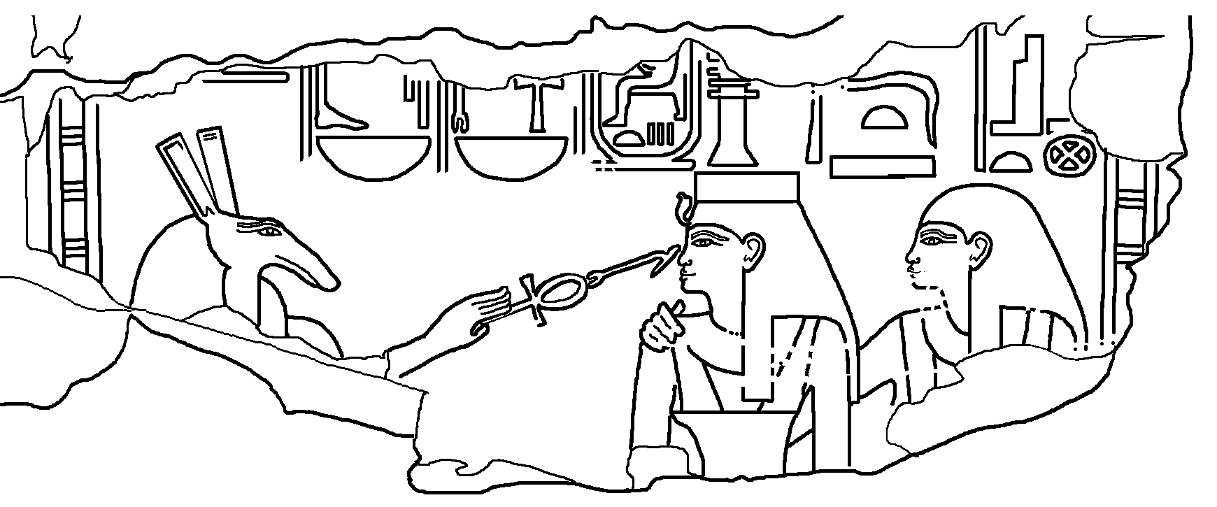 I'd first seen this scene at Alain Guilleux's "Une promenade en Egypte" website, and the descriptive text has been translated from his French. I attempted a trace, and then found a better photo from which to trace in Eugene Cruz-Uribe's article "Seth, God of Power and Might" which appears in the 2009 issue of Journal of the American Research Center. As I traced the close-up of Set's image, I thought, "Where have I seen those damage breaks before? They are following a line I've seen elsewhere." "Destroyed monument of Thutmose II", Hatshepsut was his wife! Yes, the close-up of Set is from the larger piece! Andrzej Cwiek explains that originally this scene was placed symmetrically, with a scene in which Thutmose II was being "crowned by Osiris and Isis" (Cwiek, “Fate of Seth in the Temple of Hatshepsut at Deir el-Bahari”, for Centre d'Archeologie Mediterraneenne de l'Academie Polanaise des Sciences, Etudes et Travaux XXII, 2008, page 56)