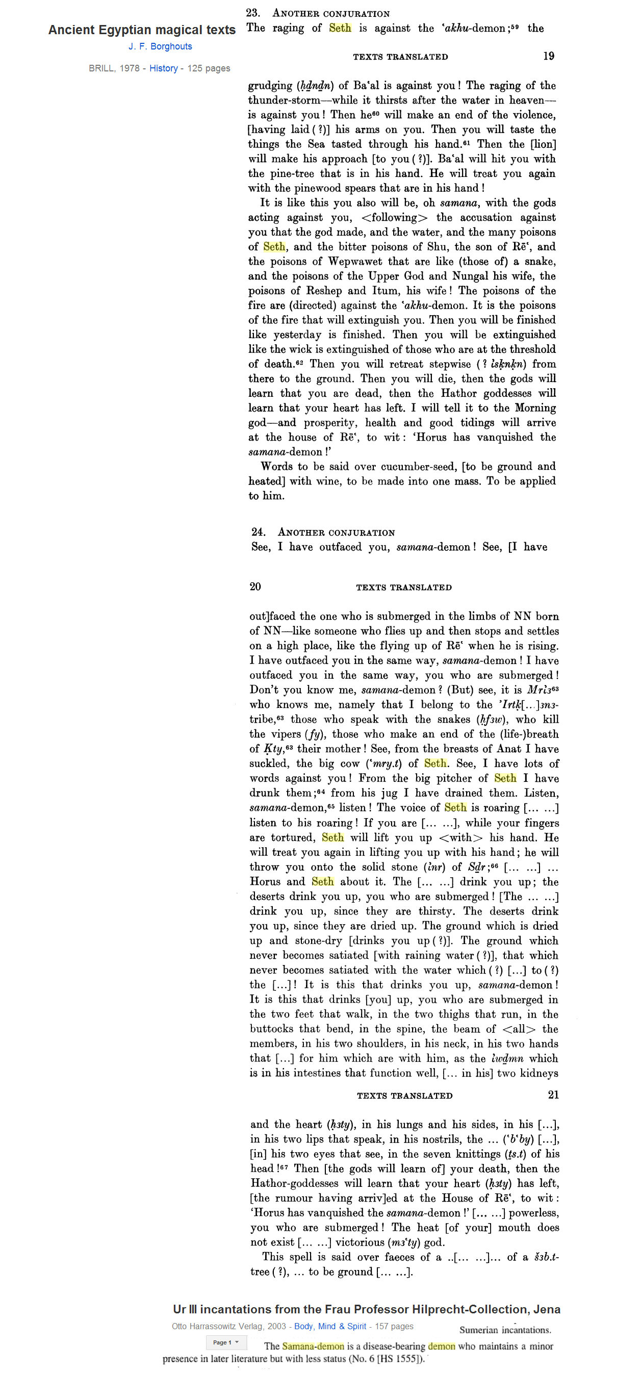 Two spells invoking Set's power against demons likely originated from the New Kingdom. The demon in question is the 'akhu-demon' or 'samana-demon', "a disease-bearing demon"11 from Sumeria. Simson Najovits explains, "Also during the New Kingdom (from c. 1550 BC), Egypt imported the West Asian mother goddesses Astarte and Anat, as well as a West Asian demon, the ahku-demon or samana-demon."12 I quote excerpts from the two spells:
