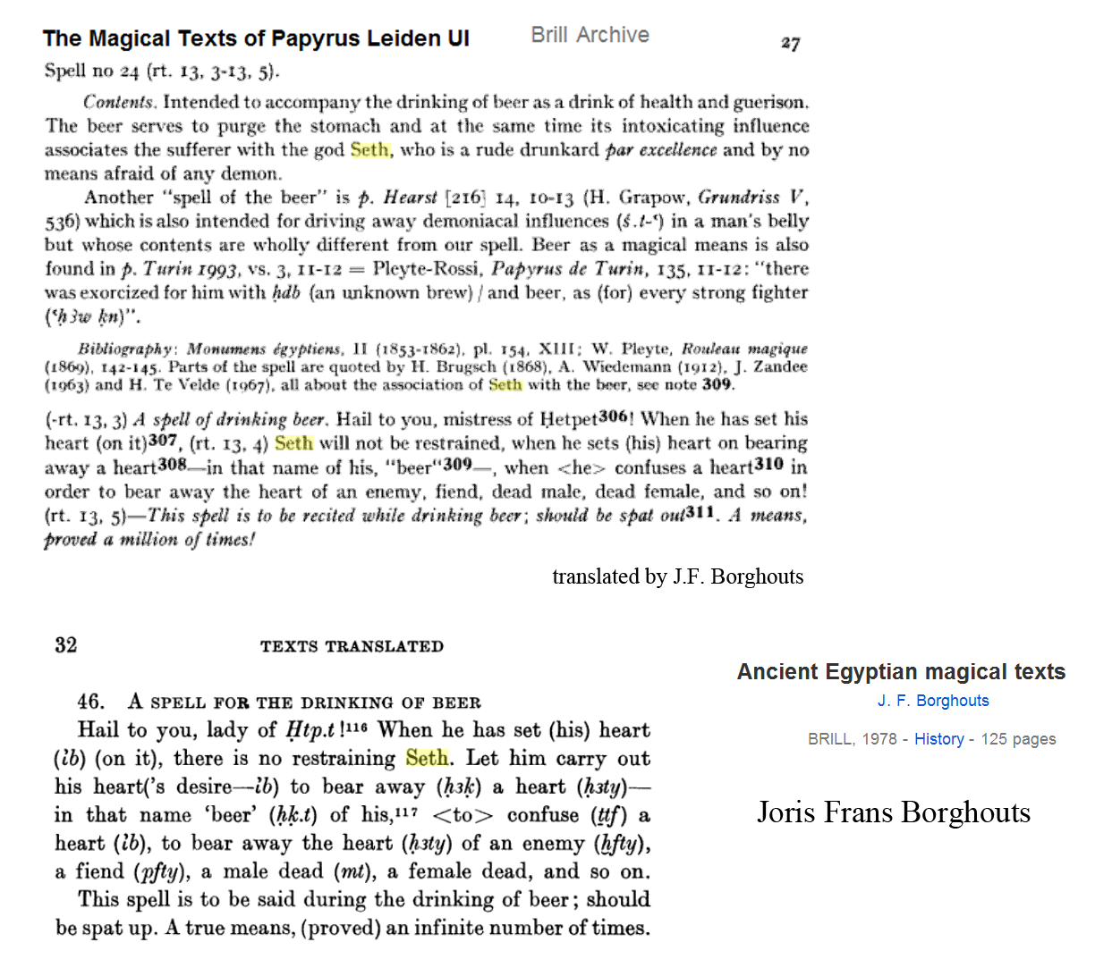 According to Griffith and Thompson, it is "the latest known papyrus written in the demotic script; most of the glosses are really Coptic transcriptions.1 Furthermore, "the writing is a strange jumble; the hieratic is inextricably though sparingly mixed with the demotic, a single word being often written partly in hieratic, partly in demotic."2 "The use of hieratic might be thought to indicate some antiquity where it occurs."3 Some sections are copied from earlier times. An ancient Egyptian ships' log, Papyrus Leiden I 350 verso, is certain to be from the time of Ramesses II, as it mentions "the regnal year 52".4 Jacobus Johannes Janssen asserts "that the letters were sent to prince Kha-emwese in his capacity as high priest of Ptah at Memphis and that the papyrus as a whole was intended to be a report to him." 5 Was it because Ramesses II's son Khaemwaset was widely regarded in later periods for his magical abilities that the scribe, possibly himself a magician, included it? Anyway, back to the spells of uncertain vintage. The first spell is meant to be incited while drinking beer, to chase away demons. Set expresses himself in the intoxicating power of the beer: