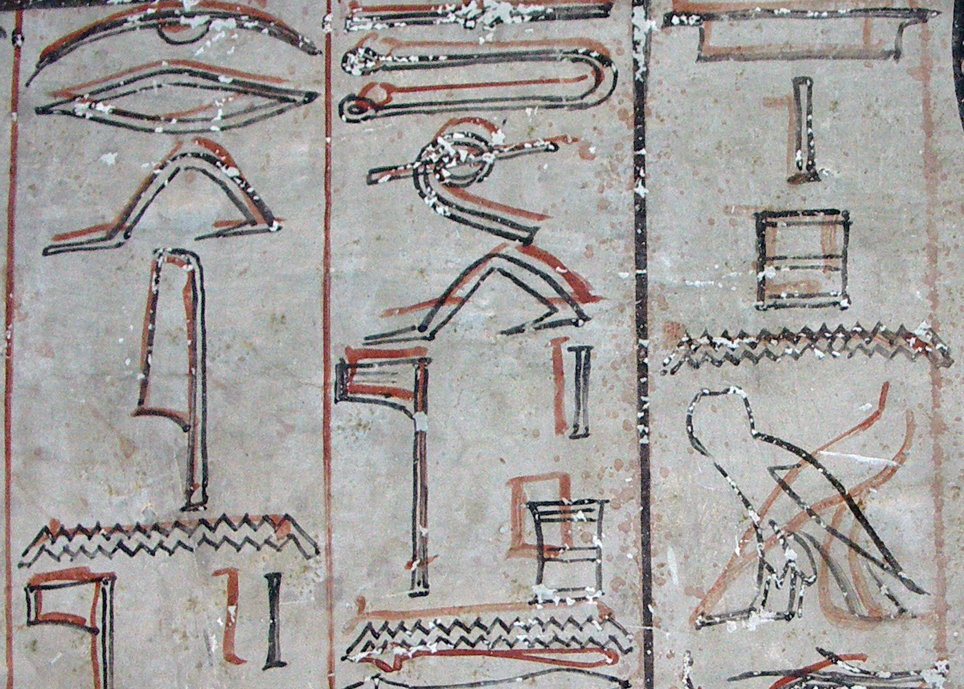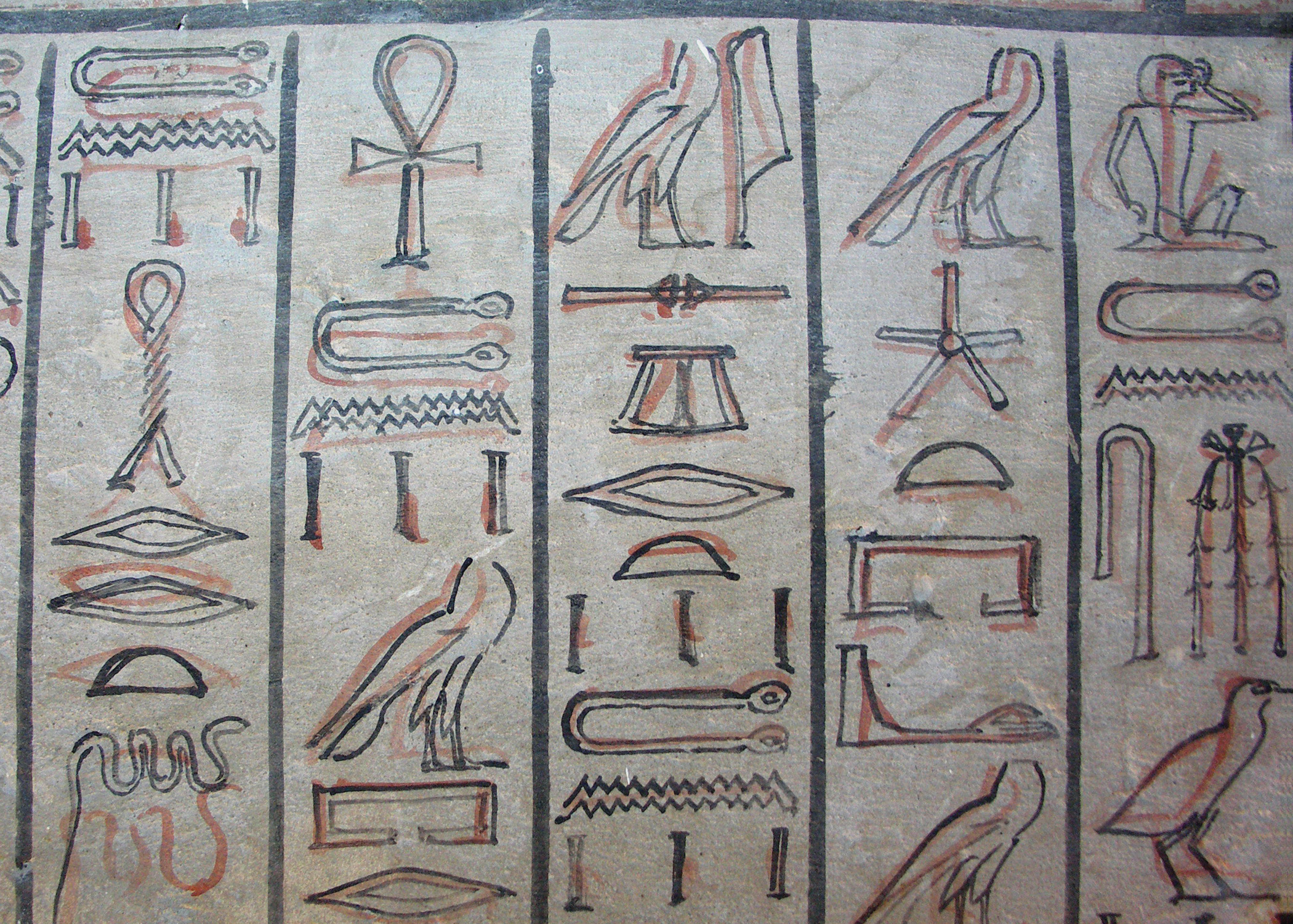 At first I thought she was Hathor, on account of the headdress, but the glyphs to the left identify her as Isis (aka Aset)