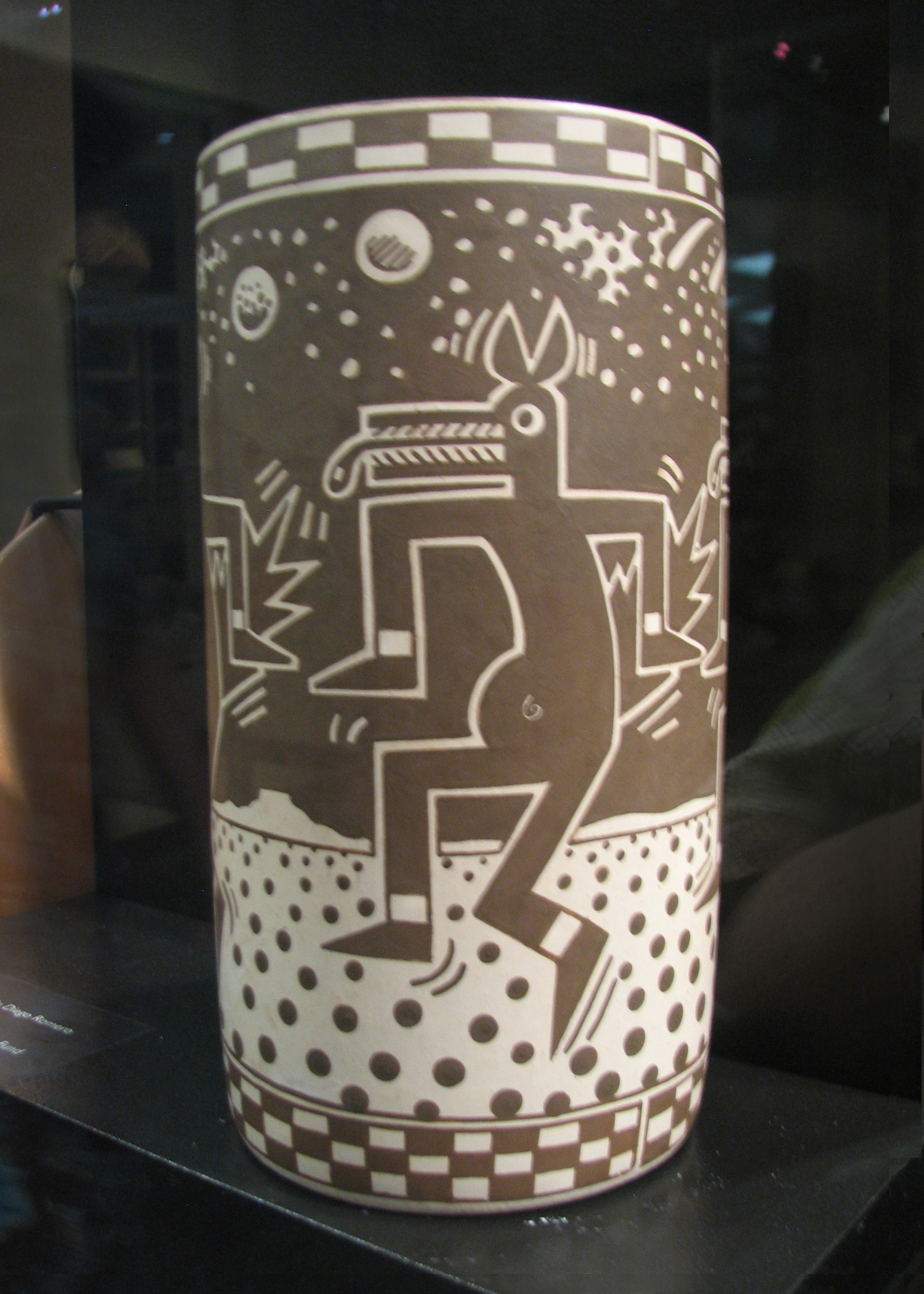 | Most fascinating is what the young potters are doing. One curator in the movie that played in one corner explained to understand the modern pots, he had to study the whole 2000 year history which led up to their creation. I especially like the pots by Diego Romero, who seems a little influenced by Keith Haring. But he takes it into a whole new level. All very exciting! |