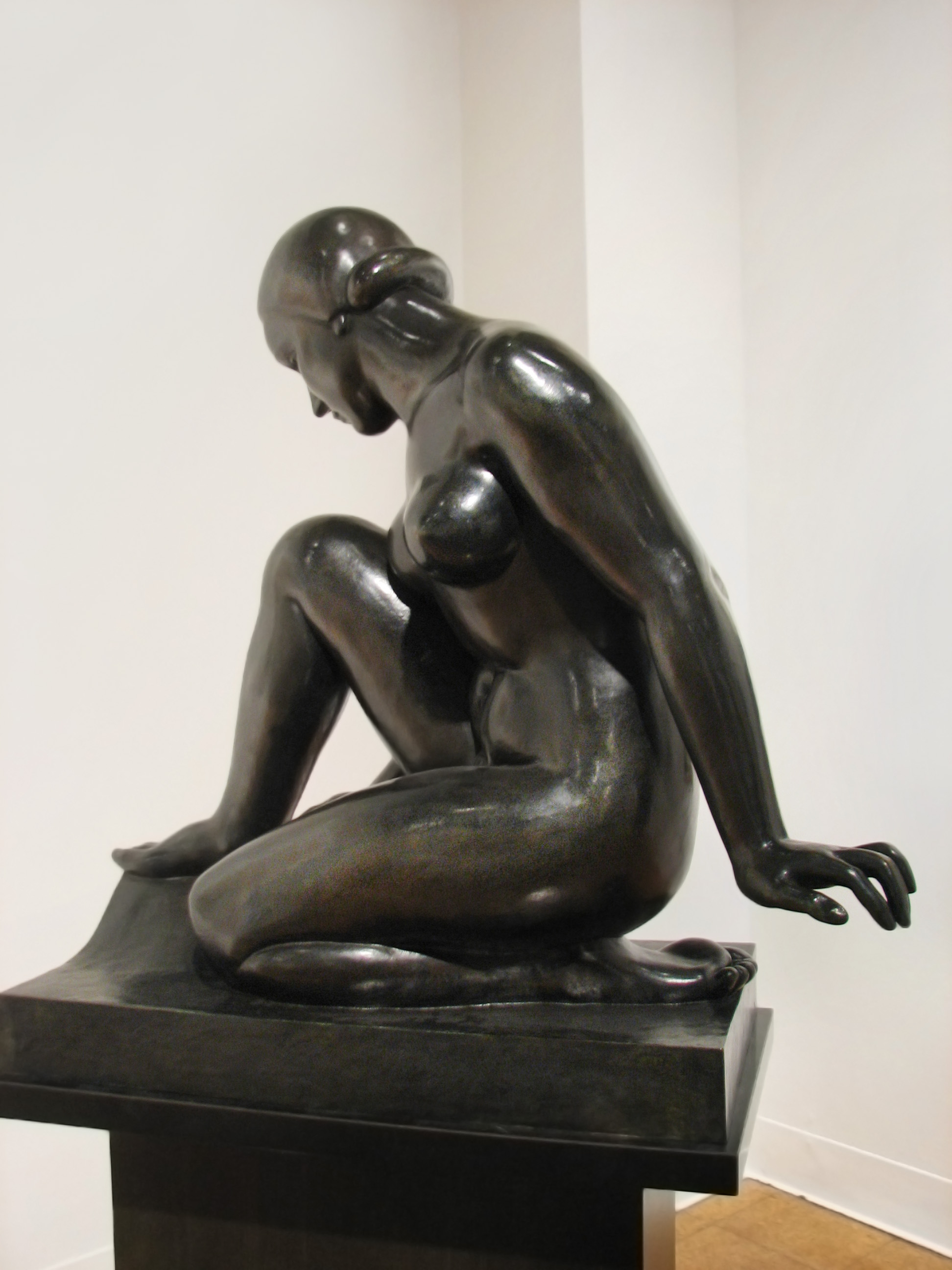 Still, I like the smooth quickness of his lines. As the museum's info card says, "Lachaise's portrait of his wife reminds us that drawing can be fun and expressive. Using his arm, not his wrist, Lachaise employs a quick gestural movement to convey energetic line with lyricism and flair." He also liked to portray his wife in bronze, as seen at the Met museum. I like the peaceful qualities of this sculpture by Maillol: |