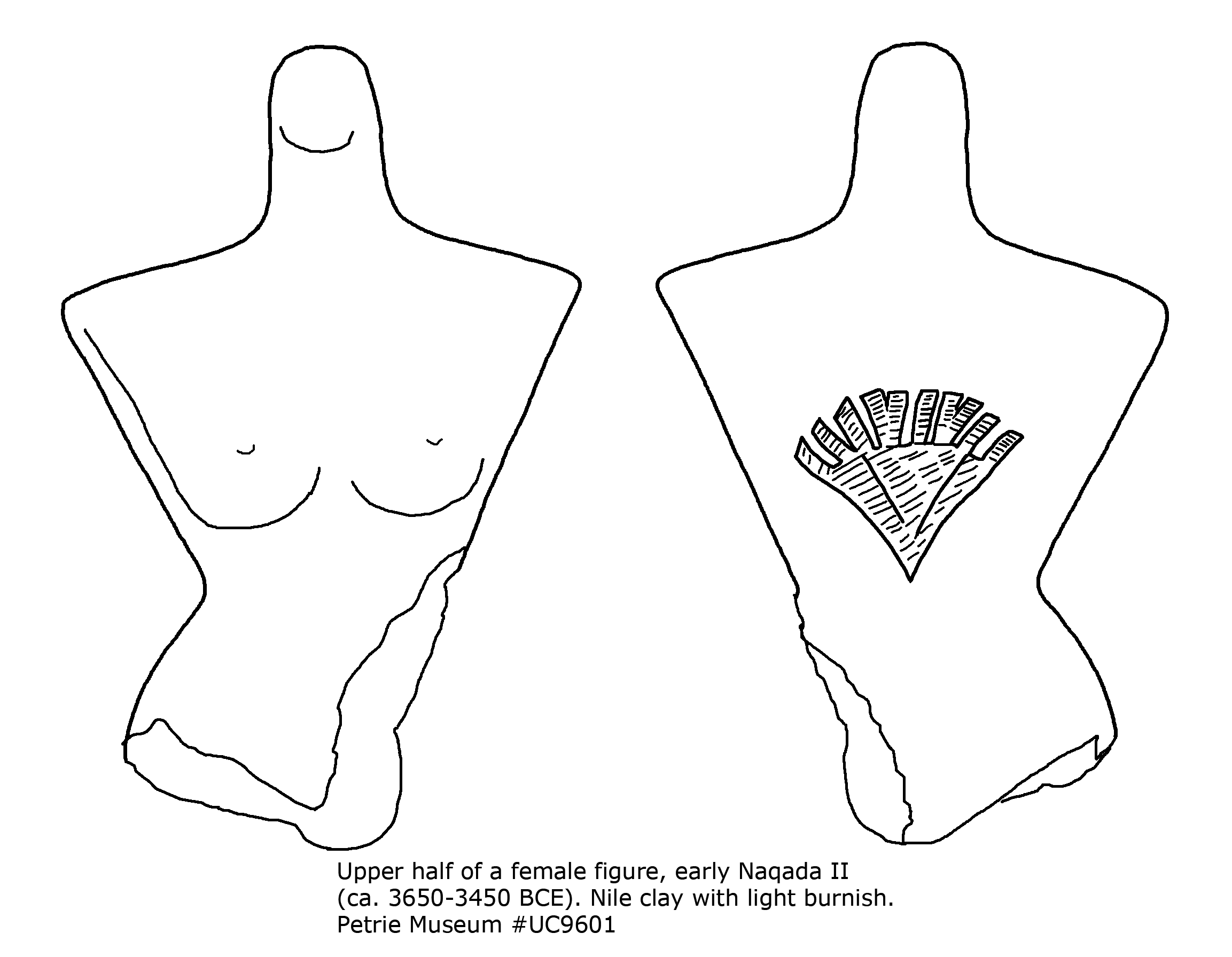 As we read in Wilkinson's Complete Gods and Goddesses of Ancient Egypt, "Sia was the personification of perception and could be said to be the equivalent of the 'heart' or mind of the god Ptah which underlay creation in the Memphite theology"3 This 'consuming flame' could be the primal power enabling creation. Although EA 55596 strongly resembles a human torso, I'd like to share another ancient Egyptian piece, showing a back that is very similar to the one in the Bolton Amarna figure. The torso of the Bolton piece may not be so readily visible. However, it resembles the back of an upper half of a female figure from the early Naqada II period which also has some unique decoration on its back. The shapely front is undeniably a human depiction. Possibly the decoration on its back represents a blossoming, the type of flourishing that occurs when power is drawn up from the root and rises. ![]() (Petrie Museum UC9601, traced from _Dawn of Egyptian Art_ exhibition catalogue photos, page 102