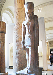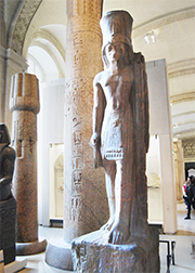 This "standard-bearer statue of the king in the Louvre (A. 24)" originally had a crown, part of which is in the Cairo museum. "In reality, the composite crown was similar to that of the companion statue in Turin (inv. no. 1383)" (Hourig Sourouzian, "Conservation of Statuary", Egyptology at the Dawn of the Twenty-first Century, Vol. 3., edited by Zahi Abass Hawass and Lyla Pinch Brock (American Univ in Cairo Press, 2003), page 411)