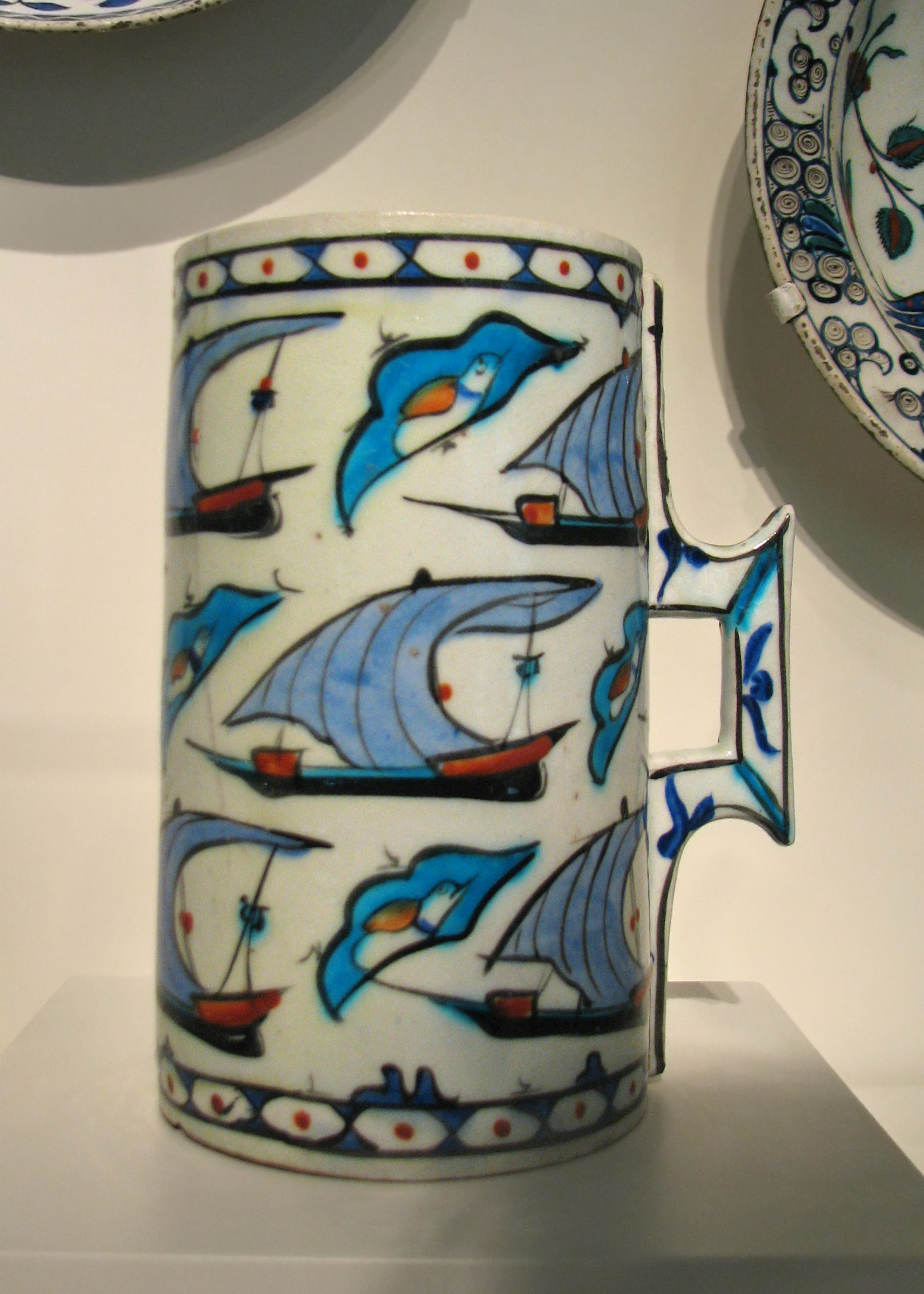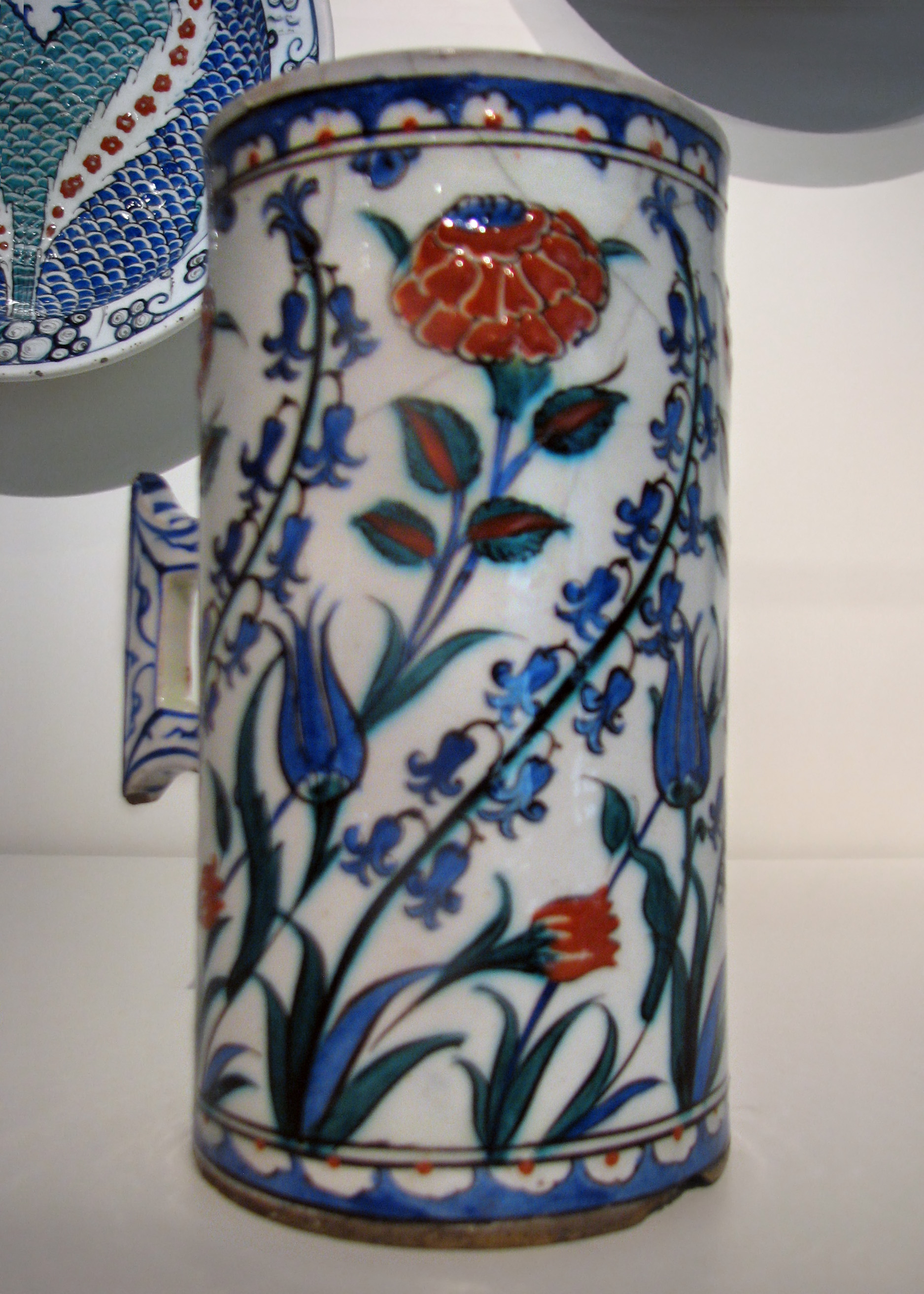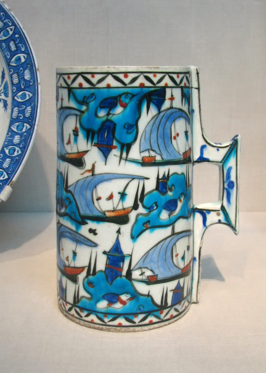 ![]() Tankard Turkey, Iznik, Ottoman period, late 16th century Composite body painted under glaze Dimensions: H: 21.1 W: 16.4 D: 12.3 cm Purchase, Freer Gallery F1968.68 Info card |