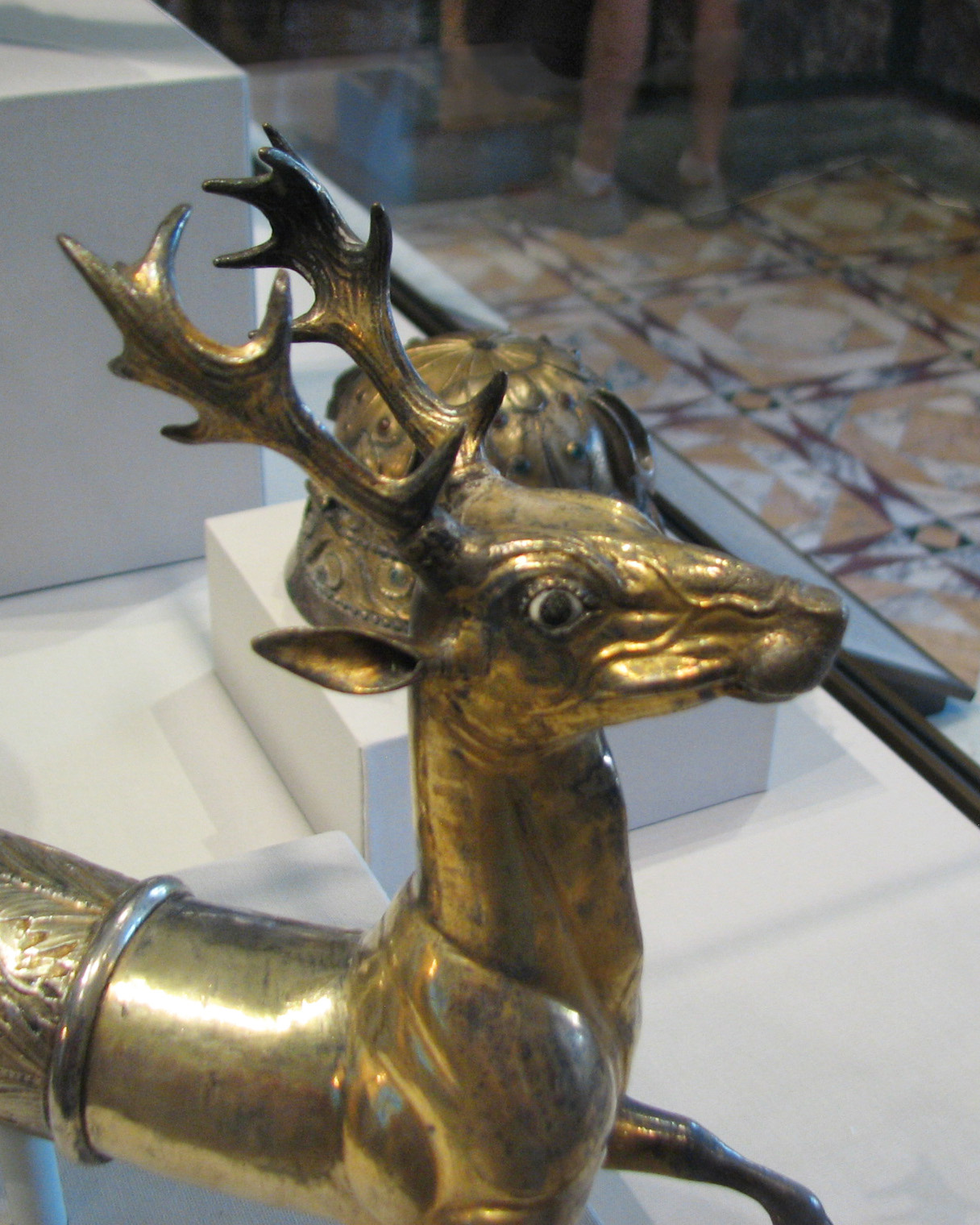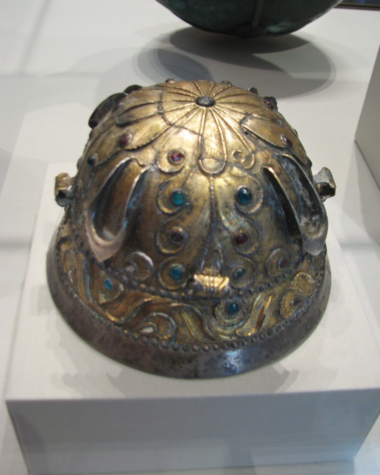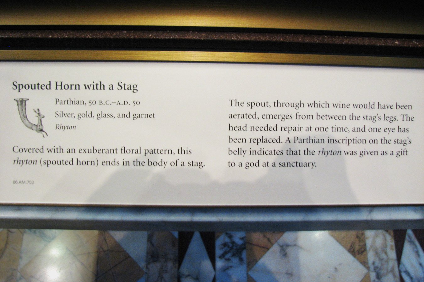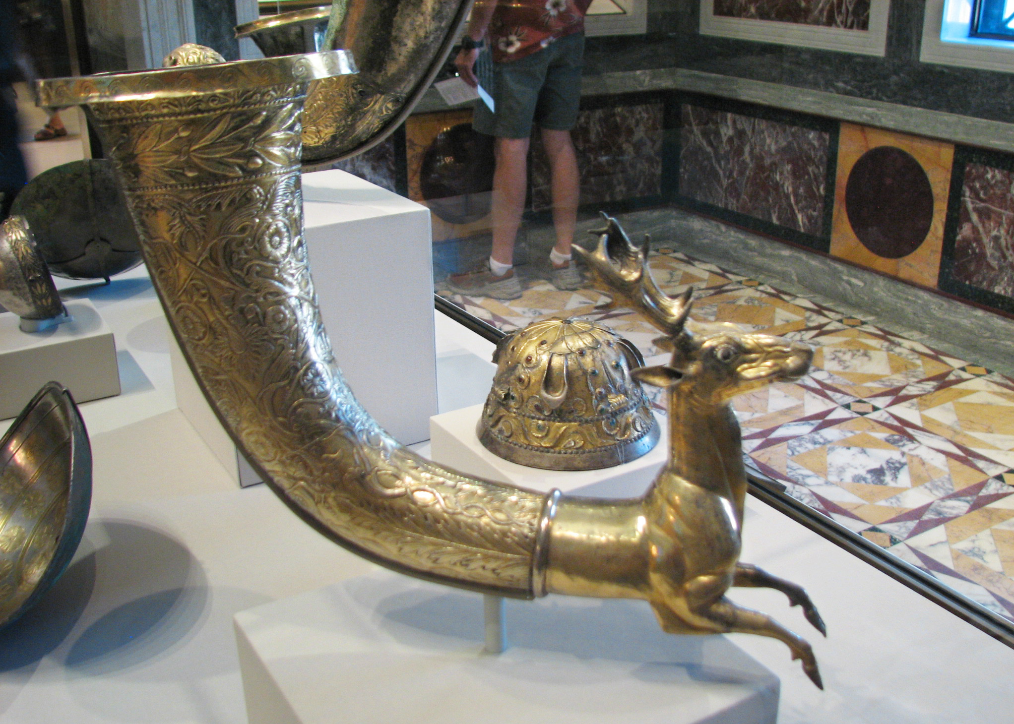 ![]() Spouted Horn with a Stag Eastern Seleucid Empire, Parthian, about 50 B.C.E - C.E. 50 Gilt silver, garnet, glass Dimensions: H: 27.5 x Diam. (rim): 12.7 x L: 46 cm (10 13/16 x 5 x 18 1/8 in.) Getty Museum, Object Number: 86.AM.753 From Info card: "Covered with an exuberant floral pattern, this rhyton (spouted horn) ends in the body of a stag. The spout, through which wine would have been aerated, emerged from between the stag's legs. The head needed repair at one time, and one eye has been replaced. A Parthian inscription on the stag's belly indicates that the rhyton was given as a gift to a god at a sanctuary." From Info card: PARTHIAN SILVER VESSELS "The cups, bowls, and drinking horns displayed in this case are associated by their style with the kingdom of Parthia. This region of the Middle East was ruled by the Greeks after Alexander the Great's conquests in the 330s and 320s B.C. Greek cultural influence endured when Bactria (present day Afghanistan) came under the rule of a semi-nomadic groups called the Parni (or Parthians). In the second century B.C. their territories expanded to include much of Mesopotamia as well." |