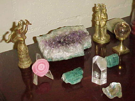 The above two shelves in our good bookcase are composed of items mostly from Julia's statuary. The top shelf is more purely Greco-Roman, except for the two urns in the back. I had the urns thusly placed in old apartment, and it seems fitting to keep them there. Greek Isis is at the center, with a caryatid to her left and Athena to her right. Our friends Nick and Shirley gifted us with the caraytid and Athena when they visited Greece one year. Isis-Fortuna is to her right, followed by a horse and rider we got at the Getty Villa. Julia thinks it's Etruscan. To the left of the carytid, is an Amazon warrior I got back in 2003. Julia thinks this derives from liminal people of Thrace or Scythia. The little triple Hekate also has a Greek connection. (I have a closer view of the Amazon archer and Hekate, in pre-move chaos). I've introduced a brass replica of Tutankhamun's throne to the Greco-Roman mix in the second shelf. No, it doesn't really belong, except that Cybele is seated on a throne. Also Tut's throne features lion heads which echo Cybele's lions. Julia had painted that statue, made by JBL statues of Ganges river clay, and it had travelled all the way from Maryland. The brass plate behind Cybele has the Chinese characters for "longevity" on it. If memory serves me correctly, I bought that when I was with Laura, early in our relationship, at a little store in a mall that sold Oriental themed items. The Minoan Atana Potiniye, (at the right, holding the snakes), relates distantly to the Greco Roman mix, distantly in time, but directly in location. She is from the proto Greek islands, 2000 BCE. As Julia explained, she is "a very early Athena, a thousand years before Athena". (I have a photo of Atana and Hekate from 2001, just after we moved to Yuma.) The bell is there simply to echo the brass of Atana, and also the shape of her skirt. |