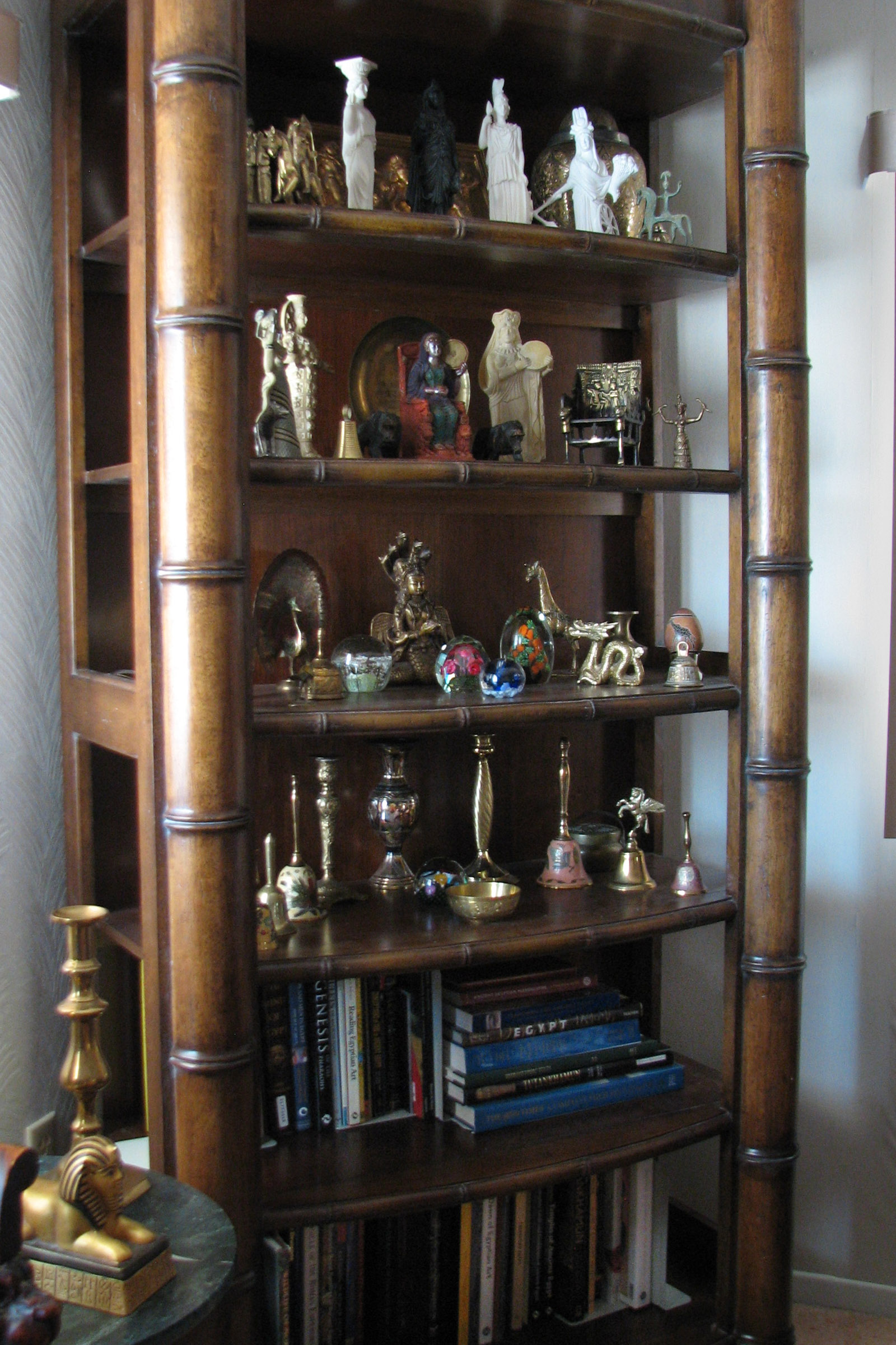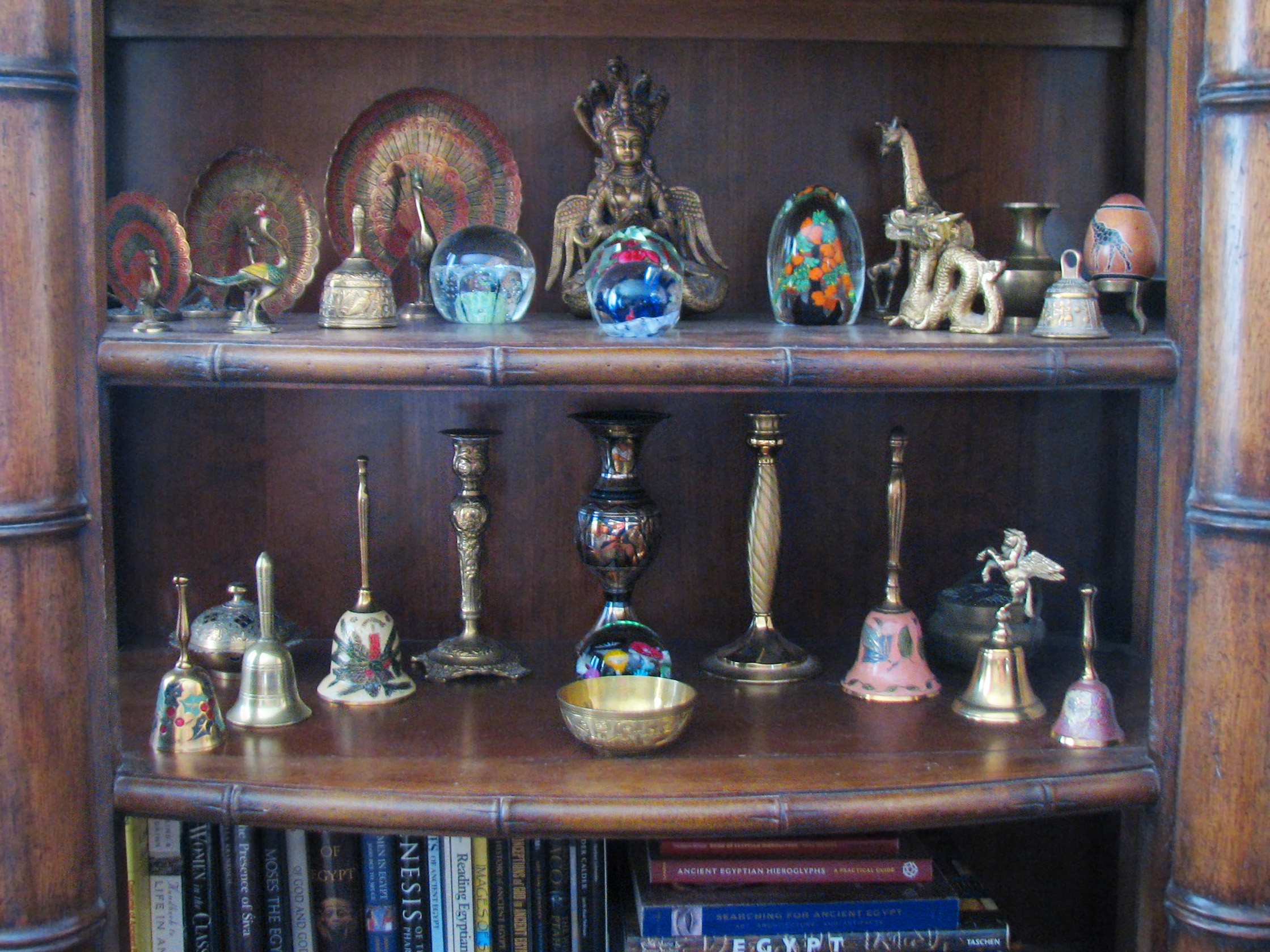 The third and fourth shelves in our good bookcase are all my things. The paperweights came from my father, who had collected them. The bells are from my mother's estate. The mother and daughter giraffes in the back are from my mother's things, as is the little peacock. I bought the three peacocks with plumage extended at an antique store here in Yuma. The egg with the giraffe was a gift from our friends. The vase at lower shelf center came from Egypt. The small bowl was an Ebay purchase. It has Egyptian scenes carved into it, but I don't know if it was made in Egypt. The candlestick on the left was from my mother's things. I got the candlestick on the right from a 'Partylite' sale some friends of ours had several years ago. It was named 'Lexington' I bought the statue of Naga Kanya back in 2005.