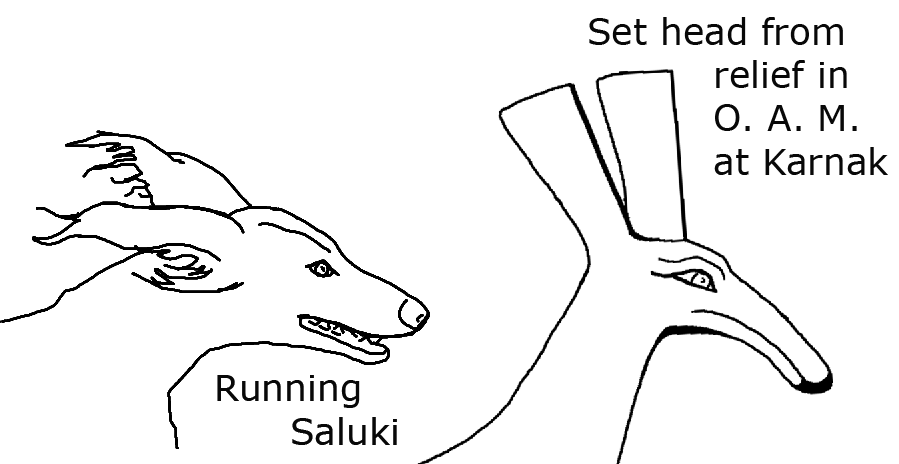 It is easy to see the classic Set animal's body has canine origins. But what of those flying ears? I found a Saluki in full out run and traced it. I then compared that head to some Set glyphs.