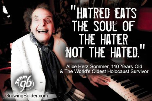 "Hatred eats the soul of the hater, not the hated." - Alice Herz-Sommer, 110 years old & the world's oldest holocaust survivor