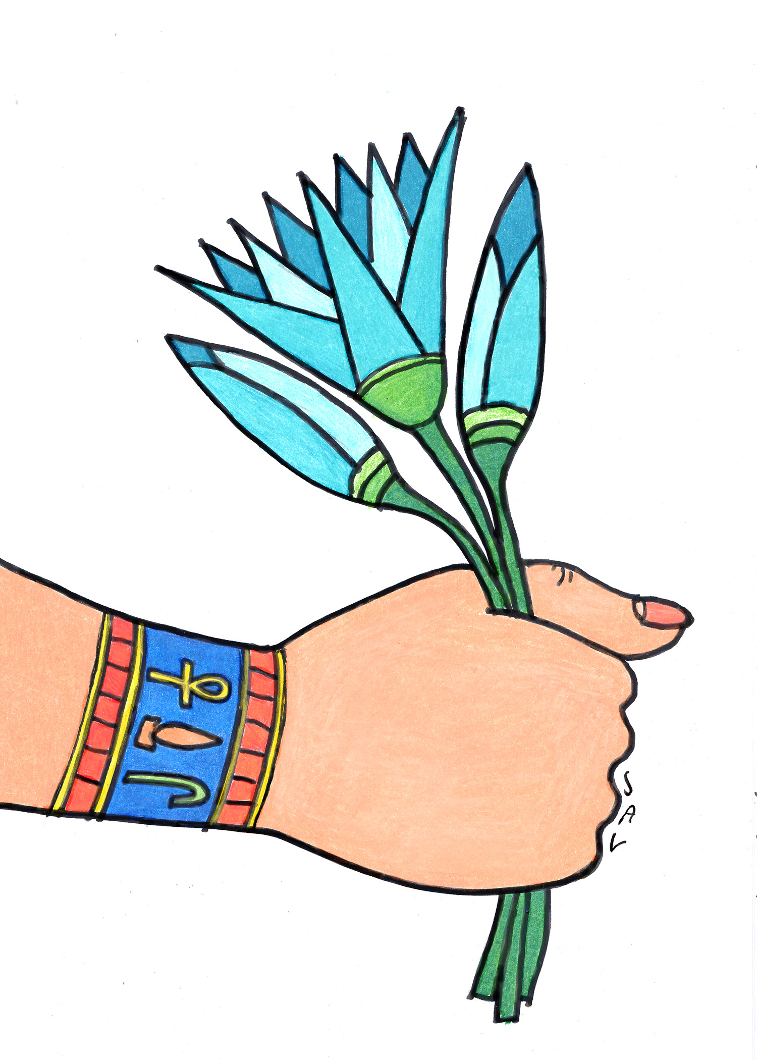 I got inspired by Uret, Ramose's sister, a lily holder in Ramose's tomb, TT55 and created a crop from which to draw. The blue lily, sometimes called a 'lotus', but more accurately known as Blue Egyptian water lily (Nymphaea caerulea), is a symbol of rebirth and regeneration. It is sweetly scented, and Uret would be inhaling its fragrance deeply, thereby rejuvenating herself. While Uret's bracelet is plain, I gave my lily holder a decorated bracelet, decorated with the hieroglyphs for "Ankh Udja Seneb", or Ankh: "Life", Udja (or 'wedja'): "to be whole/intact"/"Endurance" (aka = "Prosperity") and Seneb: "Health". Thus, I'm conveying the lily holder is "Flourishing". |