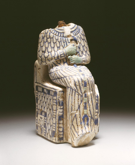 The Penn Museum curator describes this. "Brilliantly colored and designed as part of a larger statue, this figurine was likely set up in a shrine or temple at Memphis. The god Ptah appears seated on a low-back throne, inscribed with the standard epithets or descriptions of the deity. Holding a was-scepter, formed from the hieroglyph meaning “dominion,” he wears a special feathered garment over his usual mummiform costume – a feature found on a few other representations of Ptah from the reigns of Amenhotep III and Tutankhamun. This small masterpiece attests to the skill of the workers in ancient faience workshops." The book offers more info, "Two vertical columns on the dorsal pillar, broken at the top, can be reconstructed to read: '[Ptah, lord of truth], great of strength, [upon his great throne;, beneficent, he who gives birth to crafts.' These are standard epithets of Ptah, duplicated on contemporary petition stelae left by private individuals in his temple precinct at Memphis." (Searching for Ancient Egypt, page 48) In addition to the feathered Ptah at Penn, the Leiden museum also has a faience feathered Ptah: