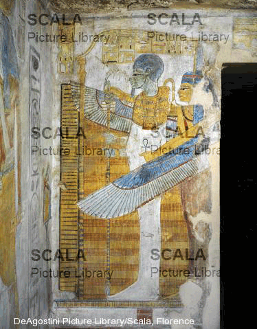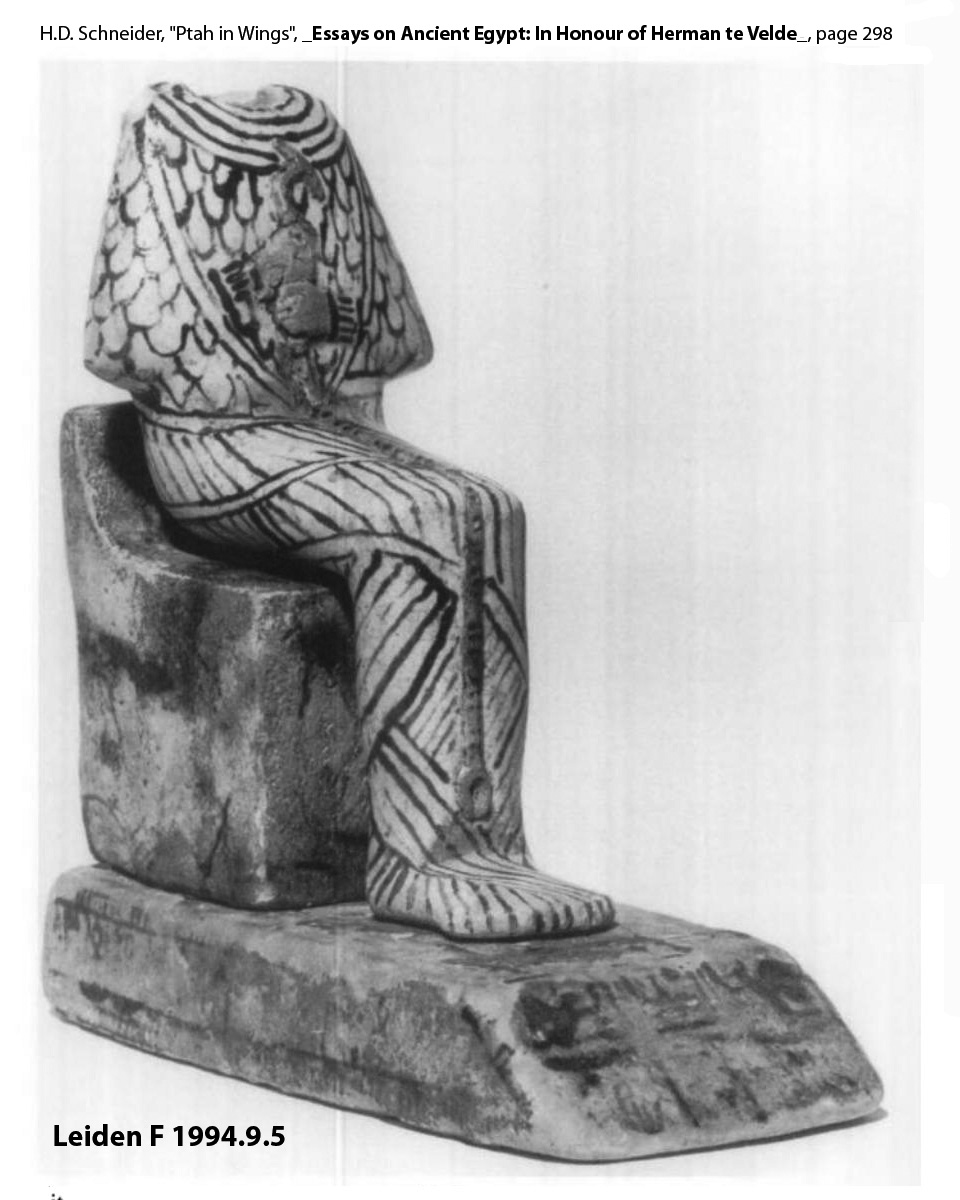 Sadly, still headless, but at least he's got his feet and the Ma'at plinth, or dais, which "is generally assumed to derive from the hieroglyph for ma'at, universal order. [... And] Ptah is rarely without it." (H.D. Schneider, "Ptah in Wings", _Essays on Ancient Egypt: In Honour of Herman te Velde_, edited by Jacobus Van Dijk, (STYX Publications, Groningen 1997) page 29) Schneider says, "When compiling an iconographical interpretation of the manifestion of Ptah in wings, a scene in the tomb of Queen Tausert must not be omitted. This represention shows a standing figure of Ptah, called 'Lord of Ma'at, King of the Two Lands, Gracious of Countenance, He who is on (his) great Throne' in the accompanying inscription, being enveloped by the wings of the goddess Ma'at standing behind him. The pictorial and written material give rise to the assumption that the wings of the garment of the Leiden Ptah and of the Ptah figure in the burial equipment of Tutankhamun are none other than those of the goddess Ma'at. The winged garment is a materialization of the indissoluble cohesion between Ptah the Lord of Ma'at and this goddess." (Schneider, page 297)