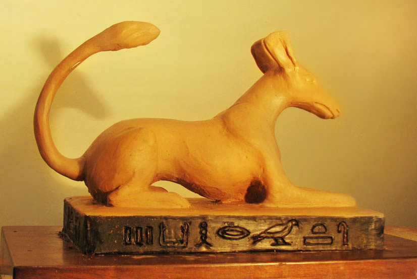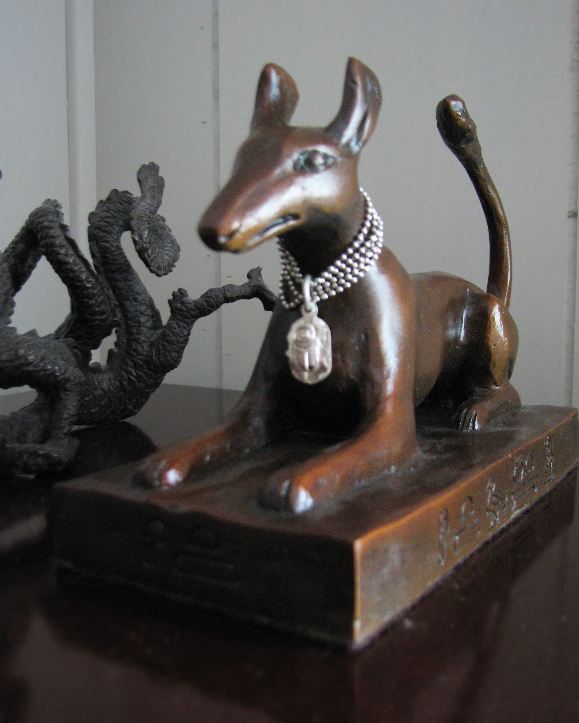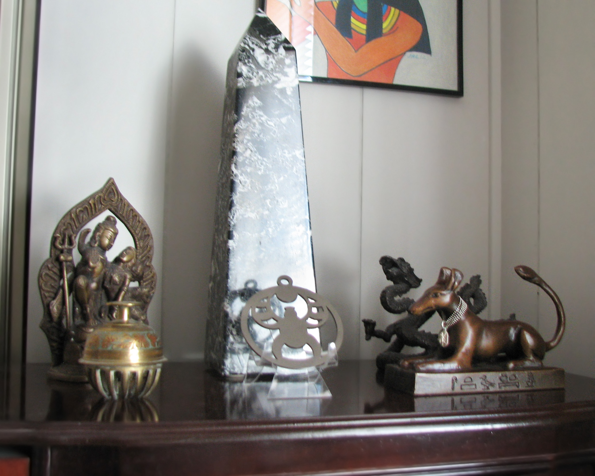 "the metal which came forth from Seth" is "bj3 - meteoric iron" (Source, Ann Macy Roth "Opening of the Mouth Ceremony") Also, to me, the Chinese dragon shares commonalities with Set, for the fierce, relentless energy. Not only that, the dragon has serpentine characteristics, and for me, this juxtaposition is serving to represent "the uraeus which proceeded from Seth" (Utterance 570 of the Pyramid Texts, Pepi I: Vestibule, West and East Walls: _The Literature of Ancient Egypt_, edited by William K. Simpson, pages 260-261) And why is there a statue of Shiva and Parvati in this sacred space? Okay, this is a bit of a stretch, pure "UPG", but Set has claimed all my statues of Shiva, so for me it represents Set with Astarte, or Nephthys, his usual consorts.) |