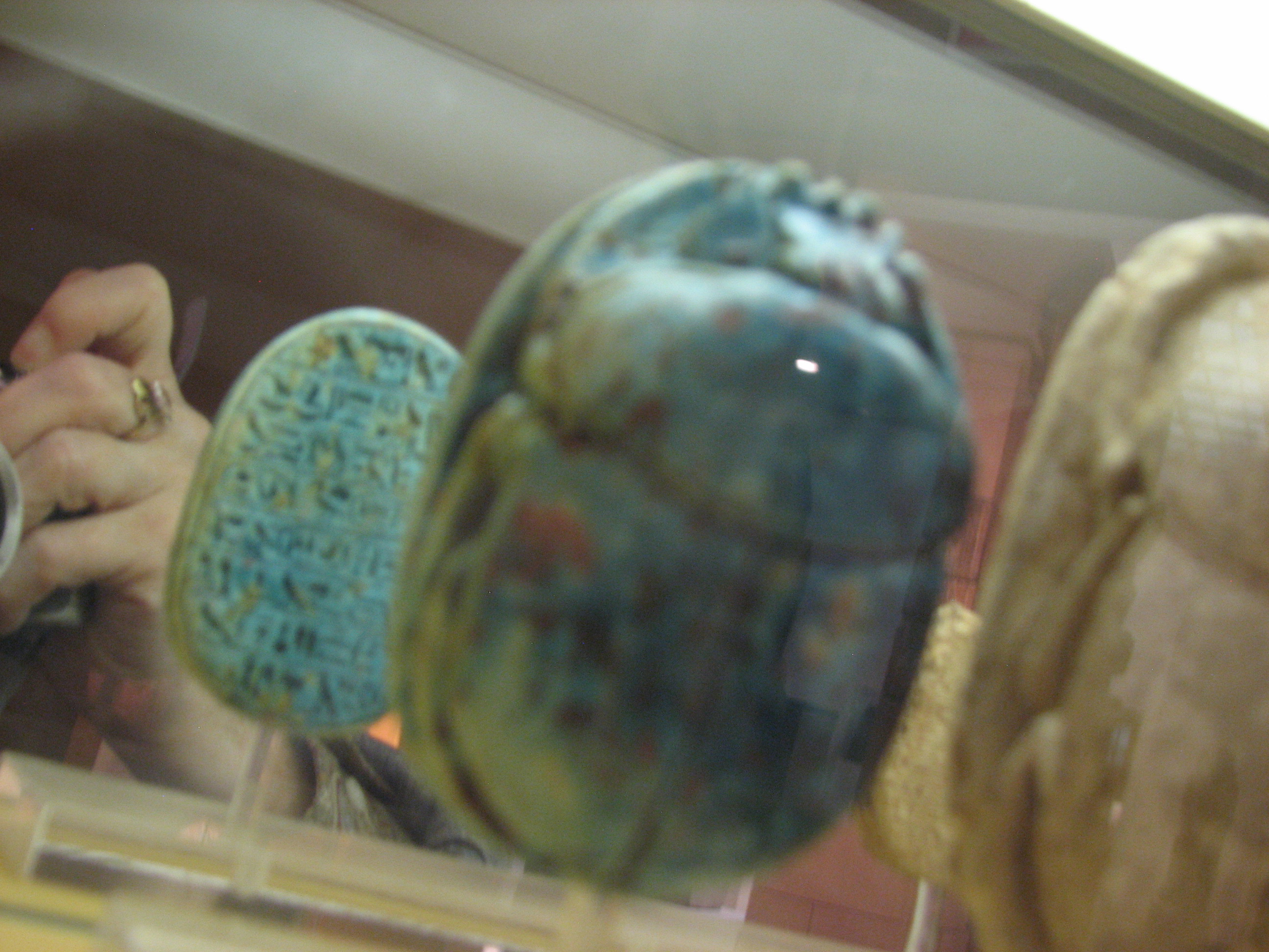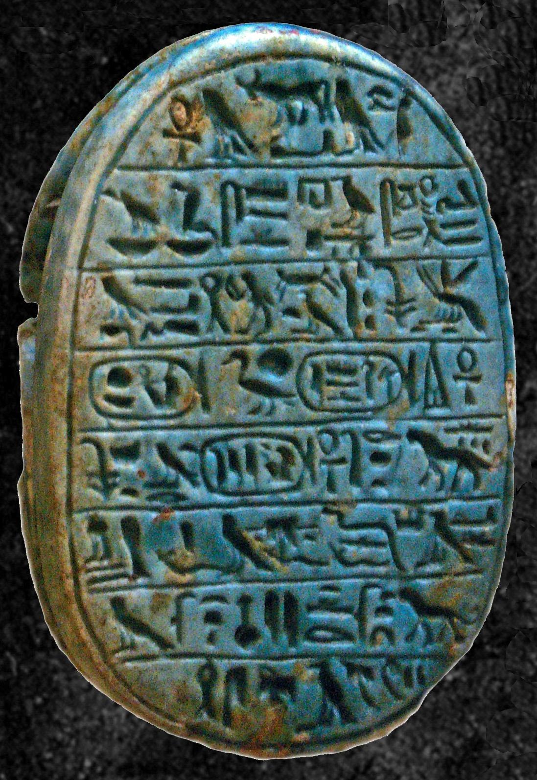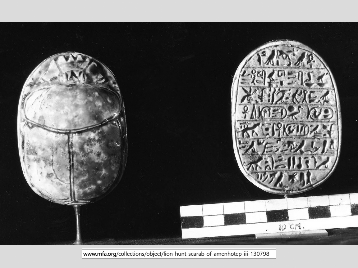 ![]() But a bit of a mystery at first, because the accession number given is for a different scarab of Amenhotep III! Accession #1972.873 is of one that is commemorating the building of an irrigation basin. Sadly, this one is announcing Amenhotep's feat of having hunted and slain 102 lions in the first ten years of his reign. NOTHING to brag about! Oh, yes, the pharaoh was powerful, as hunting in those days was no doubt more difficult than it is today. Still, had those lions not have been killed, perhaps there would be more of them today! Meanwhile, the correct accession number is #04.1810. The museum photo seems to be the reverse, until we realize my poor attempt and Charlet's clear photo are recording the mirror reflection of the hieroglyphs: