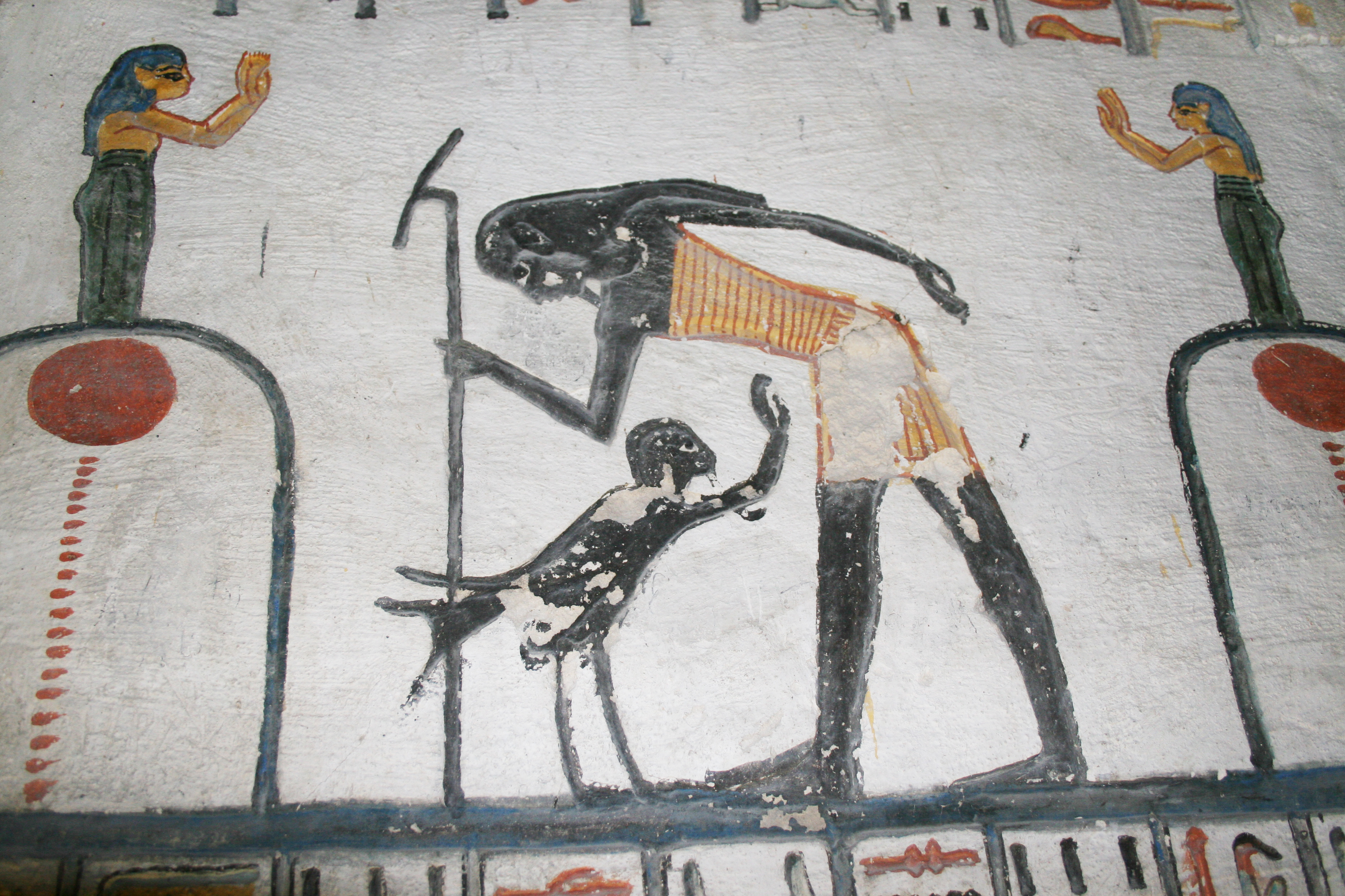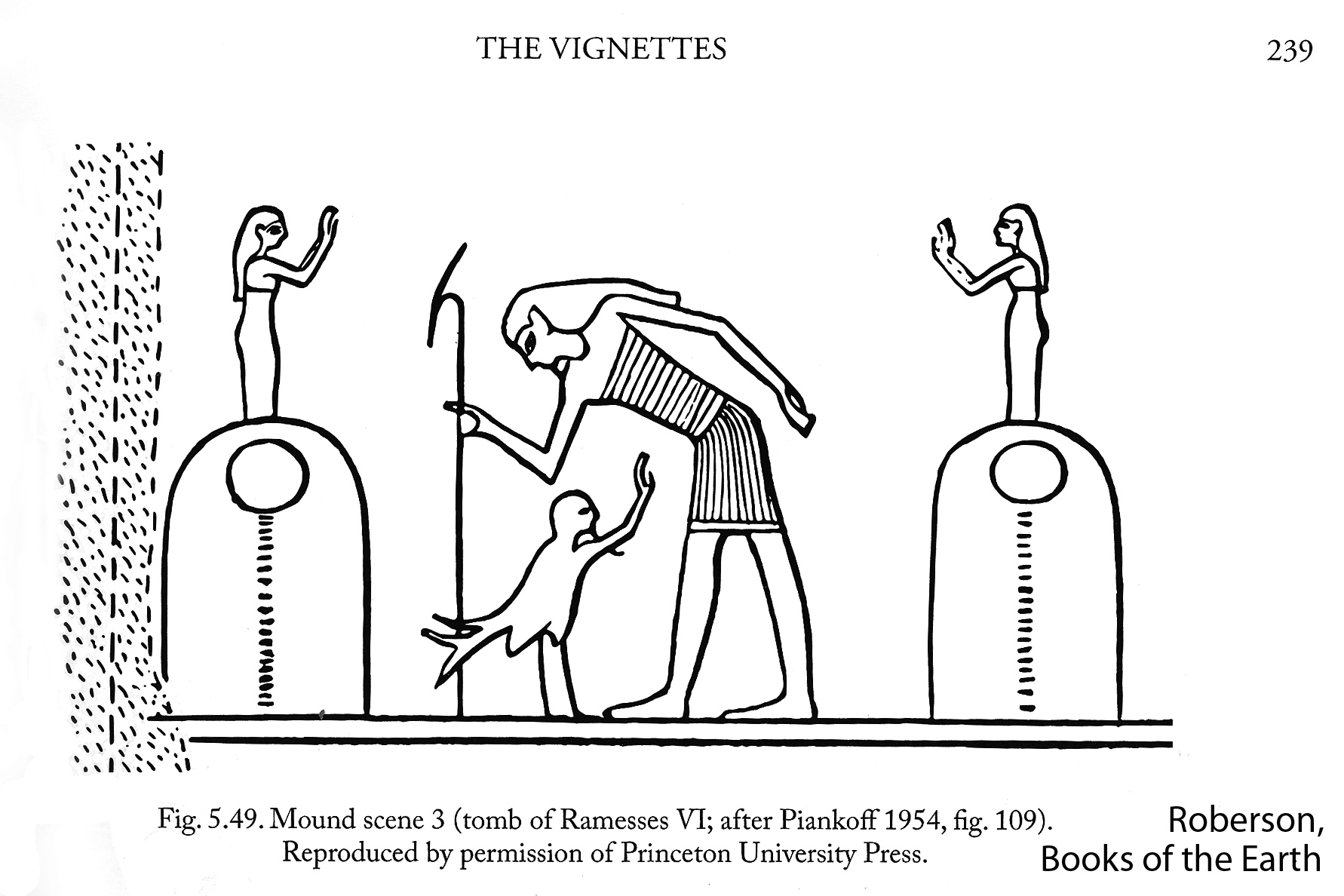 This is a big, heavy book, with lots of text and images, mostly line drawings of the scenes in the Ramesside tombs. Roberson describes the image above: "A bearded, male deity wearing a short kilt bends sharply forward, leaning heavily upon a was-scepter. His crooked posture recalls the hieroglyph for 'old age' and 'greatness,' []. ![]() A human-headed ba-bird stands with upraised arms, in the posture of adoration, directly beneath the bent torso of the god. In Ramesses VI's annotation, these two figures are identified as the corpse and ba of Aker. [...] On either side of this central pair appear two oblong mounds. (j3.wt). From the top of each mound emerges a praising goddess, whose feet are not visible. In the version of Ramesses VI, a solar disc with a descending tongue of flame appears inside each of the two mounds." (Pages 239-240) Thanks to William Petty, we have a photo of this scene: