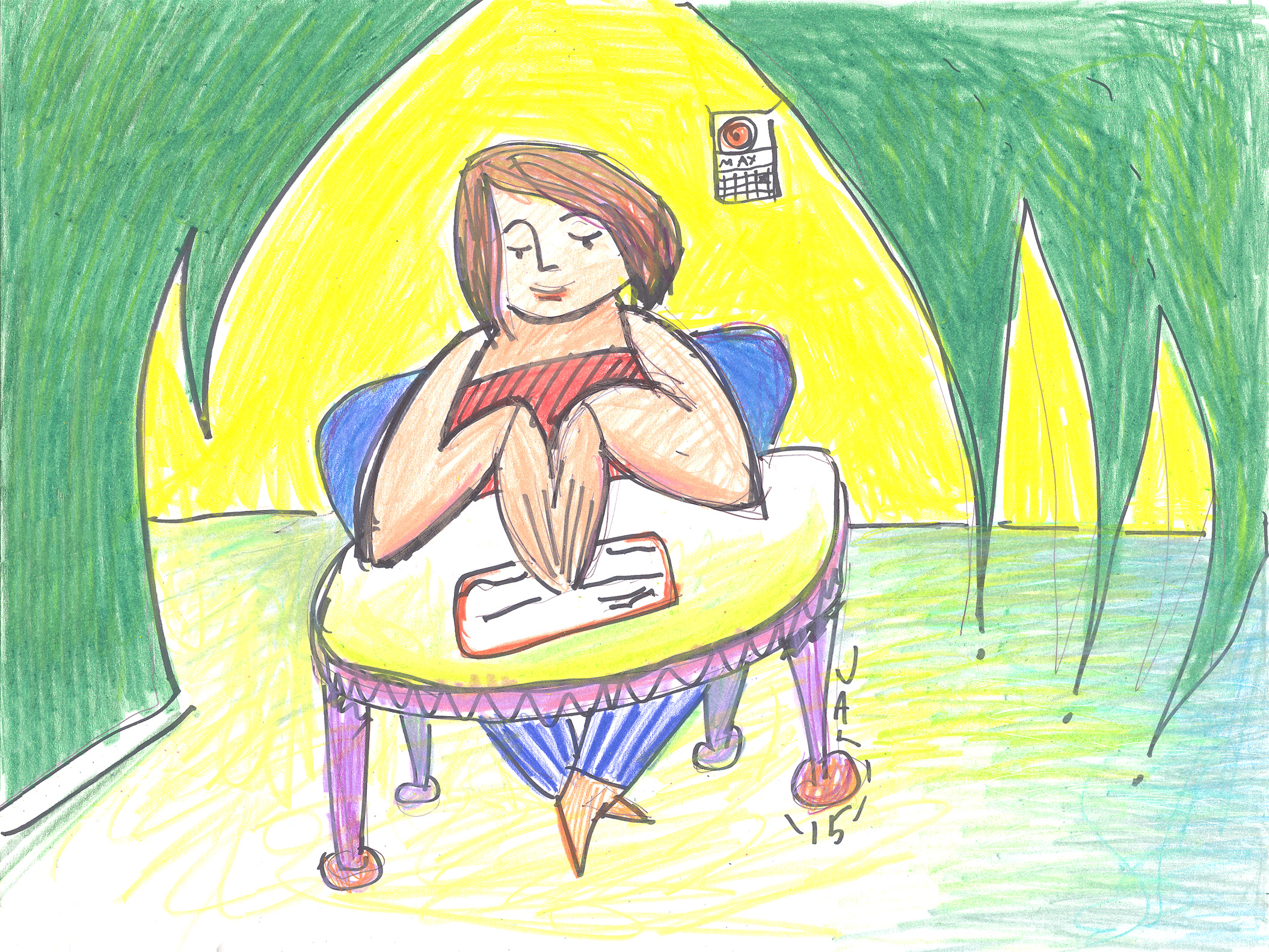 After putting up yesterday's entry, "Figures of Flight and Fancy", I got curious about more of Chagall's art, and so found a fascinating site with lots of prints by Chagall. Only the wealthy will be purchasing there, however! After looking at all that luminous color, I found myself itching to make my own attempt. I wasn't content with just the line drawing, though. I wanted color and lots of it. I just grabbed pencils and layered it up. What this piece means, I'm not sure. Is the lady RECEIVING a check for money, or is she preparing a check to send by May? She does not look unhappy about it, so I'm going to take this as something beneficial.