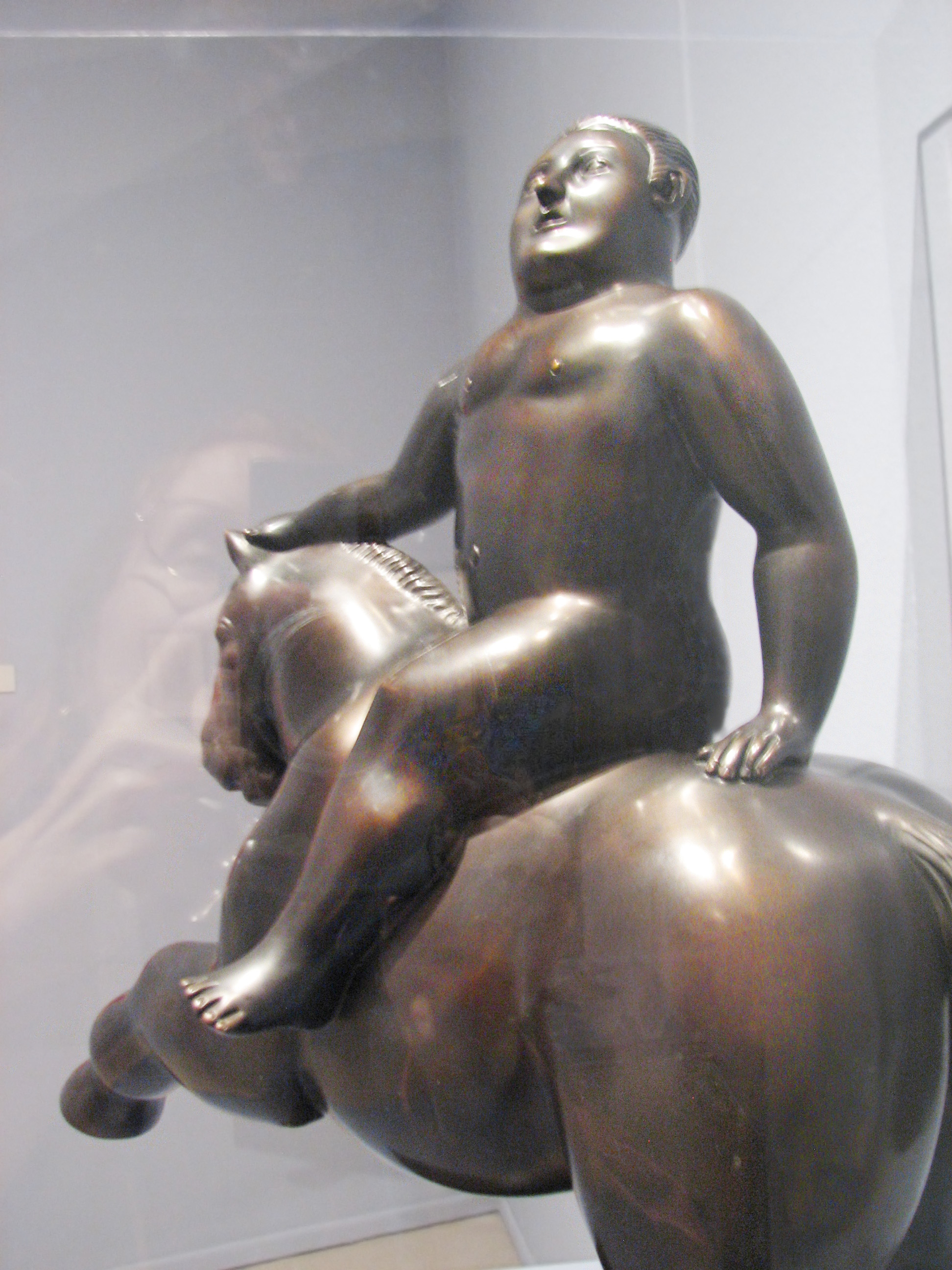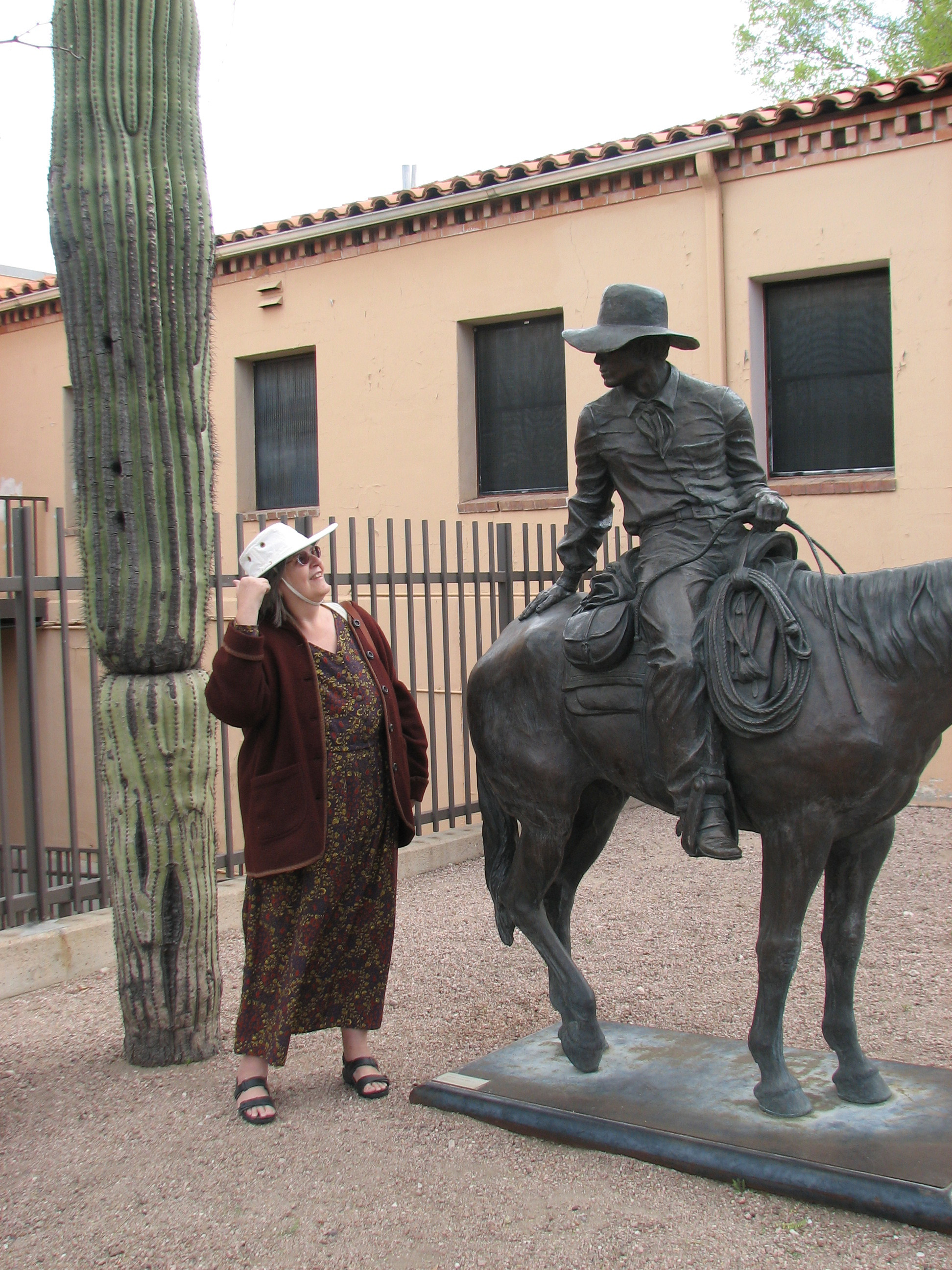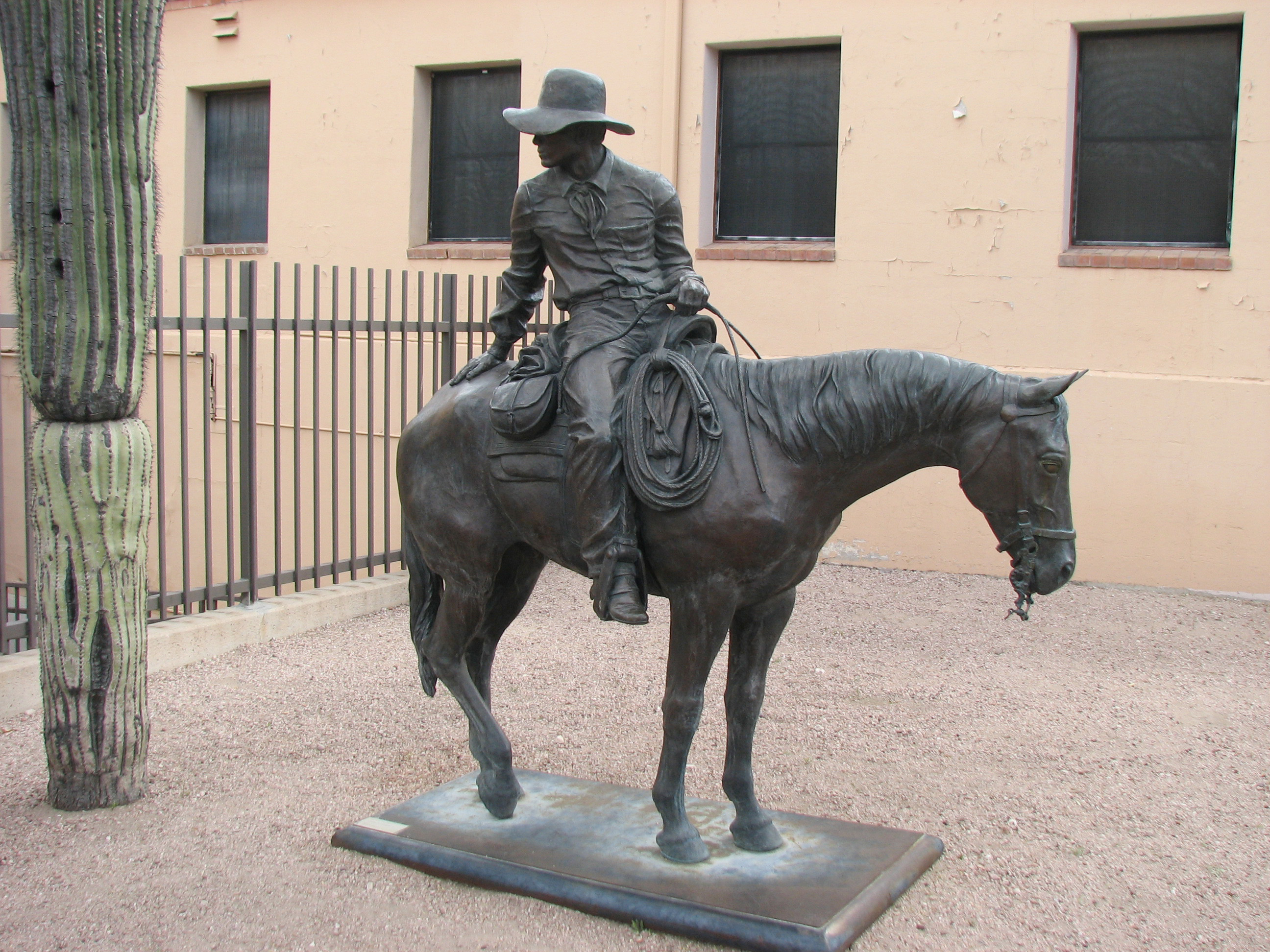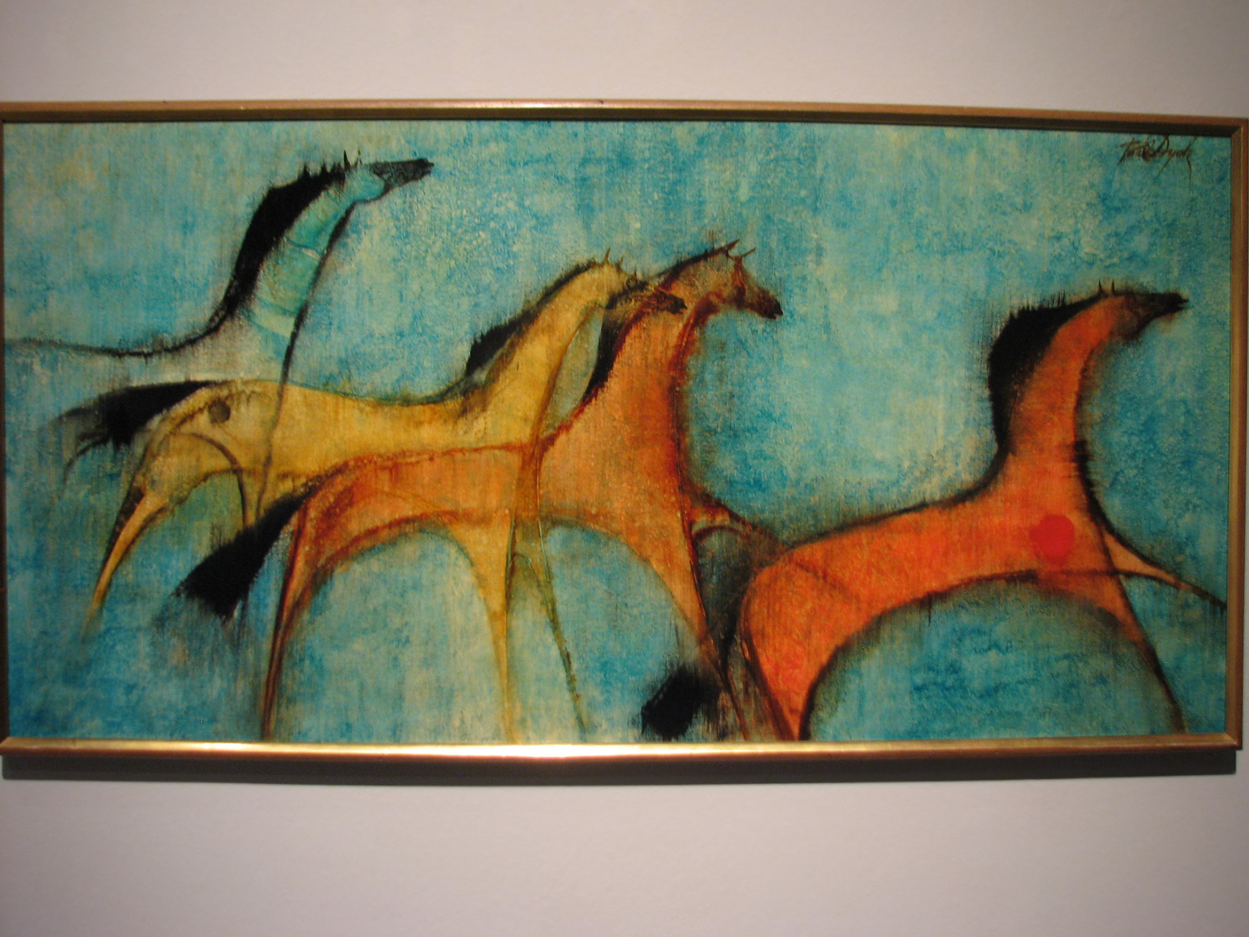 "Devoted to the lives, history, and imagery of Native Americans, Dyck lived among several tribes and gained first-hand knowledge of these cultures throughout the twentieth century. He applied his knowledge of fourteenth century painting techniques and used egg tempera and oil glazes for desired effect. Dyck found inspiration by looking at depictions of horses in hide paintings or ledger drawings of Native American peoples." (From info card) There's a huge horse and rider sculpture outside of the museum: