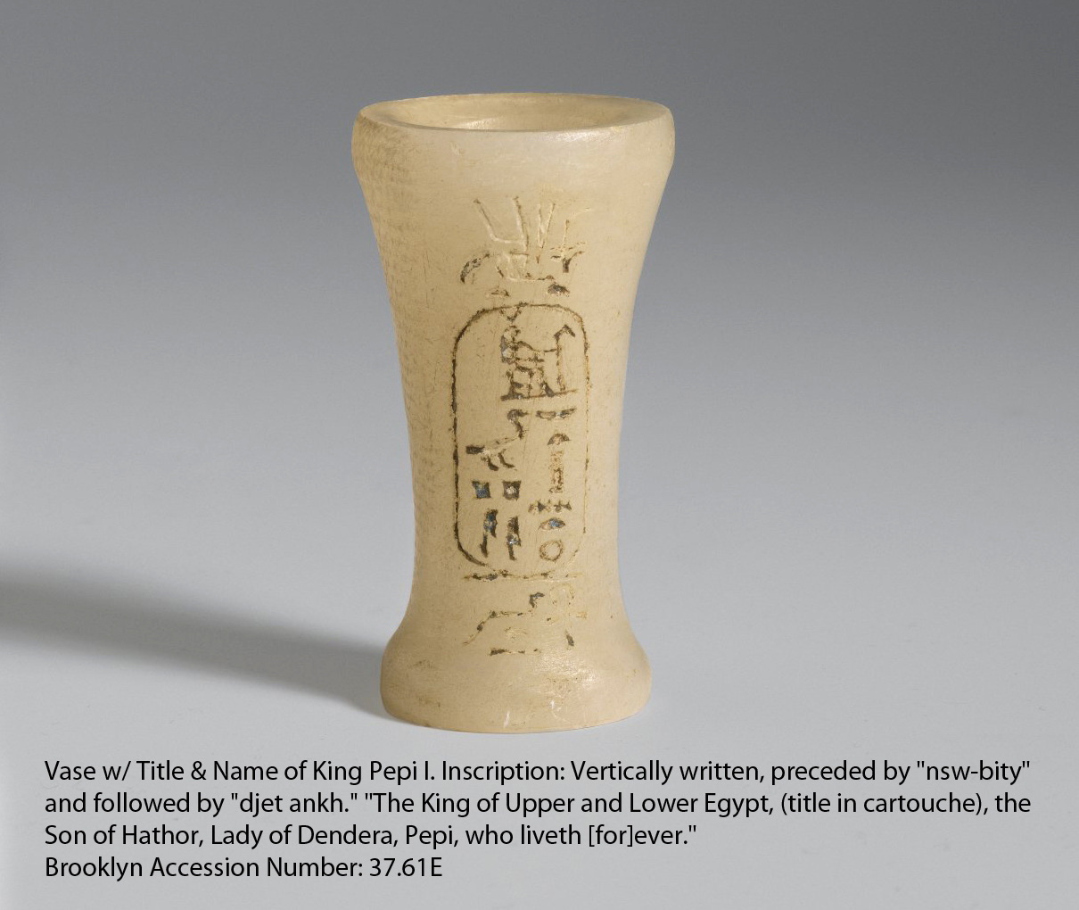 "Catalogue Description: Vase Bearing Title and Name of King Pepi I. Inscription: Vertically written, preceded by "nsw-bity" and followed by "djet ankh." "The King of Upper and Lower Egypt, (title in cartouche), the Son of Hathor, Lady of Dendera, Pepi, who liveth [for]ever."