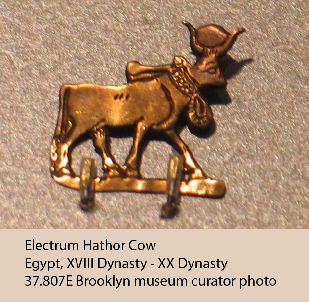 So perhaps the vase features abbreviated glyphs to say "Lady of Dendera, Eye of Ra"? The two bottom glyphs are ambiguous. Lacking either center dot to suggest "Ra" or the "X" to suggest city, perhaps it's meant to say both? Same for the glyph above it. It is almost the bread-loaf "t", but there's a faint eye in it? Or am I seeing things that aren't there? Meanwhile, "Already in the Fifth Dynasty private monuments recorded a cult of Hathor of Dendera" and "By the Sixth Dynasty there were many temples up and down the Nile dedicated to the cult of Hathor, several erected by Pepi I". (Barbara Lesko, _The Great Goddesses of Egypt_, page 93) The other piece is a tiny electrum amulet, shared just because it's so cute: