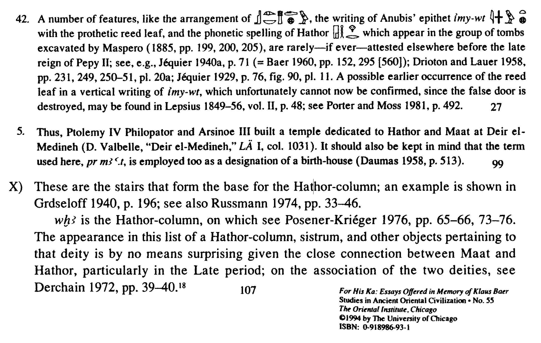 ![]() Then I got distracted and ended up taking whatever pdf book I came across in my saved files and searching for "Hathor". The book was SAOC 55, _For His Ka: Essays Offered in Memory of Klaus Baer_. I learned of another way in which Hathor might be referred to: