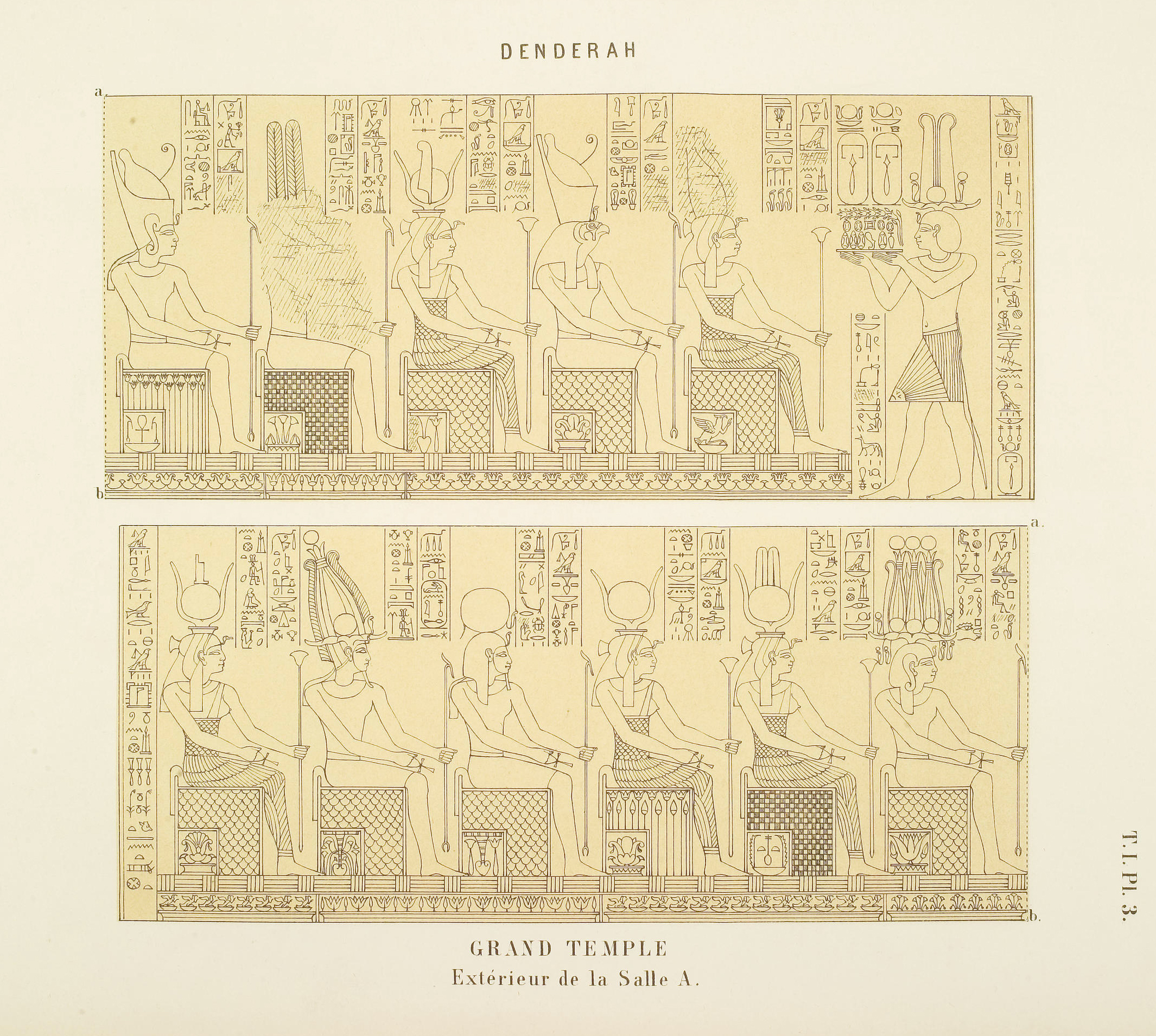 "Ptolemy IV Philopator and Arsinoe III built a temple dedicated to Hathor and Maat at Deir el-Medineh..." (Footnote 5, page 99) There is a "close connection between Maat and Hathor, particularly in the Late period; on the association of the two deities, see Derchain 1972, pp. 39-40." (page 107) I found Philippe Derchain's book title in a list of references: _Hathor Quadrifons: Recherches sur la Syntax d'un Mythe Égyptien_. Written in French! I was luckily able to find a copy, but it's written in French. (Insert pouty face :( ) So I brought up the reverso.net page and got to work. Fortunately, the text allowed copy and paste, and the character recognition on it wasn't too bad. Between reverso.net and my high school French studies, I was able to hammer out something meaningful, but am breaking it up a bit spacewise for better digestion: