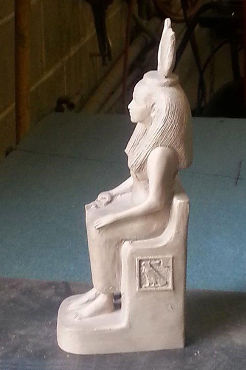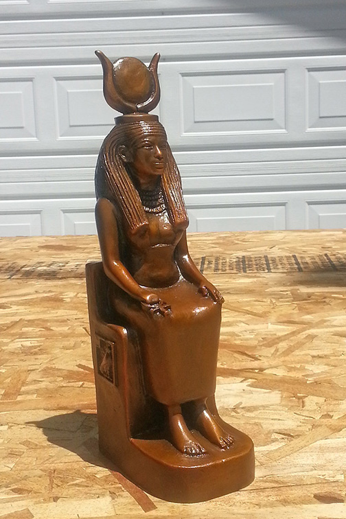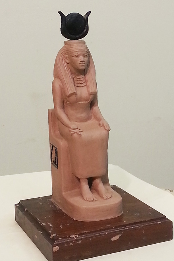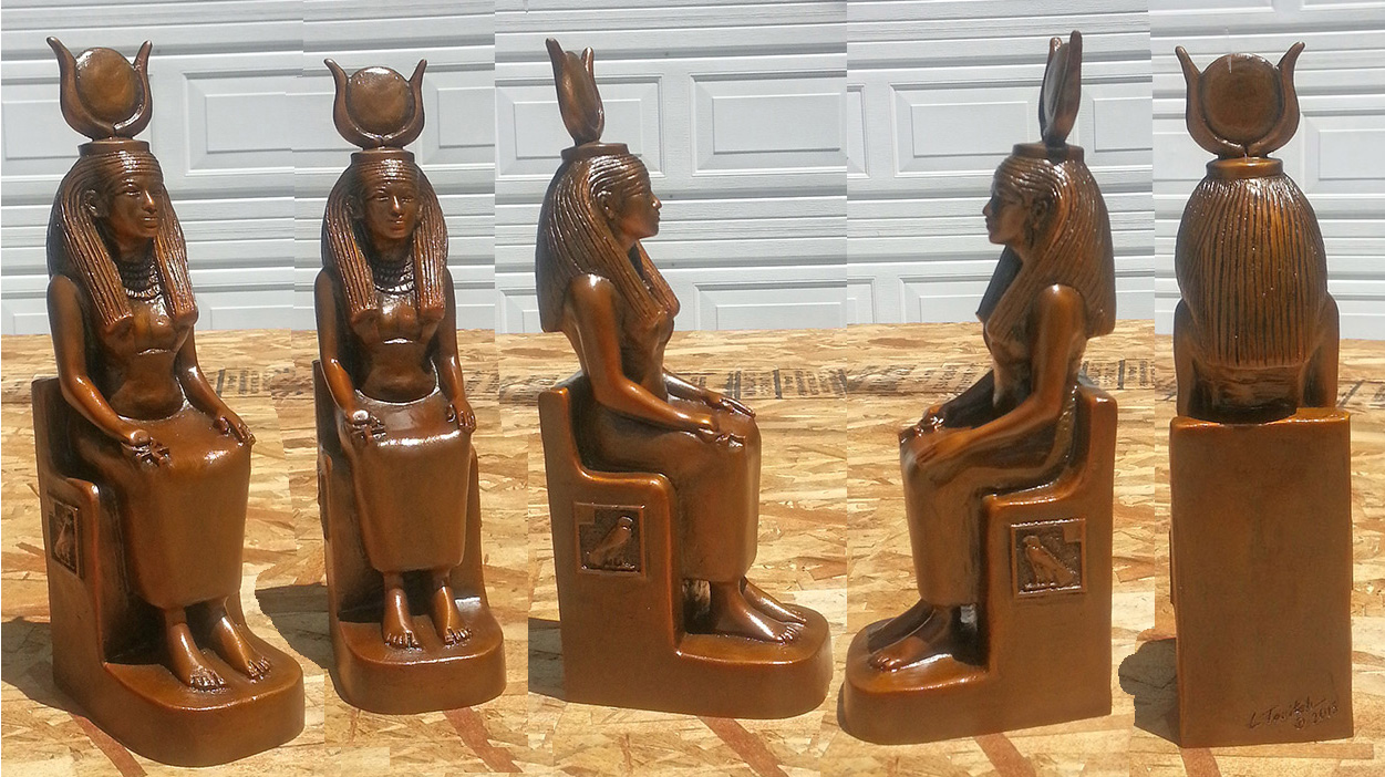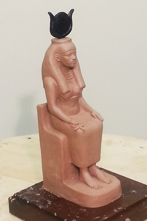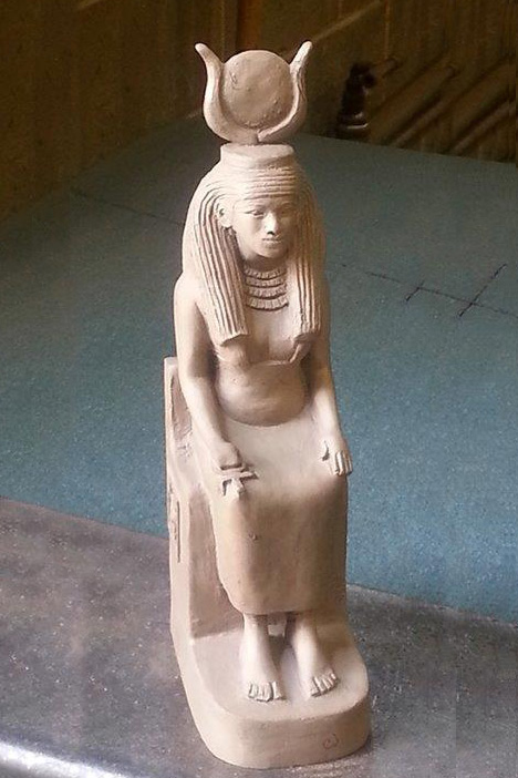 After I presented my drawing to the sculptor Lena Toritch, she first came up with a rough clay model and asked if that's what I had in mind and if any changes should be made. I wanted hair lines and jewels delineated in her necklace. She then showed me photos of the final clay version. Delicate details such as her headdress and the glyph that says "Hathor" (Hethert) are done in wax.