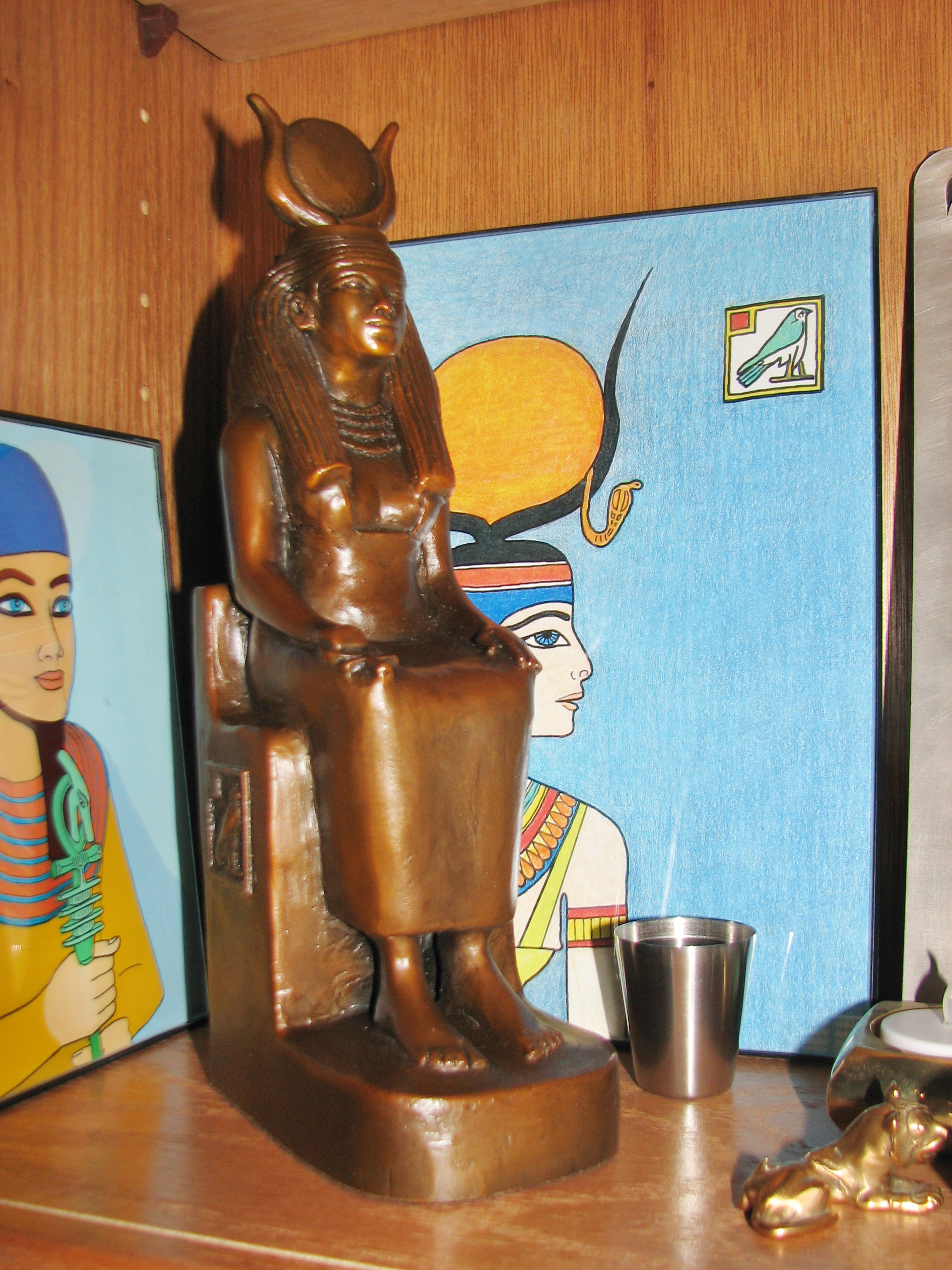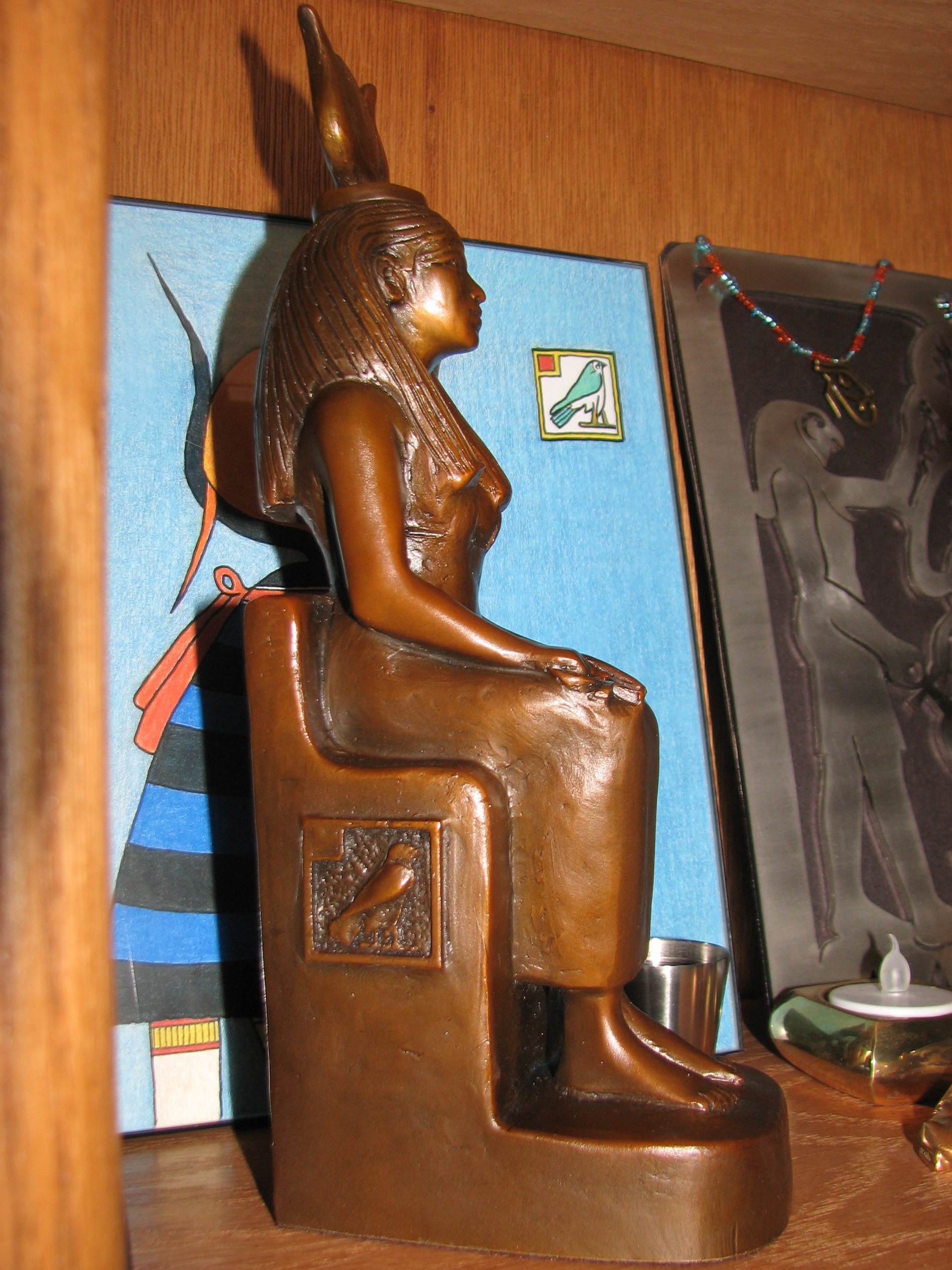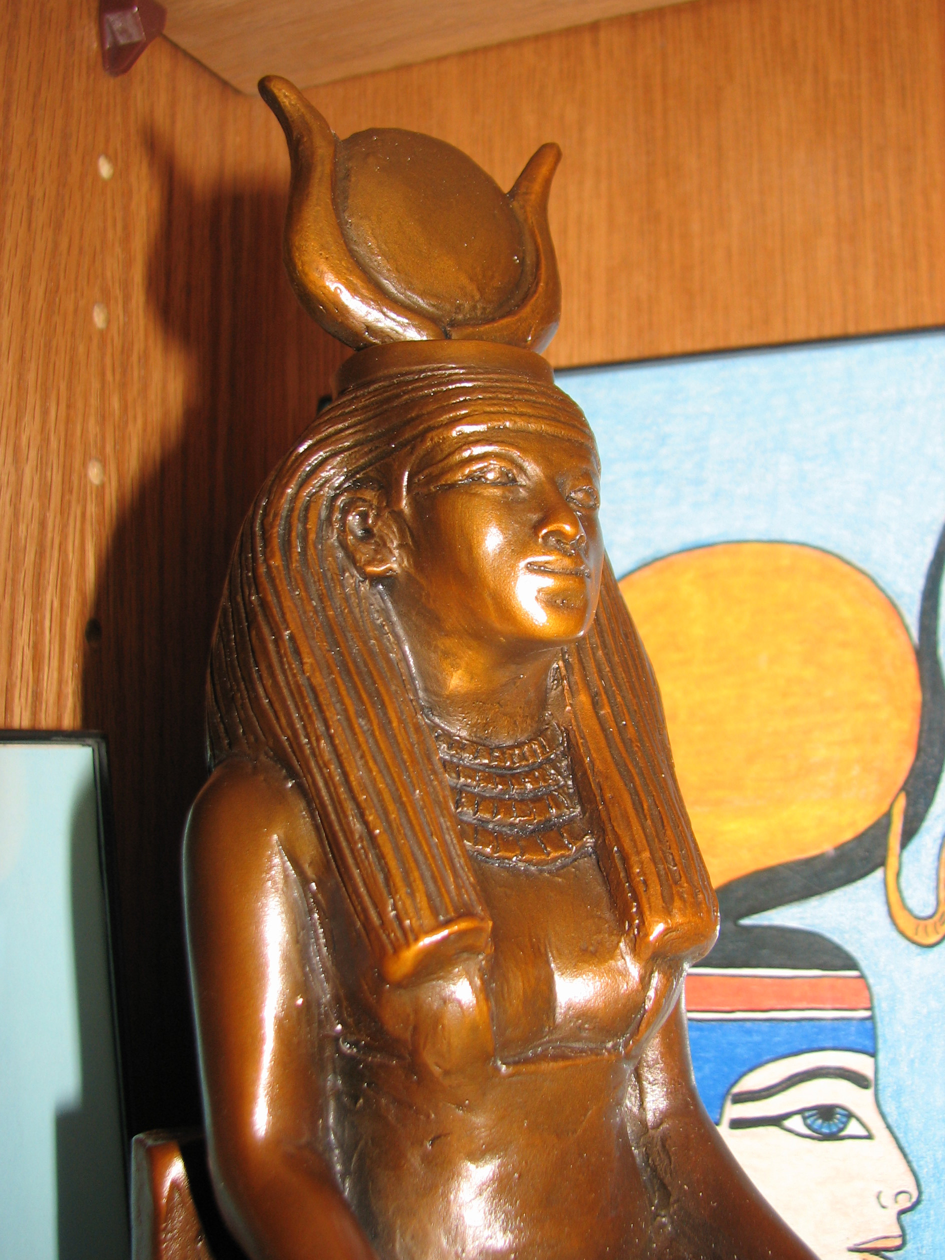 After I presented my drawing to the sculptor Lena Toritch, she first came up with a rough clay model and asked if that's what I had in mind and if any changes should be made. I wanted hair lines and jewels delineated in her necklace. She then showed me photos of the final clay version. Delicate details such as her headdress and the glyph that says "Hathor" (Hethert) are done in wax.