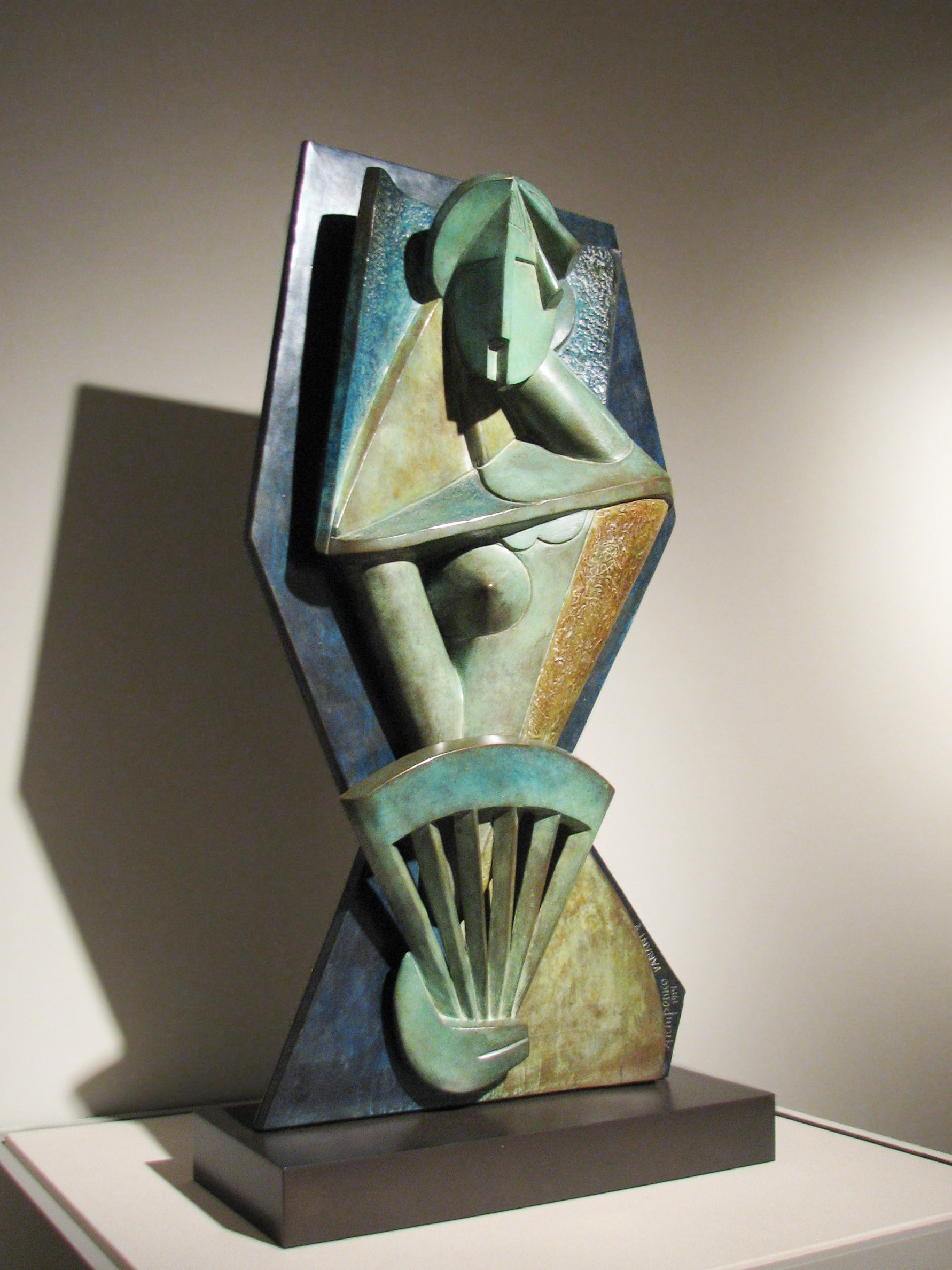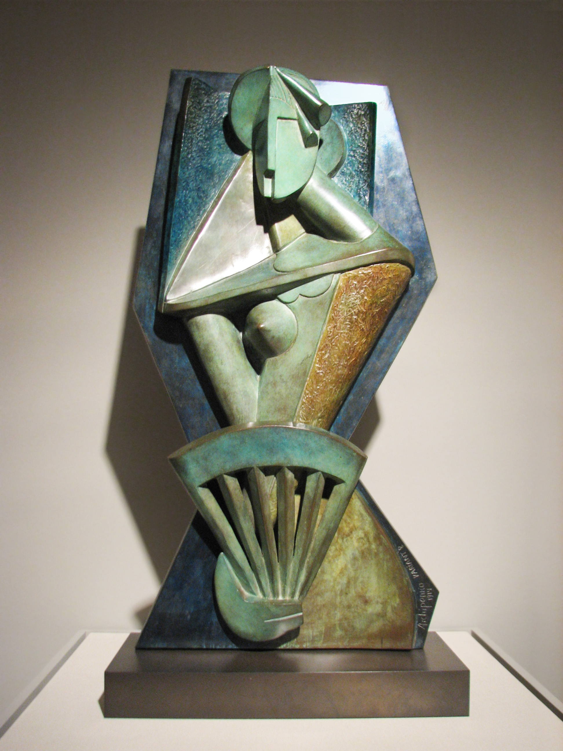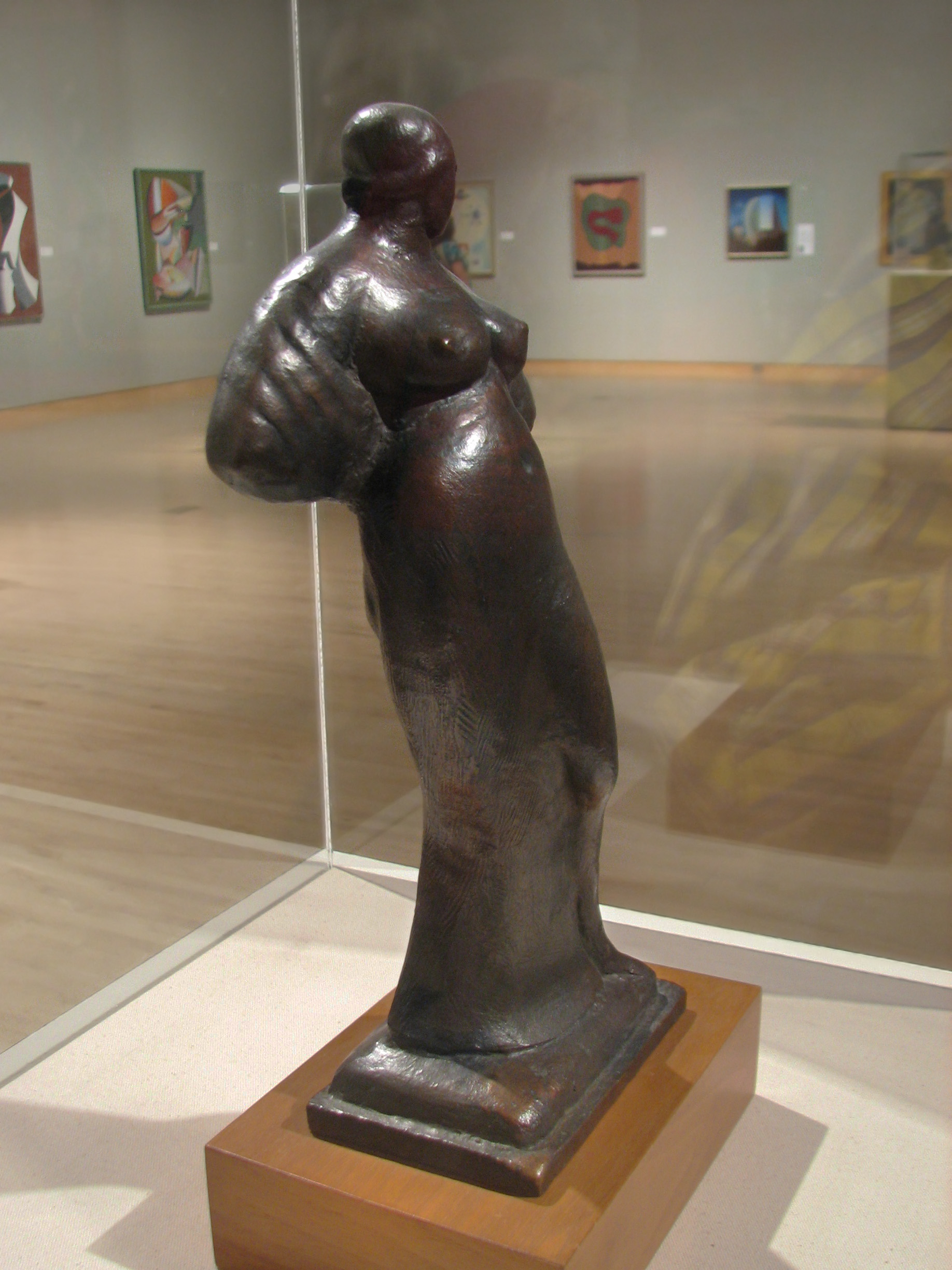 Necessity and Invention Delft Ware "A change of dynasty and turmoil in China between 1644 and 1656 disrupted Dutch trade routes. Consumers lost access to blue-and-white porcelain from China in 1657, but the desire for it didn't wane. To fill the void, Dutch potters developed their own high-quality version, now known as Delft ware, named after the city in which it originated. This large covered jar is an outstanding example of this production. "Delft is not porcelain; it is faience, or earthenware. Delft potters did not have access to the kaolin clay that produces porcelain, and so their objects have a different chemical make-up and different properties. The clay object is coated in a tin oxide glaze to make it white; cobalt is painted on top, and then a transparent glaze is applied to make the object shiny. The decoration on this large covered jar includes disparate scenes that read as 'exotic' and 'Chinese', including palm trees, an elephant, and patterns that suggest mountains or floral elements. Other Delft pieces from this time show almost identical scenes - the elephant in particular - suggesting the potters shared pattern sources." So far, all of these pieces I remember are from the museum's own holdings. The Vilcek collection has an interesting sculpture by Alexander Archipenko: