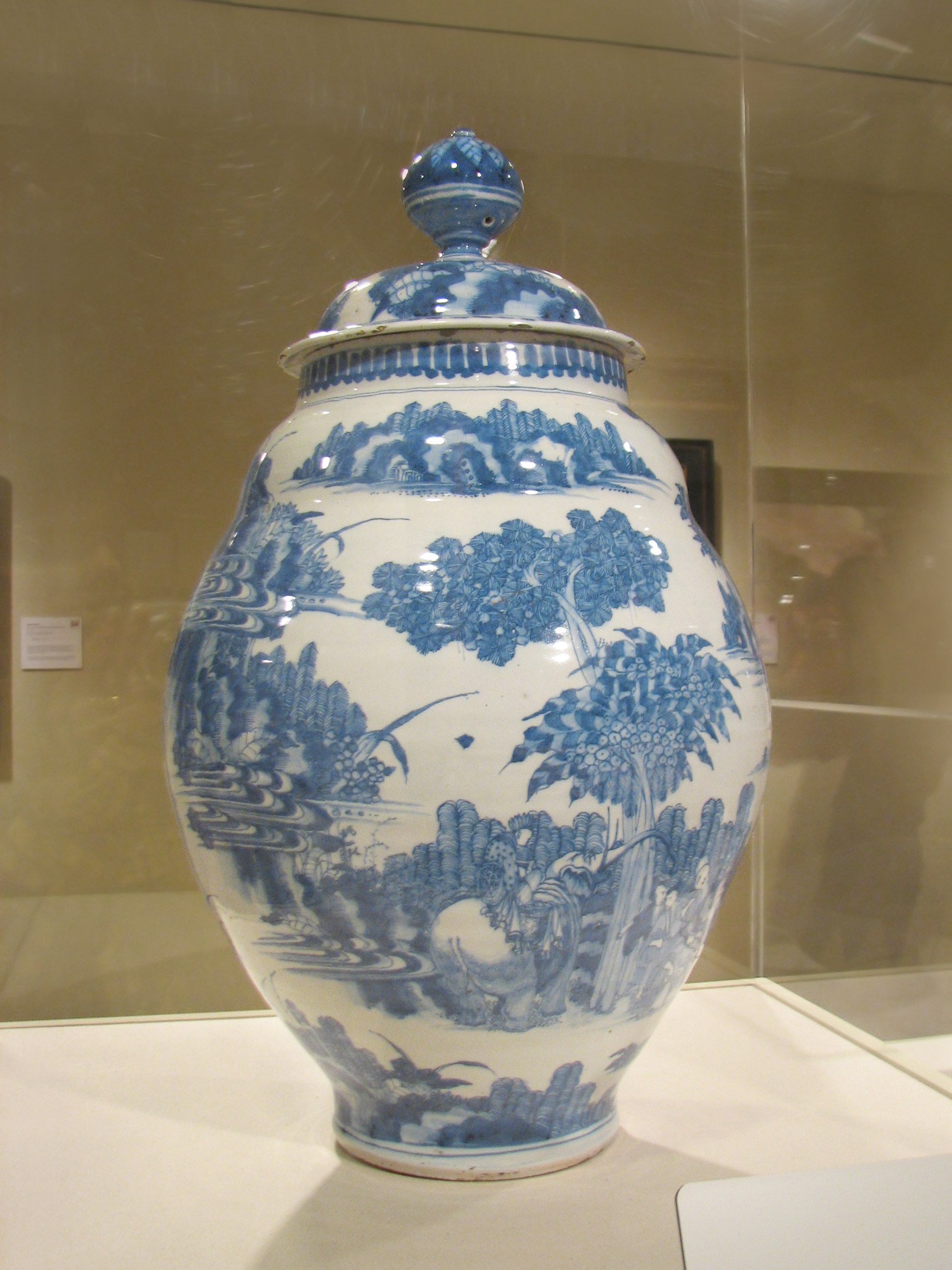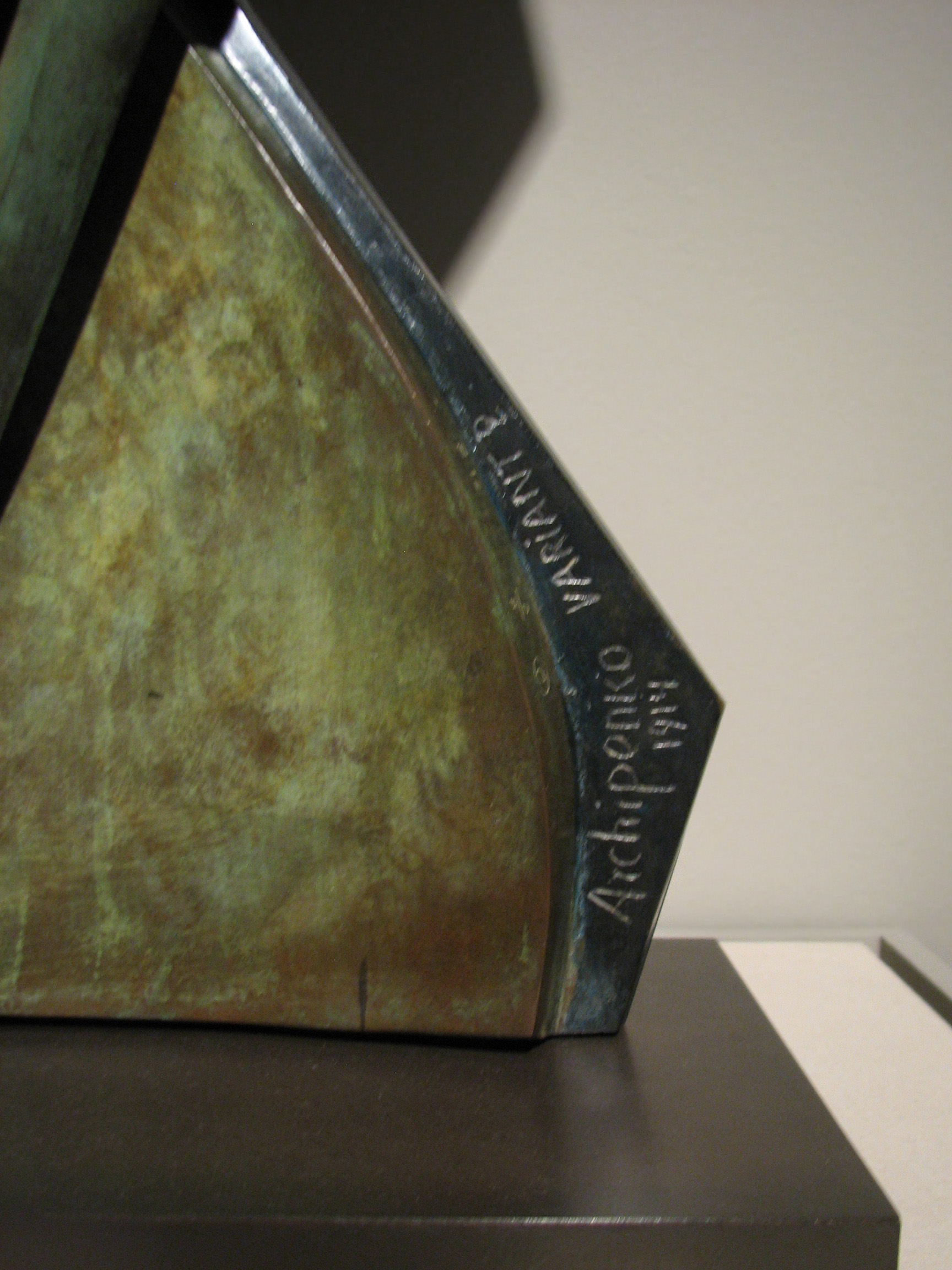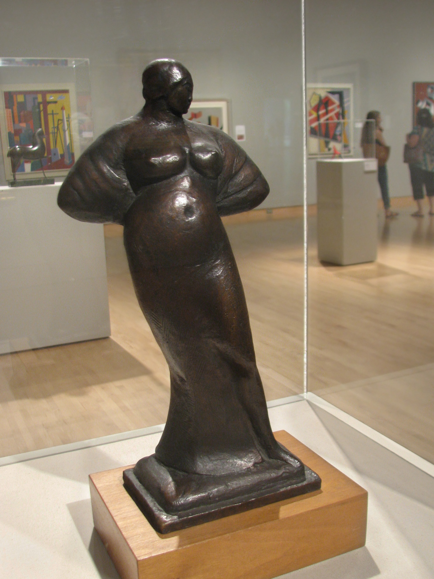 Necessity and Invention Delft Ware "A change of dynasty and turmoil in China between 1644 and 1656 disrupted Dutch trade routes. Consumers lost access to blue-and-white porcelain from China in 1657, but the desire for it didn't wane. To fill the void, Dutch potters developed their own high-quality version, now known as Delft ware, named after the city in which it originated. This large covered jar is an outstanding example of this production. "Delft is not porcelain; it is faience, or earthenware. Delft potters did not have access to the kaolin clay that produces porcelain, and so their objects have a different chemical make-up and different properties. The clay object is coated in a tin oxide glaze to make it white; cobalt is painted on top, and then a transparent glaze is applied to make the object shiny. The decoration on this large covered jar includes disparate scenes that read as 'exotic' and 'Chinese', including palm trees, an elephant, and patterns that suggest mountains or floral elements. Other Delft pieces from this time show almost identical scenes - the elephant in particular - suggesting the potters shared pattern sources." So far, all of these pieces I remember are from the museum's own holdings. The Vilcek collection has an interesting sculpture by Alexander Archipenko: