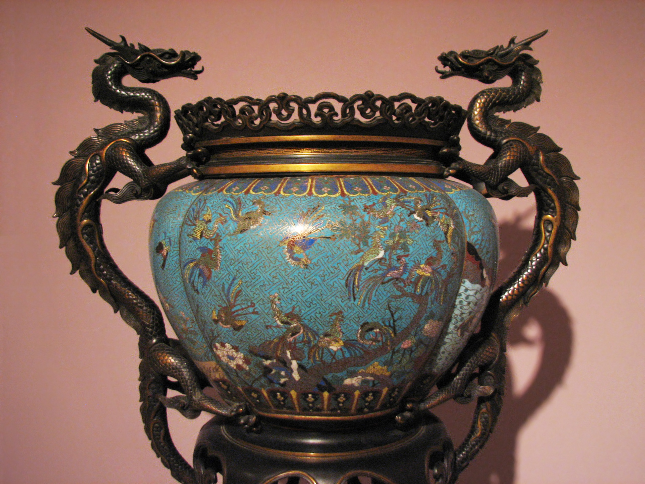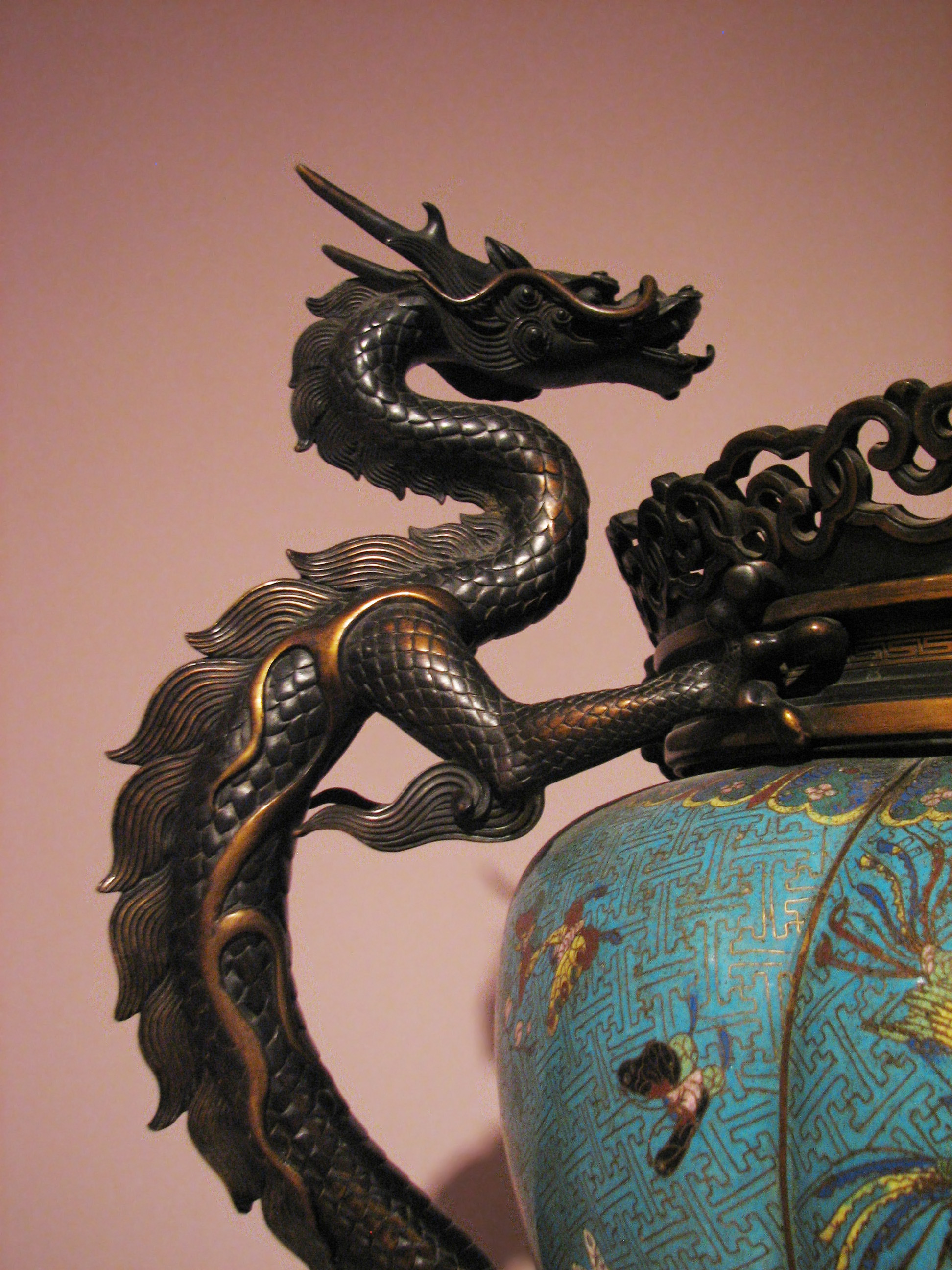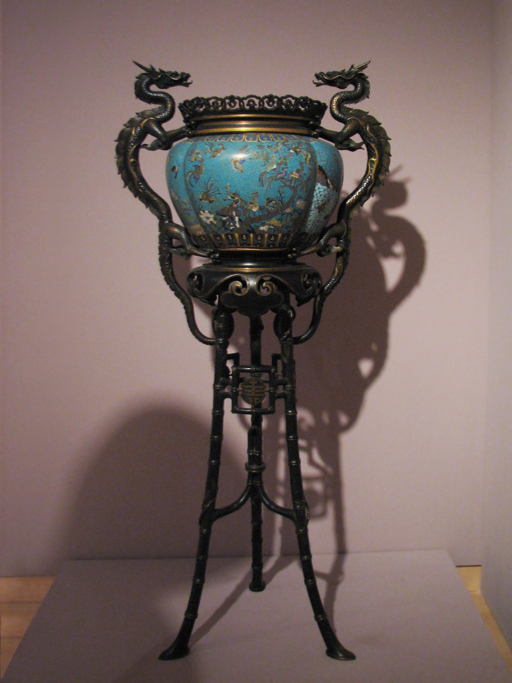 "This rare example of the European fascination wit and embellishment of Chinese enamel wares is a testament to the high regard for the Chinese pieces that was prevalent during the nineteenth century. It also reflects the revival of cloissonné during the late nineteenth century in China. These circumstances were due to the fact that Franco-British expeditionary forces that plundered the Summer Palace at Yuanmingyuan (outside of Beijing) in 1860 ceded much of their hoard to their respective sovereigns. In February 1861, the French portion was placed on public view in the Louvre, Paris. Together with artifacts presented by Siamese ambassadors at Fontainebleau, these constitued the collection of the Museé Chinois, created at Fontainebleau under Empress Eugénie's supervision and opened in 1863. The fascination with these Chinese objects on the part of French artists led to the undertaking of the exquisite mount for this Chinese piece created by the renowned bronze foundry of Ferdinard Barbedienne. The mounting features a pair of Chinese-style dragons, thus completing a circle of cross-cultural influences that was unprecedented." (From the info card) Not only the French, the Dutch also had a frenzy for Oriental things: