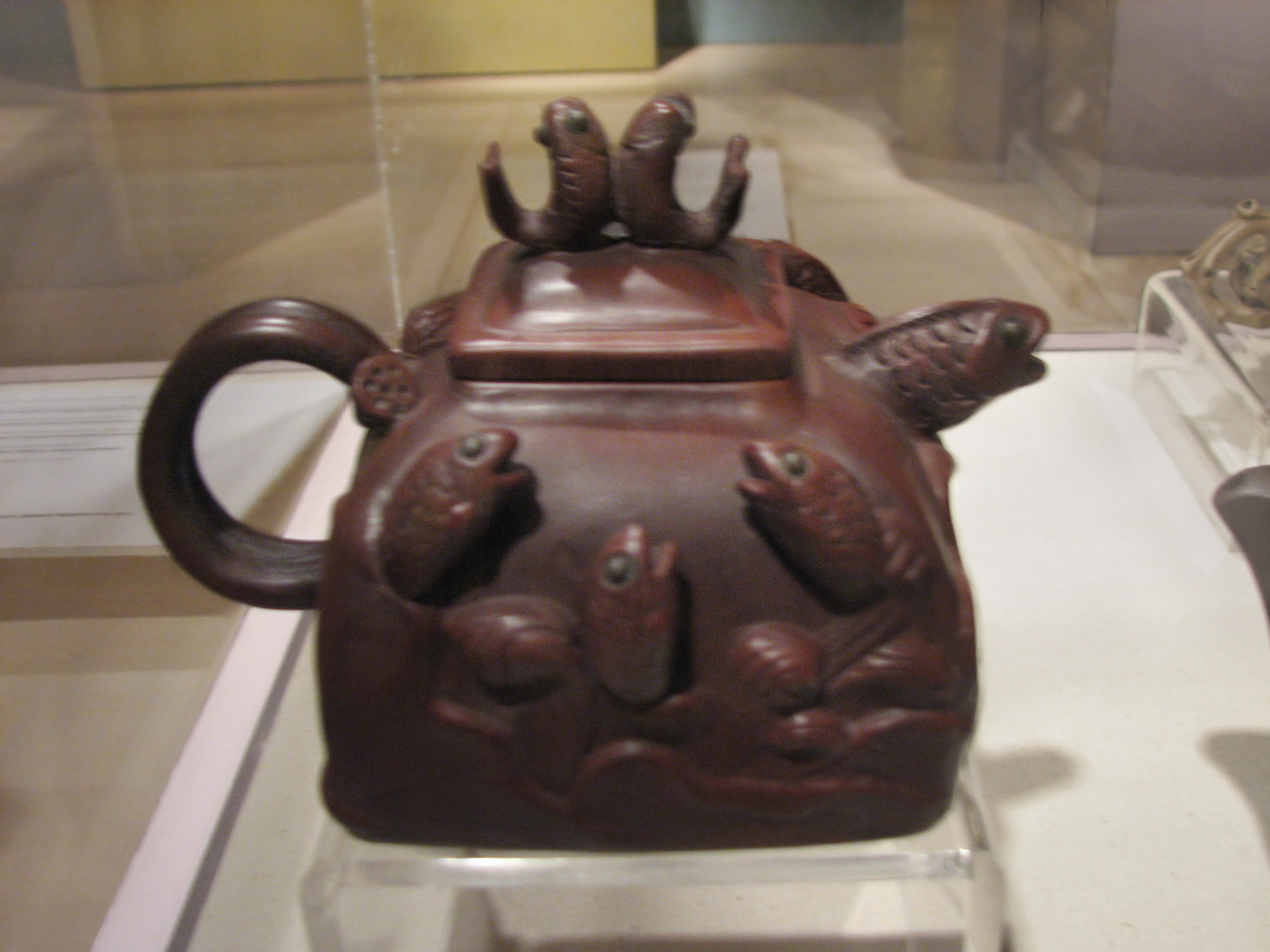 Square teapot with jumping fish, brown stoneware