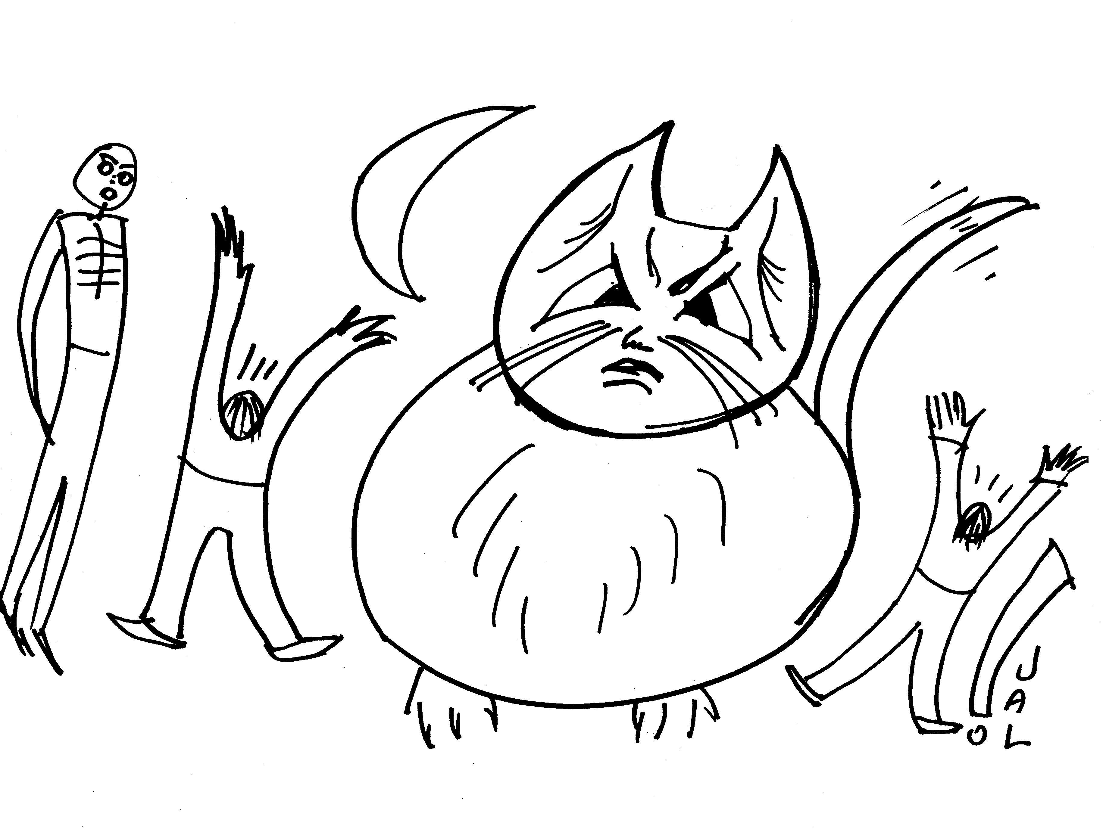 Wednesday, October 31, 2015 On my silly drawing, I don't know why the two scared humans are smaller than the perplexed cat. Maybe fear has made them small. The little wraith to the left seems quite innocent about the discomfort he has brought. :) |