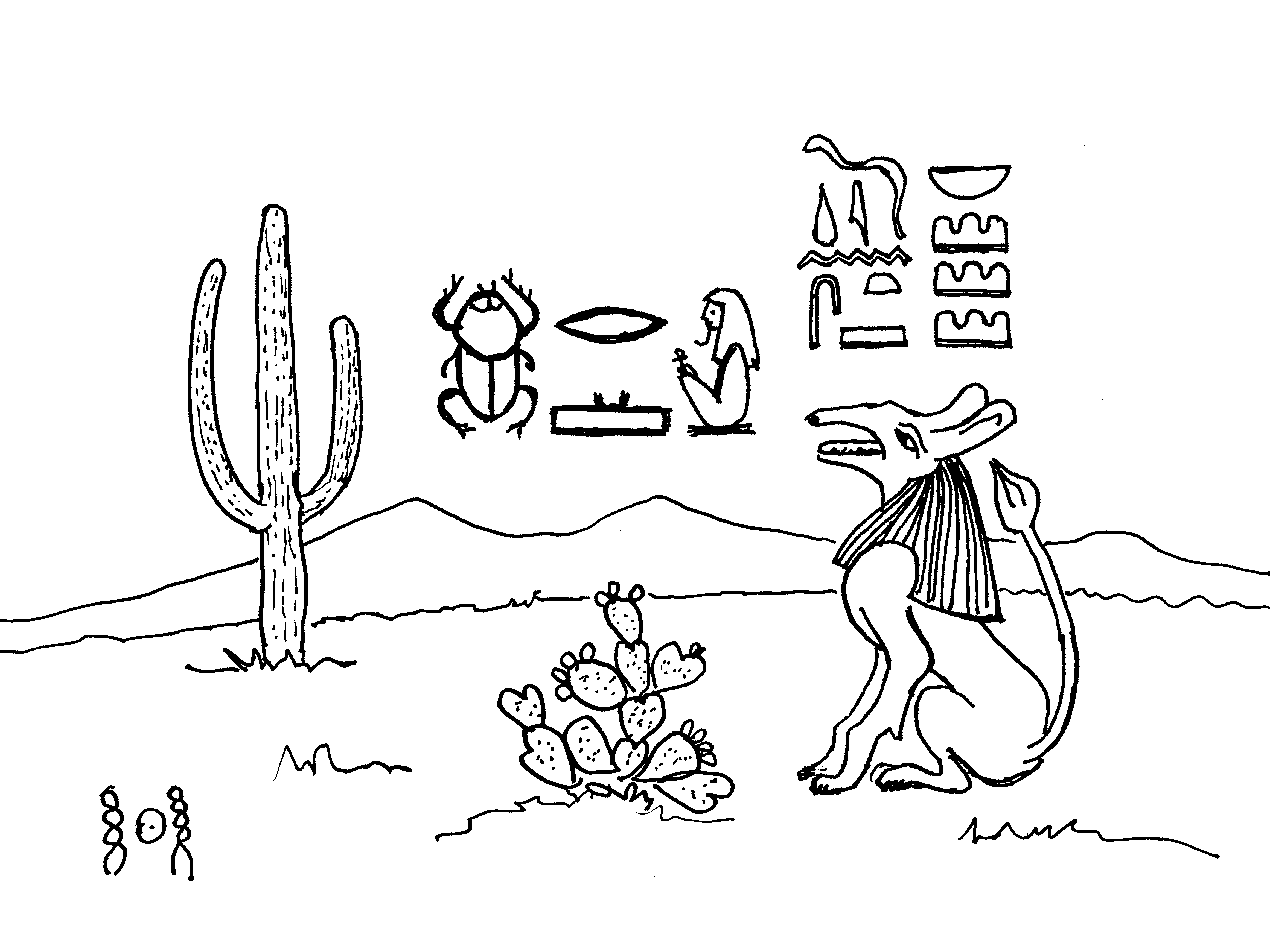I've been inspired by an "Art-a-Week" idea at one of my favorite forums. The theme this week is "desert". I'm not the only one to feature Set and the desert! Sarduriur features a Set fierce against the demons of illness. My Set is just howling that he exists, the sheer primal joy of existence. The "Words Spoken by" glyphs are standard. King Sahure's wall at Abusir, now in the Berlin museum, shows the glyphs for "Lord of Desert (Foreign Lands). I admit to a "Budgism" for the "I have come into being" part, but after studying the Faulkner and other hieroglyph books, I'm pretty certain this is how it's expressed.(I know the modern disdain for anything by Budge, but not everything he did was wrong!) Faulkner shows the 'ren' glyph under the kheper scarab. Also one of the meanings of the tied scroll glyph is having to do with abstract concepts. So it would underline the idea of one being conscious of their existence. Now to COLOR this! I'm envisioning twilight colors... |