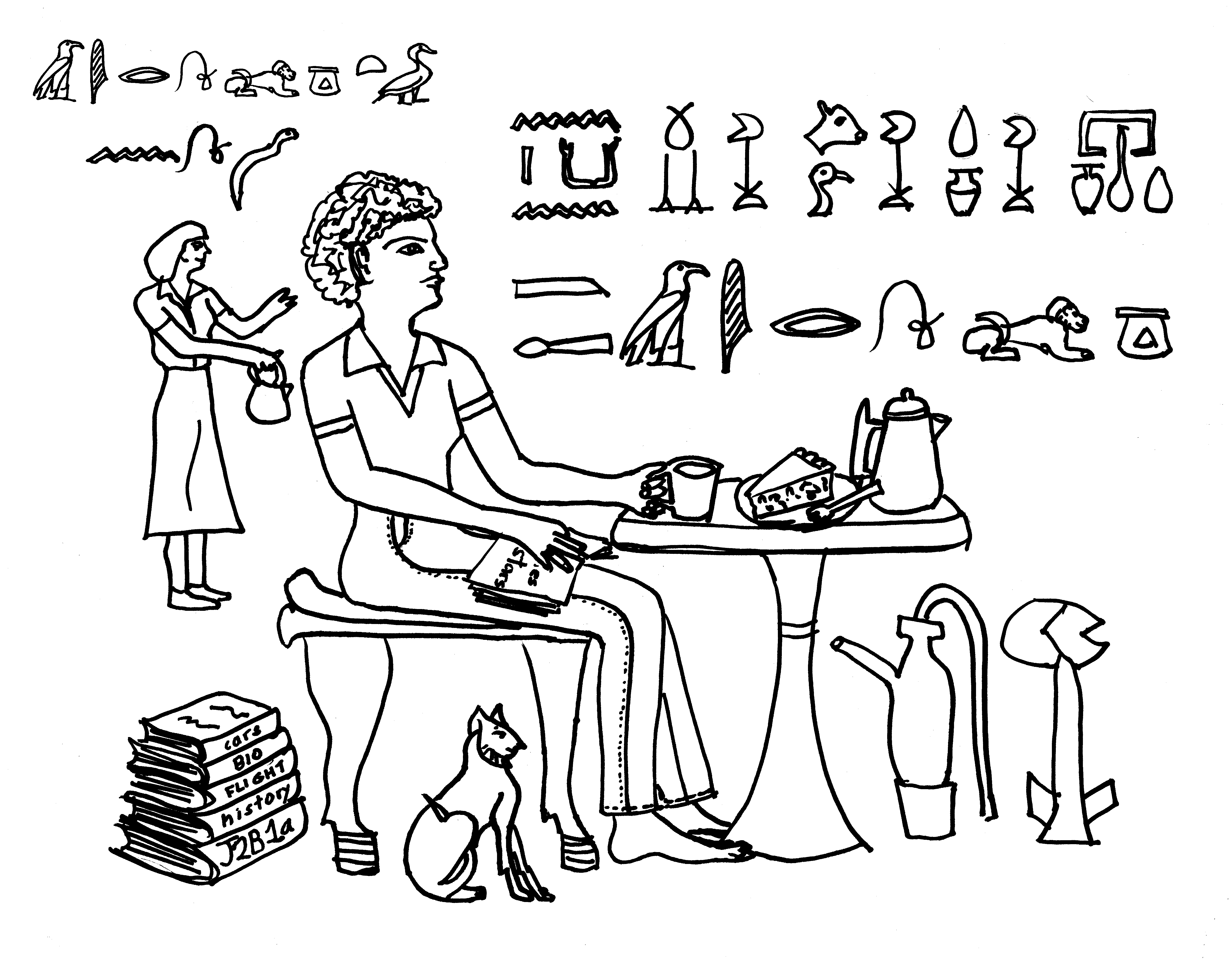 | The digital version of the colored print-out has had even more digital alterations. I realized the water canteen and the "1000 of" glyphs were facing the wrong way. Although I'd taken note of which came first, I failed to realize the glyphs needed flipped. Now the "1000 of" matches the others, and the canteen's handle is facing towards my mother, as is the coffee pot's handle. (Also, now that I'm studying the Collier hieroglyph book, I realize the glyph in "a voice offering" is the same as the glyph in the "justified" or "true of voice" phrase. So I edited that part, too. :) ) |