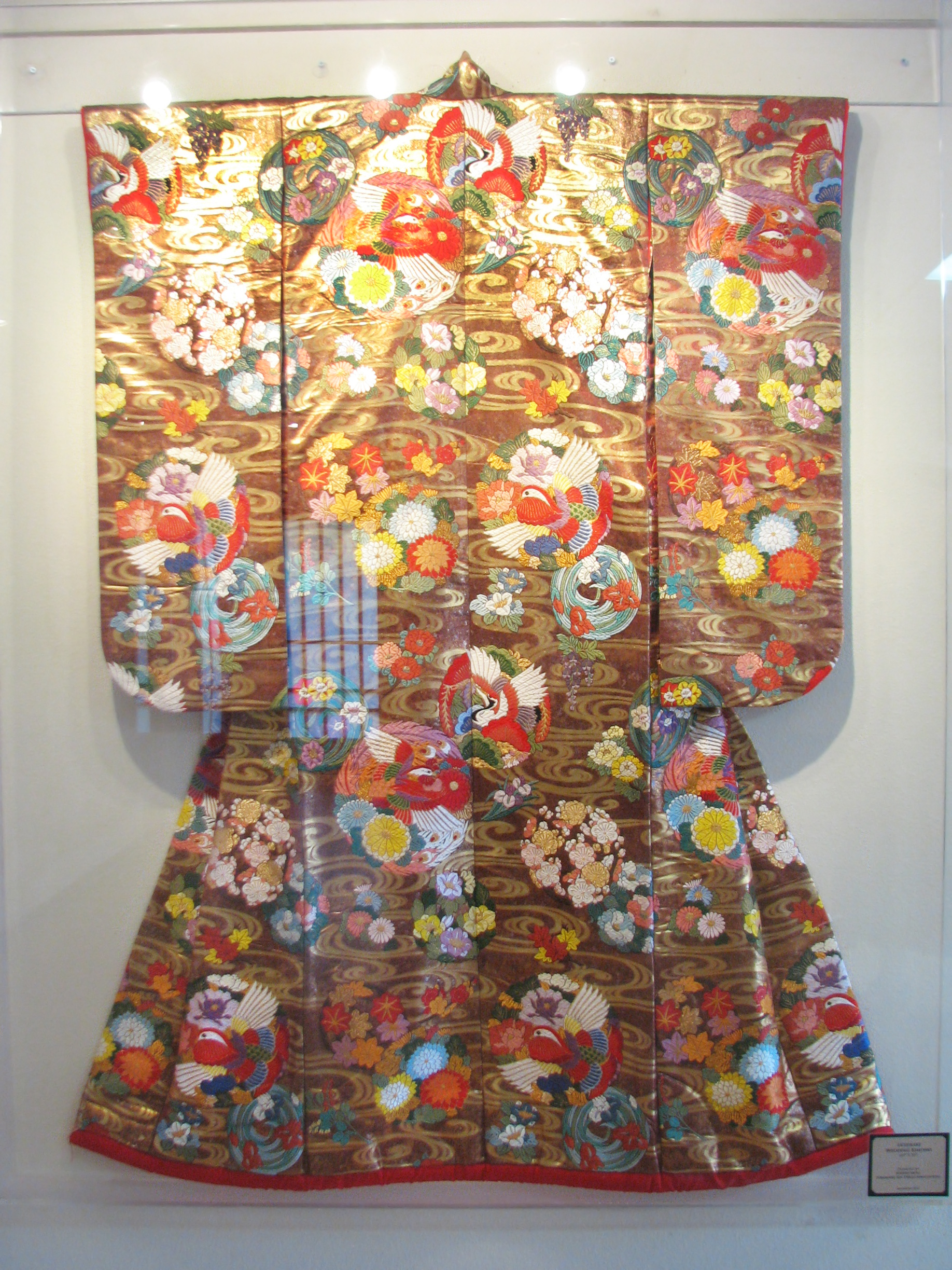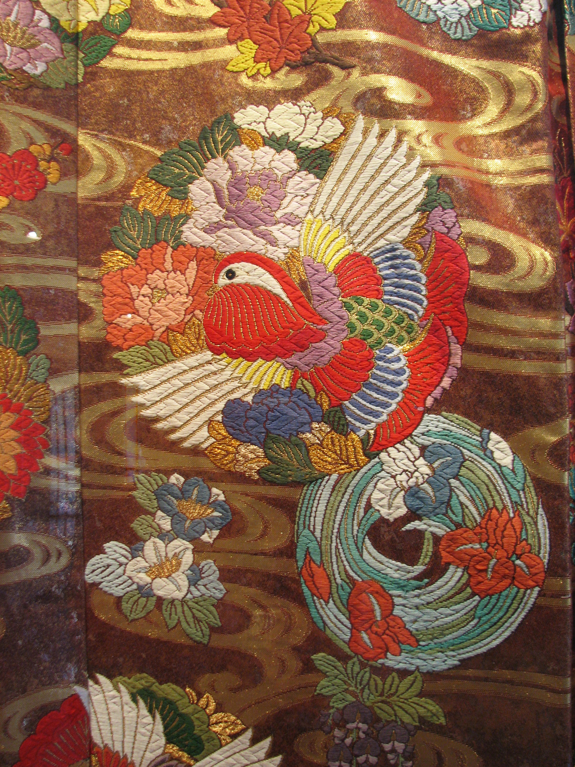 ![]() I fouled the info card: ![]() I understand the fabric in the "Wedding" kimonos seen in a small house in the Japanese garden after watching a movie on the textile arts at the Mingei. The weaving machines have undergone some evolutions through out the ages. Before the 'jacquard' looms, which were controlled by a series of cards with holes punched, one person couldn't run a loom by themselves. Now, the looms are computer-programmed and the weavers have a different routine to controlling them.
