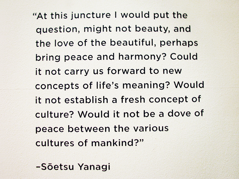Quote posted on the wall at Mingei Museum, from _The Unknown Craftsman_ Loud sprinklers woke me up early. But I understand the sprinklers are necessary. All the beautiful rose bushes on the grounds here need watering. It is beautiful, and Julia and I are lucky to have a room in the garden area, rather than in the towers.