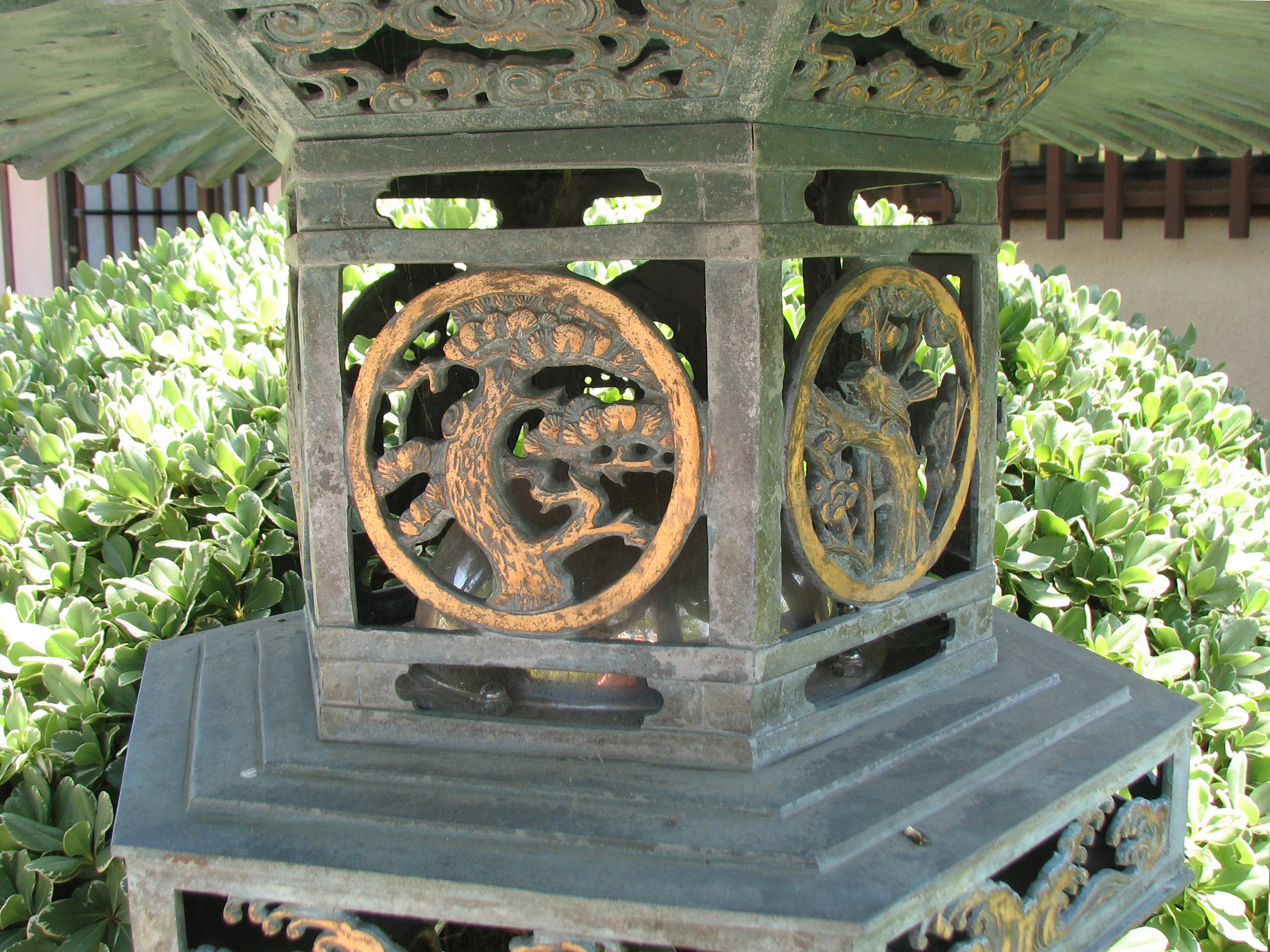 Kitsune is the Japanese word for 'fox'. "Foxes and human beings lived close together in ancient Japan; this companionship gave rise to legends about the creatures. Kitsune have become closely associated with Inari, a Shinto kami or spirit, and serve as its messengers. This role has reinforced the fox's supernatural significance. The more tails a kitsune has—they may have as many as nine—the older, wiser, and more powerful it is. Because of their potential power and influence, some people make offerings to them as to a deity." (Source: Wikipedia) "In the Shinto tradition, foxes are wily spirit messengers. One [of these statues] holds in its mouth a lock, and the other has a 'wish-fulfilling gem'. Those who approach the shrine and entrust a message for the deity [Inari] must do so with humility and make prayerful requests and supplications that it indeed be delivered." (From info card) Going back outside, now to the beautiful Japanese gardens, a lantern caught my eye: