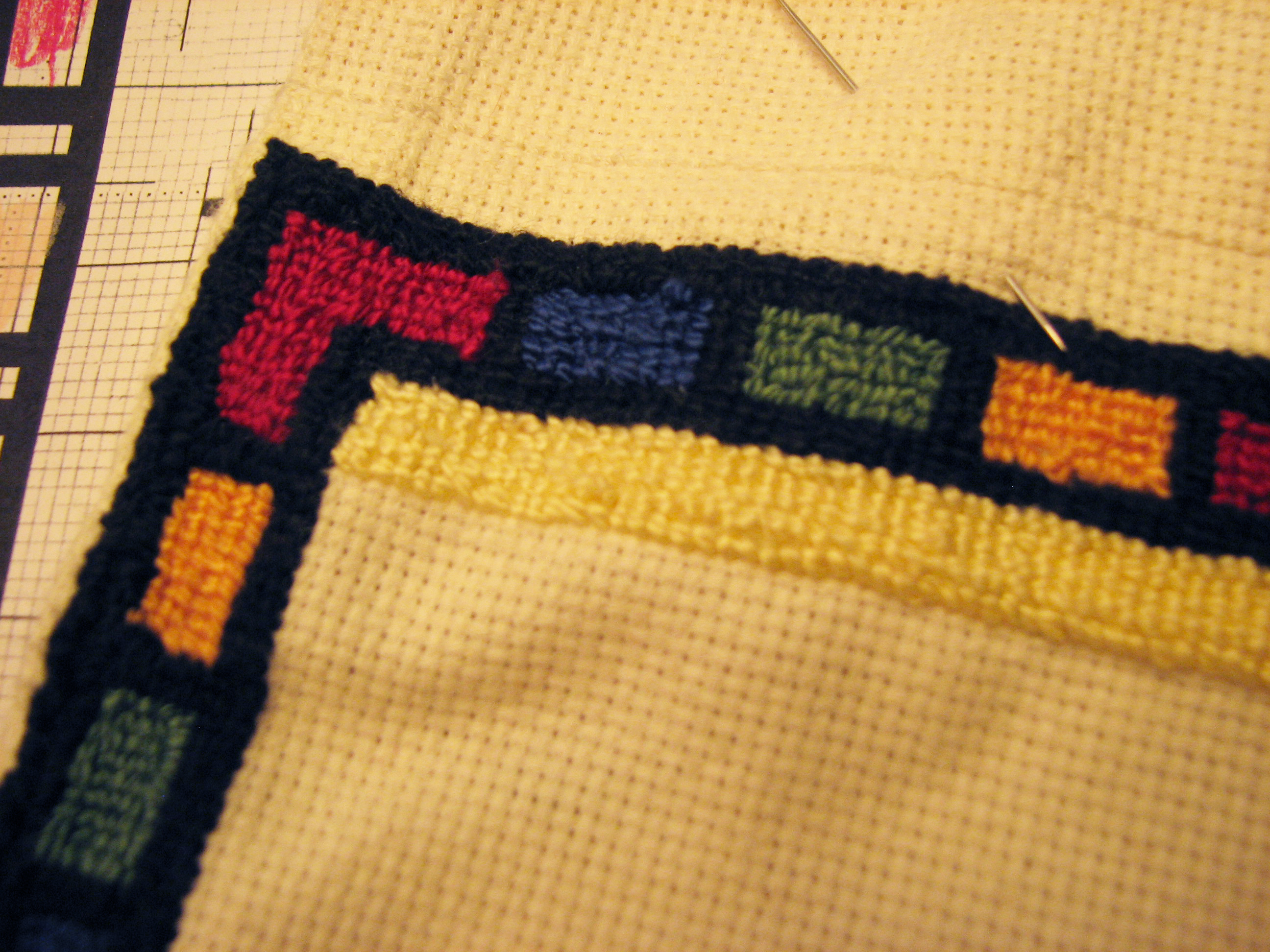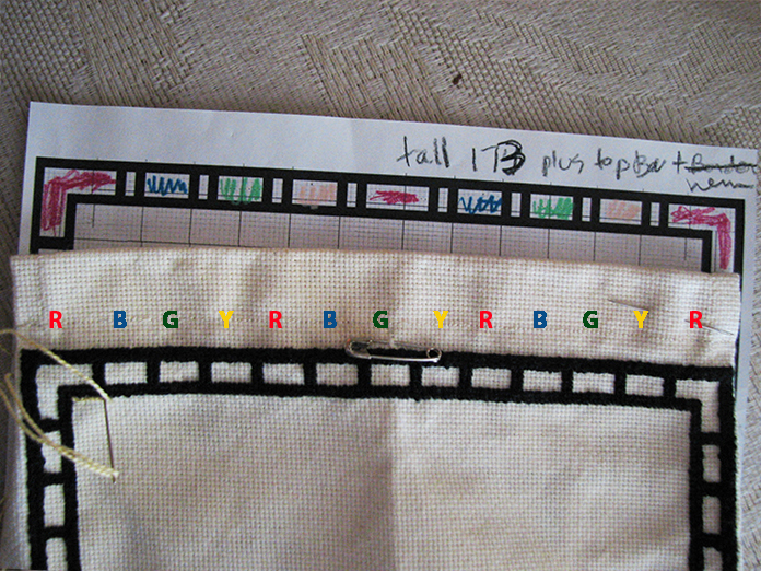 I had quite a bit of the black for the border done, before I realized I hadn't followed my own design. I despaired of ripping the stitches out, for some of them were done in full cross before I realized half cross fit much better. Miracle of miracles somehow the "Red-Blue-Green-Yellow-Red..." flow was still perfect: