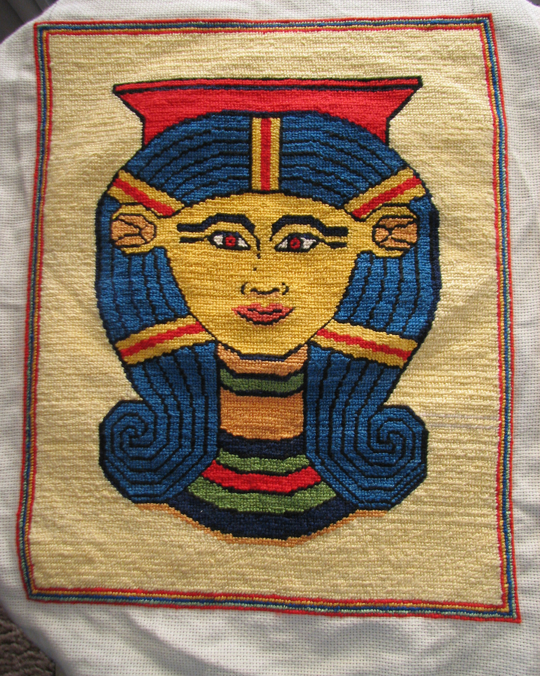 From starting last November, here's my needlepoint of Hathor. I have to even up the edges and hem them, but other that that, the yarn part is done! Actually, the origins of this piece begin with my studies of the Hathor capitols at Bubastis