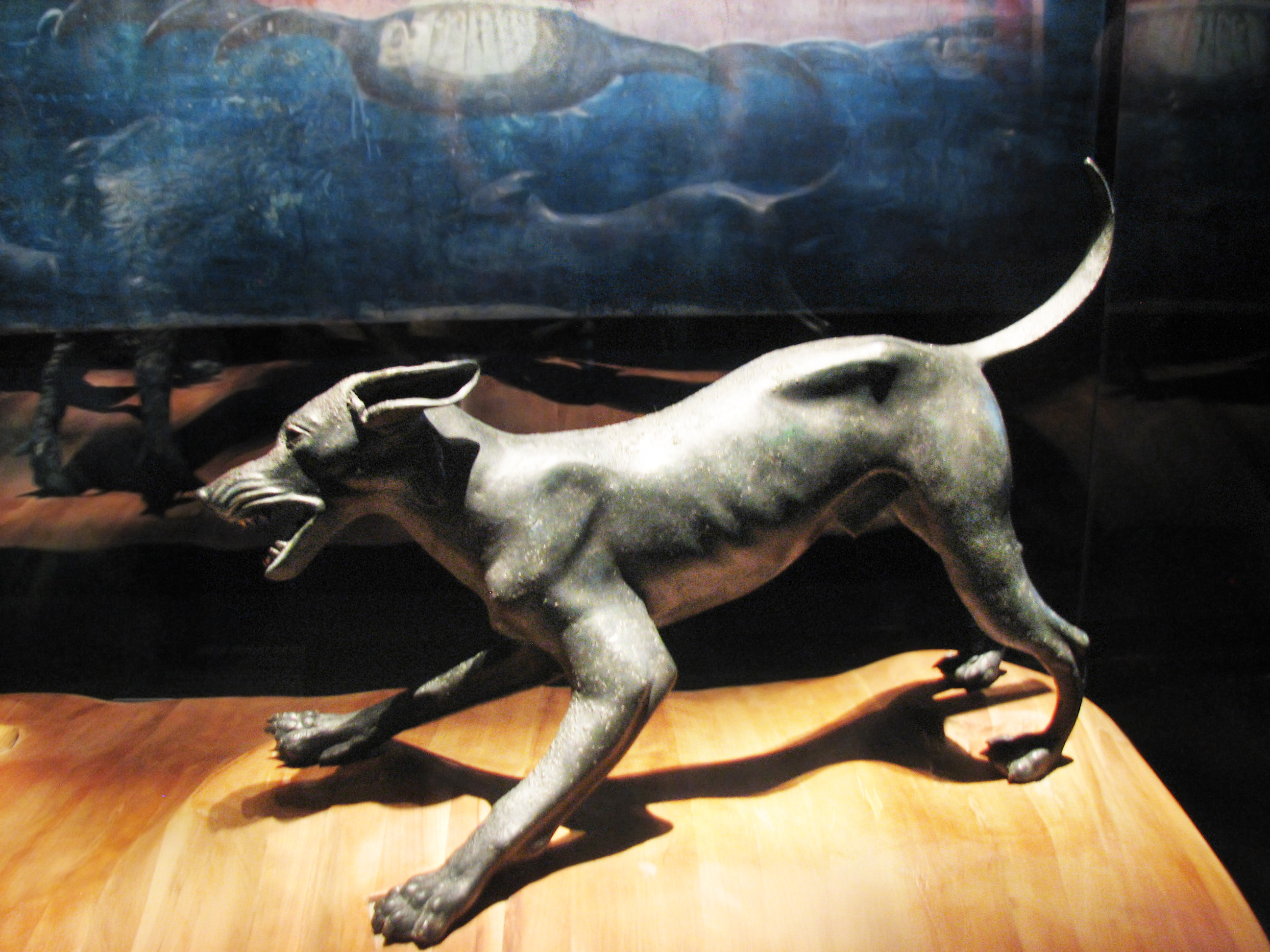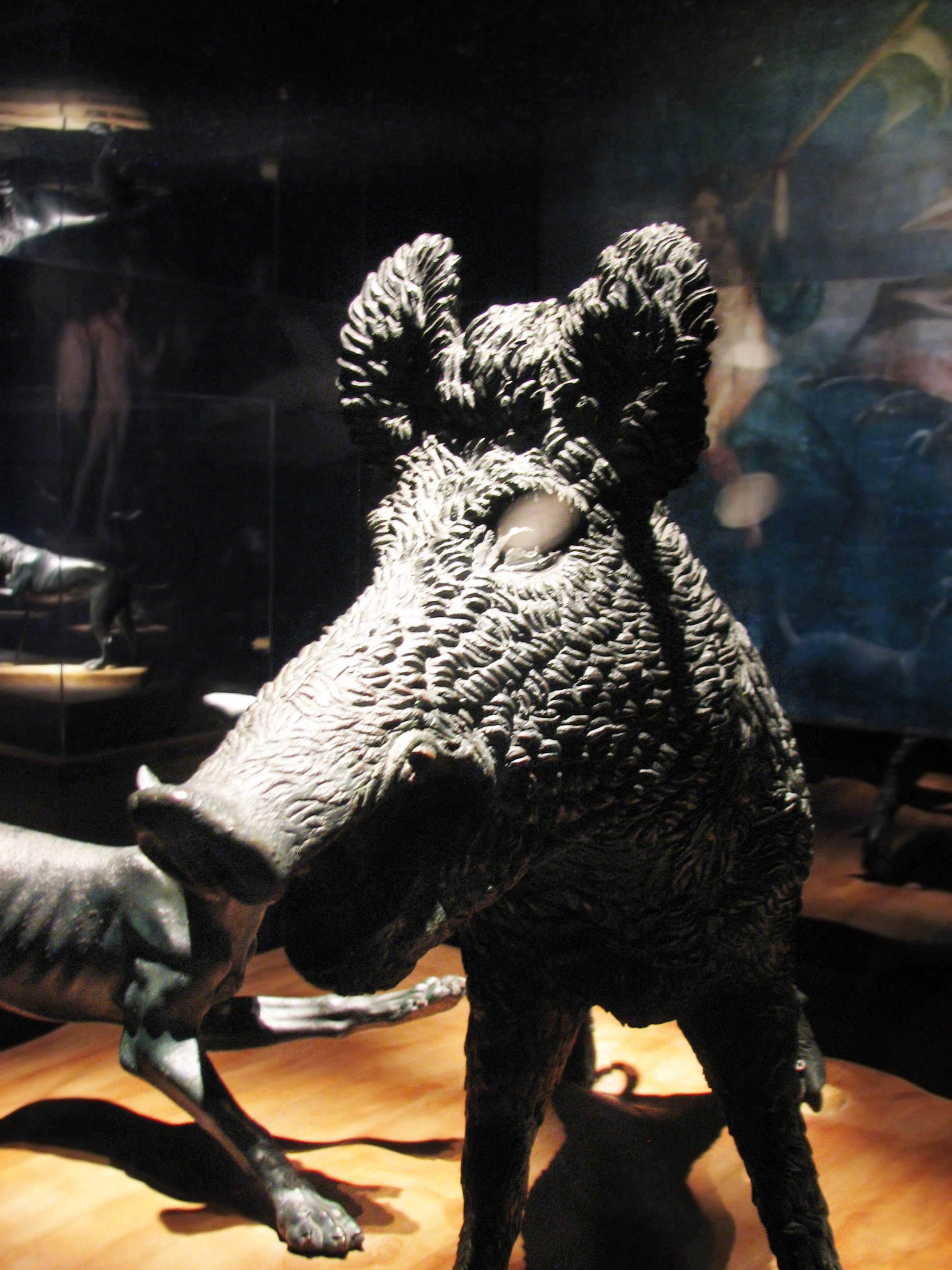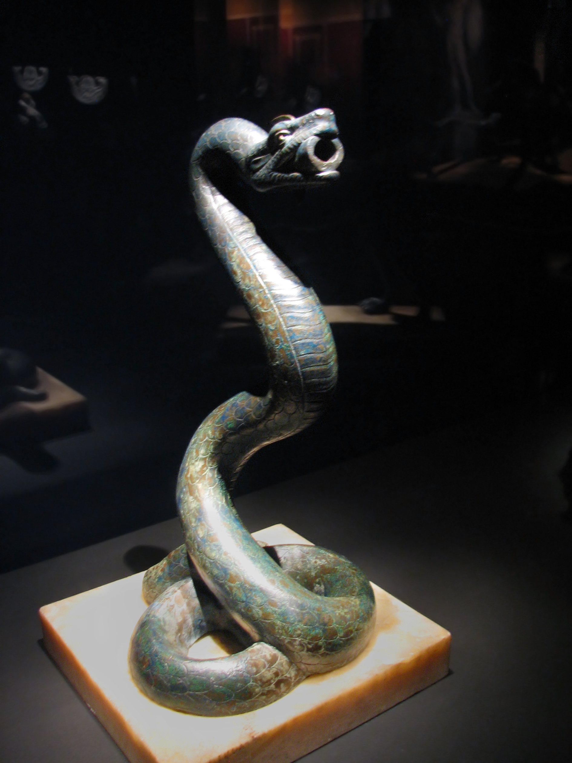 This piece is both decorative and functional. (From the info card): "Ready to attack, this bronze viper was found at the center of the peristyle garden at the House of the Citharist. Water sprayed from the serpent's mouth to supply the fountain."
