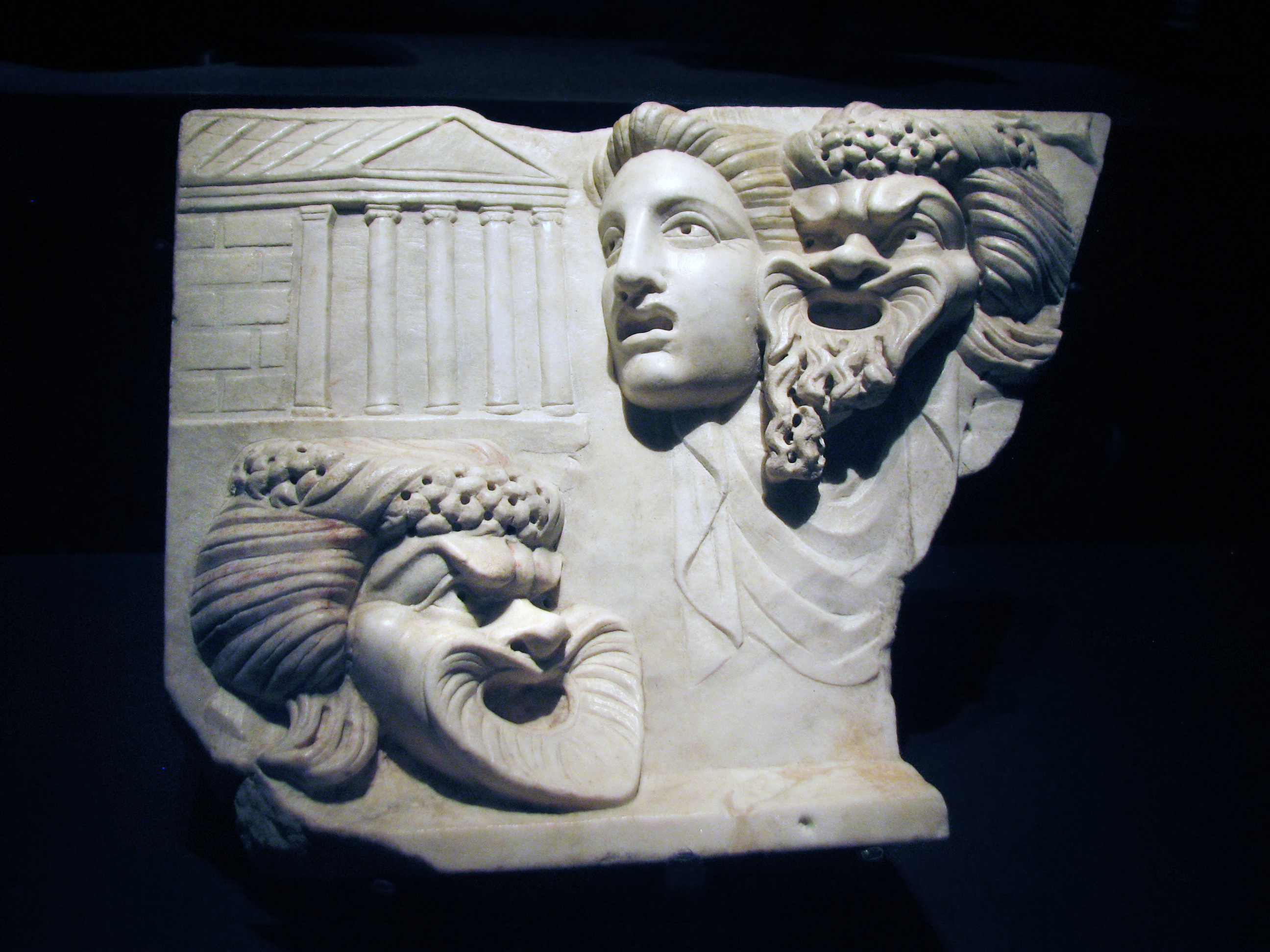(From the info card): "This marble ornament featuring typical masks worn by actors may have adorned a garden. On one side, there are stock characters from comic plays: a bearded slave, the long-bearded old man, and the youthful son. Two characters from tragic plays appear on the other side. Masks were used to help actors get into their roles and to enhance the sound of their voices."