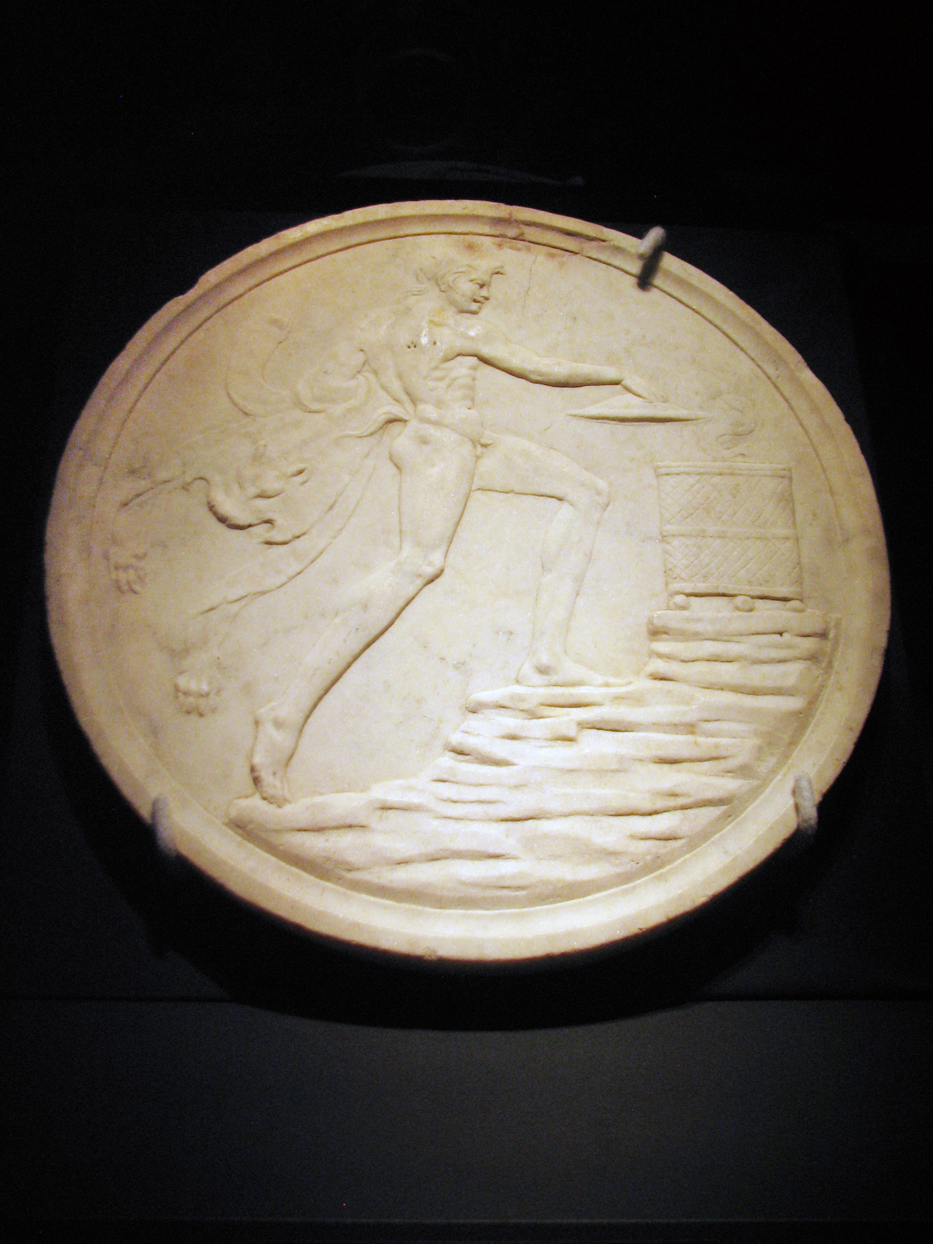 (From the info card): "The reliefs carved on oscilla are typically Roman scenes of Bacchus (god of wine) or theaterical themes. This circular oscillium has a relief carving of a naked satyr on both sides."